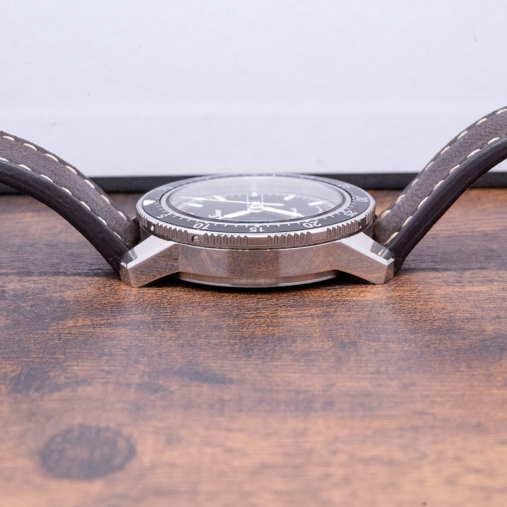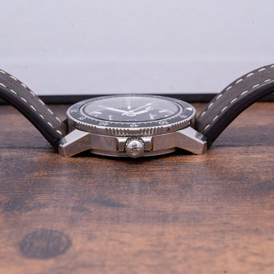 Here we have a 2023 Sinn 104 ST SA which has become the signature watch for Sinn, its polished 40mm stainless steel case has a very comfortable lug-to-lug length of 47.5mm and a case thickness of 11.5mm. A screw-down crown sits on the right side protected by shoulders, and a bi-directional Pilots bezel with a black aluminium 60-minute countdown insert. Sapphire crystal AR coated on both sides protects a black dial, an outer minute track precisely executed with hourly baton markers coated in Super LumiNova clearly indicates the hours and a day-date window sits at 3 o’clock. Syringe hands with Super-LumiNova lume infill complemented by an arrow point sweeping second hand, and at 12 o’clock we have the Sinn motif with “Automatic'' printed at 6 o’clock to complete this highly legible pilot's watch. On the back, we have a screw-down exhibition case back, inside an automatic Sellita SW-220-1, 26 jewels, and 28,800 beats per hour. The watch comes fitted on a Sinn 20mm vintage style leather strap with a signed buckle and the watch comes with its Sinn presentation box, swing tag, spring bar removal tool and paperwork.