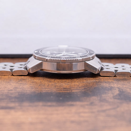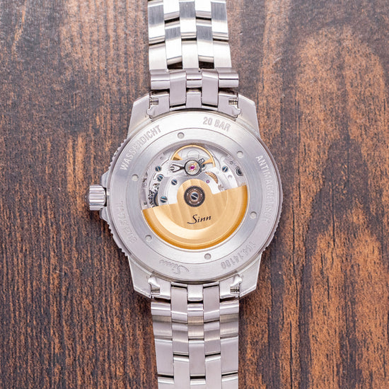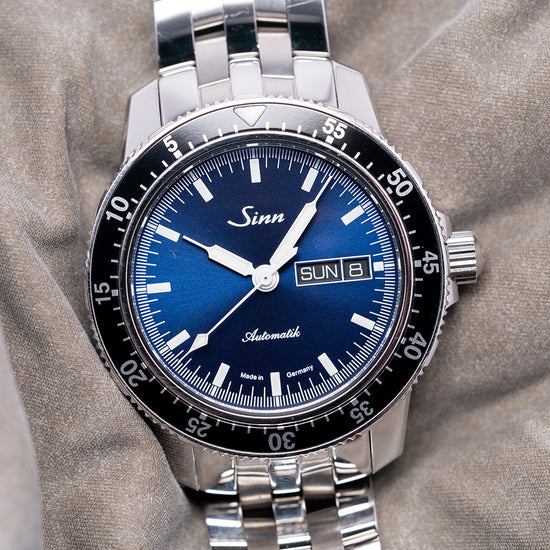 Here we have a 2023 Sinn 104 St Sa I B Blue 41mm Automatic, which has become Sinn's signature watch. Its polished 41mm stainless steel case sits on your wrist, with thick, chamfered, flat-ended lugs. Its curved flanks lead to a very comfortable lug-to-lug length of 47mm and a case thickness of 11.5mm. A screw-down crown sits on the right side, protected by shoulders, and a bi-directional Pilots' bezel with a black aluminium 60-minute countdown insert. Sapphire crystal, AR-coated on both sides, protects a sunburst blue dial, an outer minute track precisely executed with black outlined hourly baton markers filled with Super LumiNova, and a day-date window at 3 o’clock. Syringe hands with Super-LumiNova fill are complemented by a red arrow pointed sweeping second hand. At 12 noon, the Sinn motif with “Automatic” printed at 6 o’clock completes this highly legible pilot's watch. On the back, we have a screw-down exhibition case back, inside an automatic Sellita Cal. SW-220-1, 26 jewels, and 28,800 beats per hour. It comes paired with its Sinn 20mm 5-link bracelet, all links included. This watch is sold with its Sinn presentation box and paperwork.