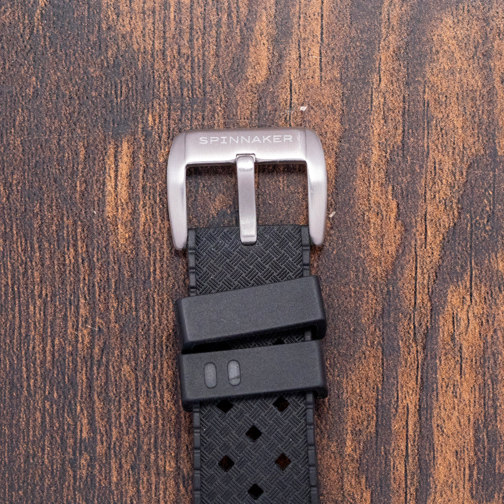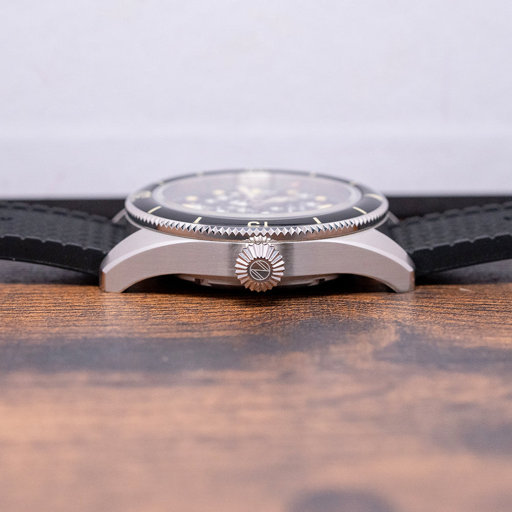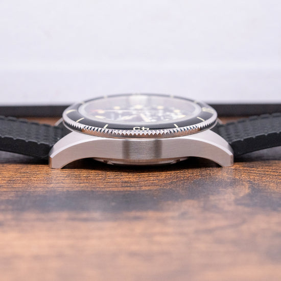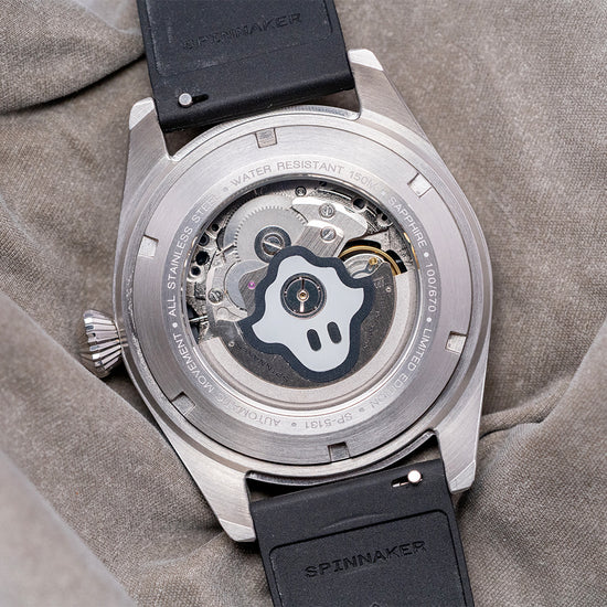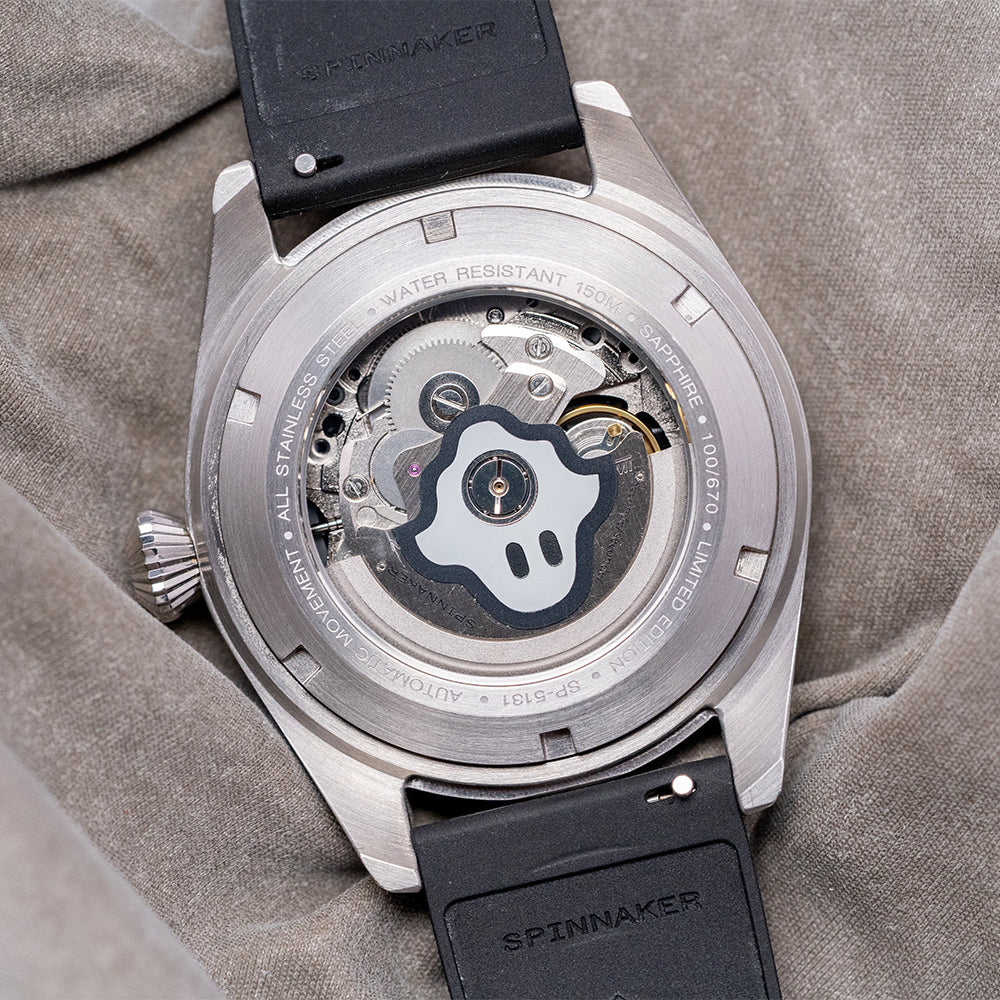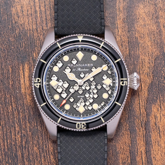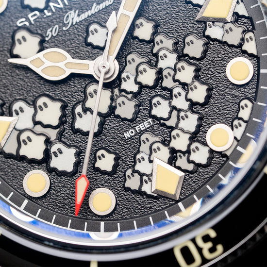 Here we have a fun 2023 Spinnaker x Seconde Seconde '50 Phantoms' limited edition of 670 pieces, which is a funny nod to the Blancpain 50 Fathoms dive watch, which celebrates its 70th Anniversary, designed by Seconde Seconde, which is the artistic pseudonym of French artist Romaric André, who is known for his playful and humorous modifications of classic timepieces. The 42mm brushed stainless steel curves over your wrist with tapered lugs. A polished chamfered edge leads the eye towards a lug-to-lug length of 51mm and a case thickness of 12.5mm, giving the watch an impressive wrist presence. On the right side, an onion-style crown. A unidirectional bezel features deep knurling for grip and a black insert with a lumed 60-minute scale protected by glass. The domed sapphire crystal sits above a textured black dial filled with randomly placed ‘50 Phantoms’ coated in Super-LumiNova. An outer minute track surrounds the applied diamond, and disc-shaped indexes filled with Super-LumiNova mark the hours. Cathedral hands are filled with the same lume, complemented by a red arrow-tipped sweeping second hand. At noon, we have the Spinnaker motif and ‘50 Phantoms’ in the same font as the Blancpain, at 6 o’clock, ‘No Feet’, where the depth resistance would typically go, is a fun reference to the fact ghosts have no feet. On the reverse, a screw-down exhibition case back is engraved with the details of the watch around its edge. Inside an automatic Seiko Cal. NH38, 24 jewels, beating at 21,600 beats per hour, the modified rotor has a phantom on it. This workhorse movement features hand-winding and hacking seconds for your convenience. It comes paired with two 22mm Spinnaker straps in the box. This watch is sold with its original Spinnaker x Seconde Seconde box and paperwork.