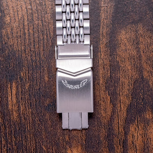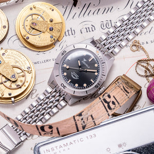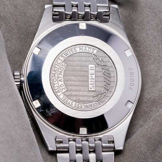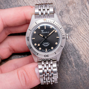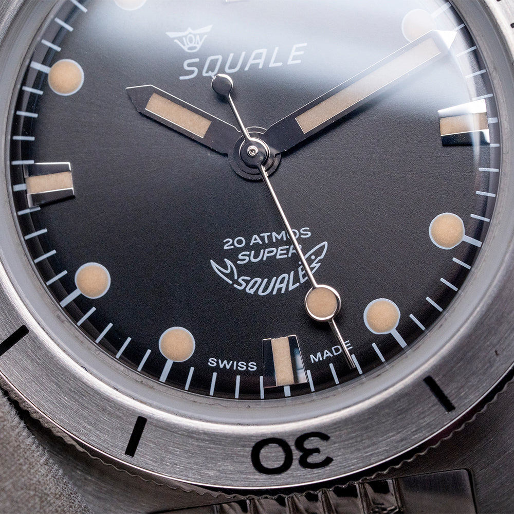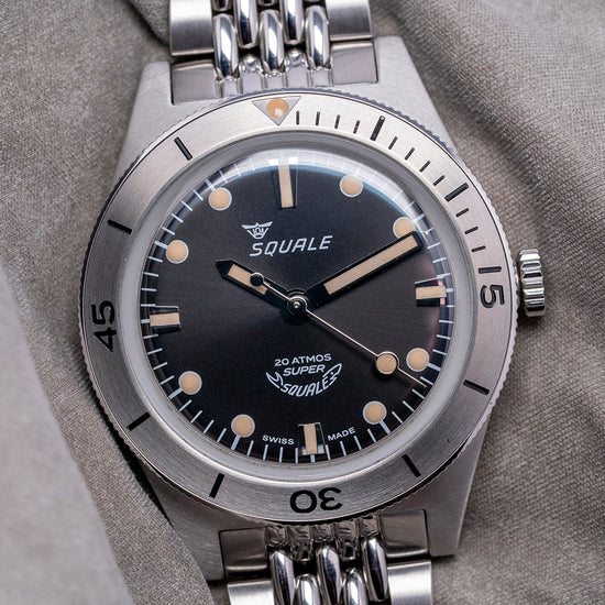 Here we have a 2023 Squale Super-Squale Sunray Black on a Bracelet. This is a recreation of the Charles Von Büren-designed "Super Squale" of the 1960s, whose trademark was registered in 1959. At the same time, he registered the Squale brand name, which quickly became one of their most popular watches. The 38mm brushed stainless steel case has thick straight-ended lugs with a 45mm lug-to-lug and a 12mm case thickness, ensuring a comfortable fit on your wrist; on the right side, a signed screw-down crown with deep knurling for extra grip. A Unidirectional steel bezel has a deeply engraved dive insert, and the numerals and markings are painted in black with the characteristic lume pip at 12, holding a double domed sapphire crystal AR coated above a striking sunray black dial. Applied trapezoid and lumed disc indexes mark the hours coated in old Radium SuperLumiNova for that vintage aesthetic. Steel sword hands filled with old Radium SuperLumiNova complemented by a lollipop counterweighted sweeping secondhand. At 12 o'clock we have the Squale motif printed with "20 Atmos" Super and a smiley Squale underneath at 6 o'clock complete this vintage-inspired recreation of their classic dive watch. On the reverse a screw-down case back with the model details engraved into it. Inside an Automatic SELLITA SW 200-1 ELABORÉ 26 Jewels beating at 28,800 Beats per hour. It comes paired with its original Squale 18mm polished and brushed stainless steel “beads of rice” bracelet with a signed folding flip-lock clasp; all links are provided. The watch comes with its Squale presentation box, travel pouch and paperwork.