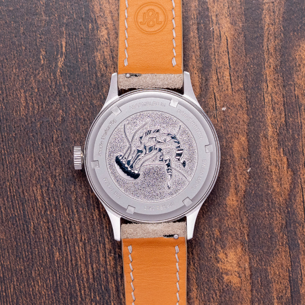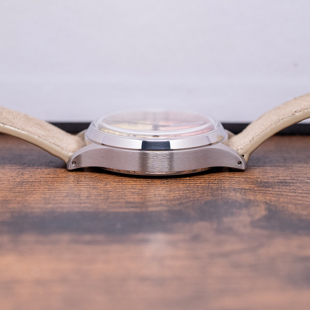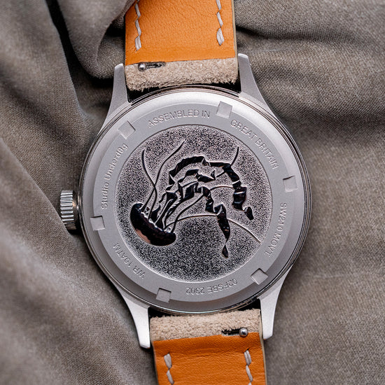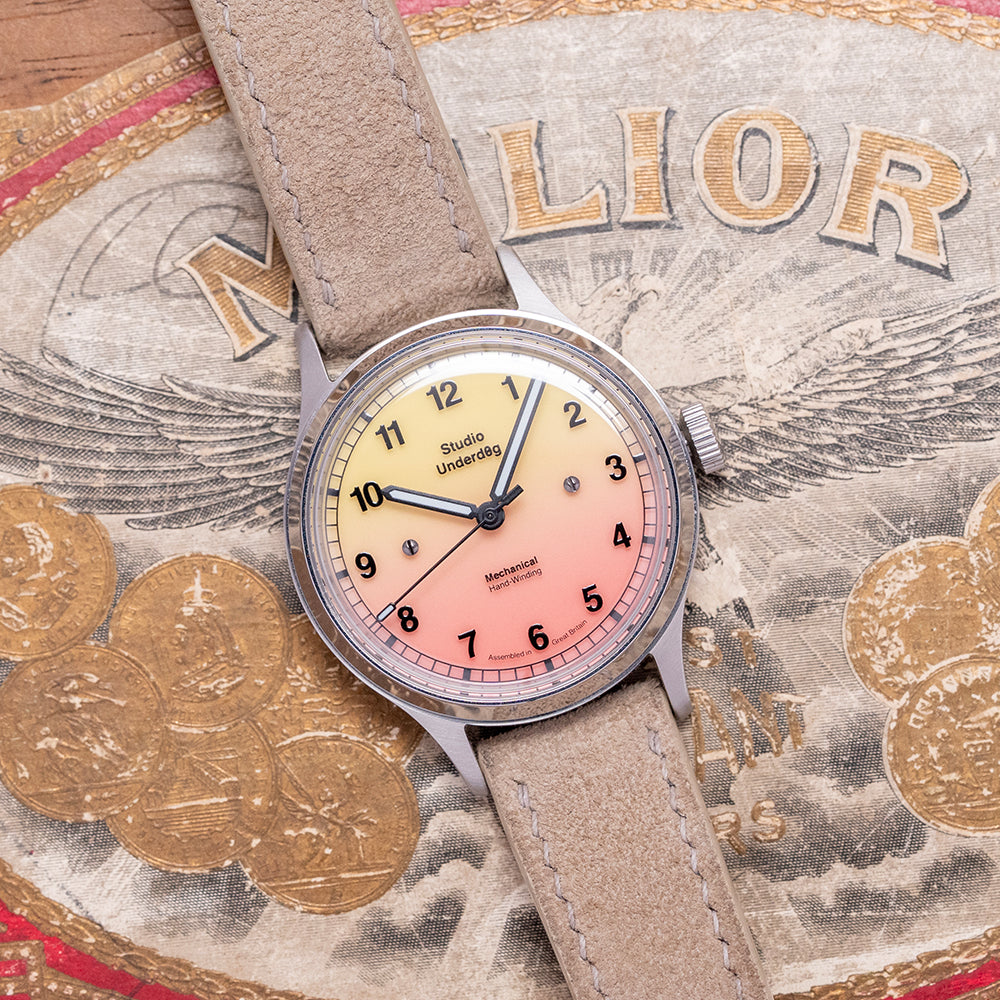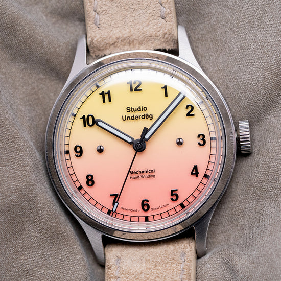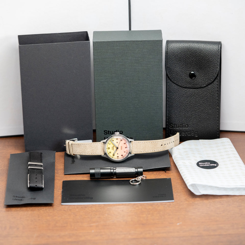 Here we have a 2023 Studio Underd0g 02SERIES Pink Lem0nade featuring a brushed 37mm stainless steel case that gently curves over your wrist with tapered drilled lugs and a lug-to-lug length of 46mm and a case thickness of 12mm, ensuring a comfortable fit. On the right side is a signed crown. A smooth, polished bezel holds a domed sapphire crystal above a superbly crafted full-lume Pink Lem0nade sandwich dial; the transparent 1mm sapphire disc sits above the brass plate, which has seven layers of custom-made Super-LumiNova pigment secured by two screws, the sapphire disc features an outer minute rail track surrounding Arabic numerals marking the hours, giving the impression they are floating above the dynamic dial and creating a shadow on the base layer. Slender baton hands filled with Super-LumiNova are complemented by a tapered sweeping second hand; at noon, we have the Studio Underd0g motif, and at 6 o’clock, “Mechanical Hand Winding" completes this stunning field watch. On the reverse, there is a screw-down case back with the watch details around its edge and an embossed jellyfish in the centre, housing a manually wound Sellita SW210, 19 jewels, beating at 28,800 beats per hour. It comes paired with a quick-release 18mm suede strap handmade by The Strap Tailor, a signed pin buckle, and an 18mm NATO strap. This watch is sold with its original Studio Underd0g box, UV torch, and paperwork.