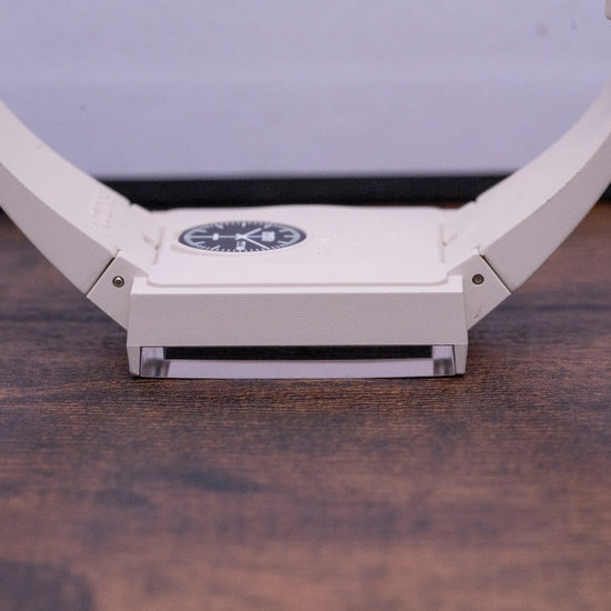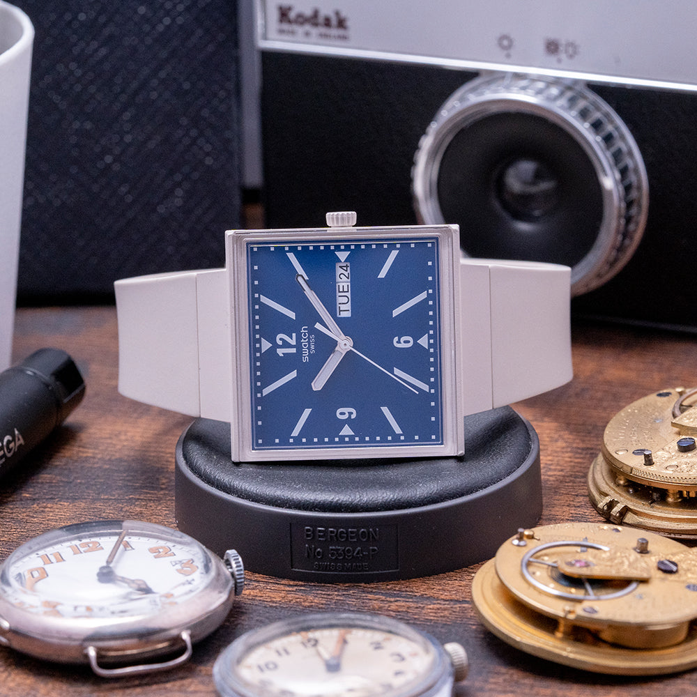 Here we have a 2023 Swatch What If... Beige with a distinctive 33mm square Beige coloured Bioceramic case that sits flat on your wrist with stubby drilled lugs. Swatch is proud of its durable case structure, combining ceramic powder and bio-sourced materials. A contemporary and characteristically playful design, a first for Swatch who usually uses a circular case design. Back in 1982, Swatch played with many prototypes in circular and square forms, deciding on the round design they called “Gent” and four decades on we return to their beginnings. The lug-to-lug length of 41.5mm and case thickness of 10.5mm ensure a comfortable fit. On the right side is a push/pull crown, an edge-to-edge Bio-sourced glass crystal is an open window to the matte blue dial. An outer minute track surrounds Arabic 12, 6 and 9 and baton indexes are placed in such a way as to direct your eye towards the centre, marking the hours, at 3 o’clock a day/date window, slender baton hands filled with lume are complemented by a tapered second hand, at 12 o’clock we have the Swatch motif completing this striking watch. On the reverse, we have a round battery hatch with a reflection of the dials that inspired this watch printed on it. Inside a Swiss Quartz movement. The watch comes paired with its integrated beige bio-soured 21mm Swatch strap with a signed Bioceramic pin buckle. The watch comes with its Swatch presentation box and papers.