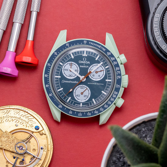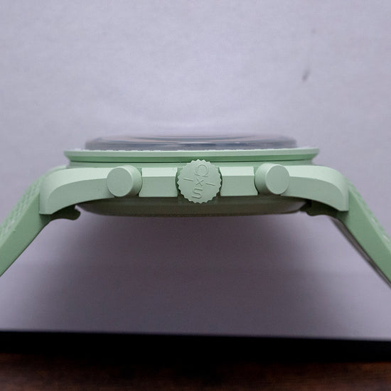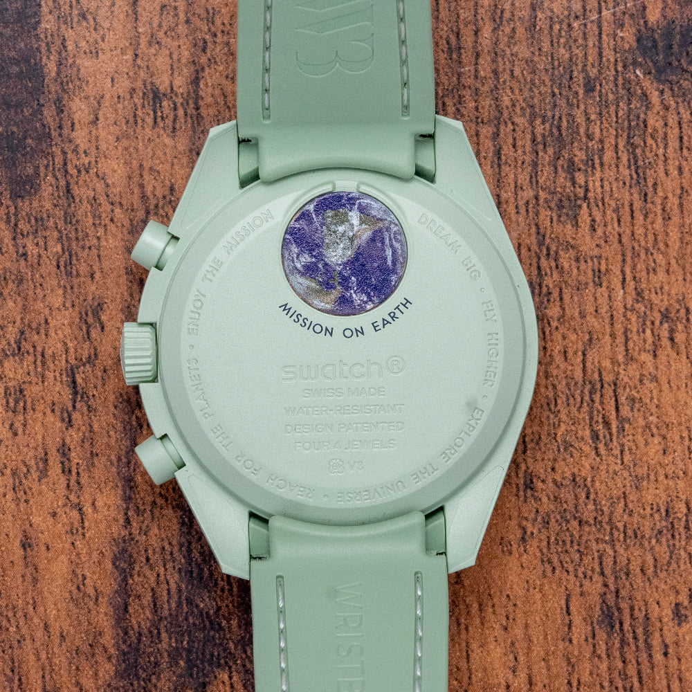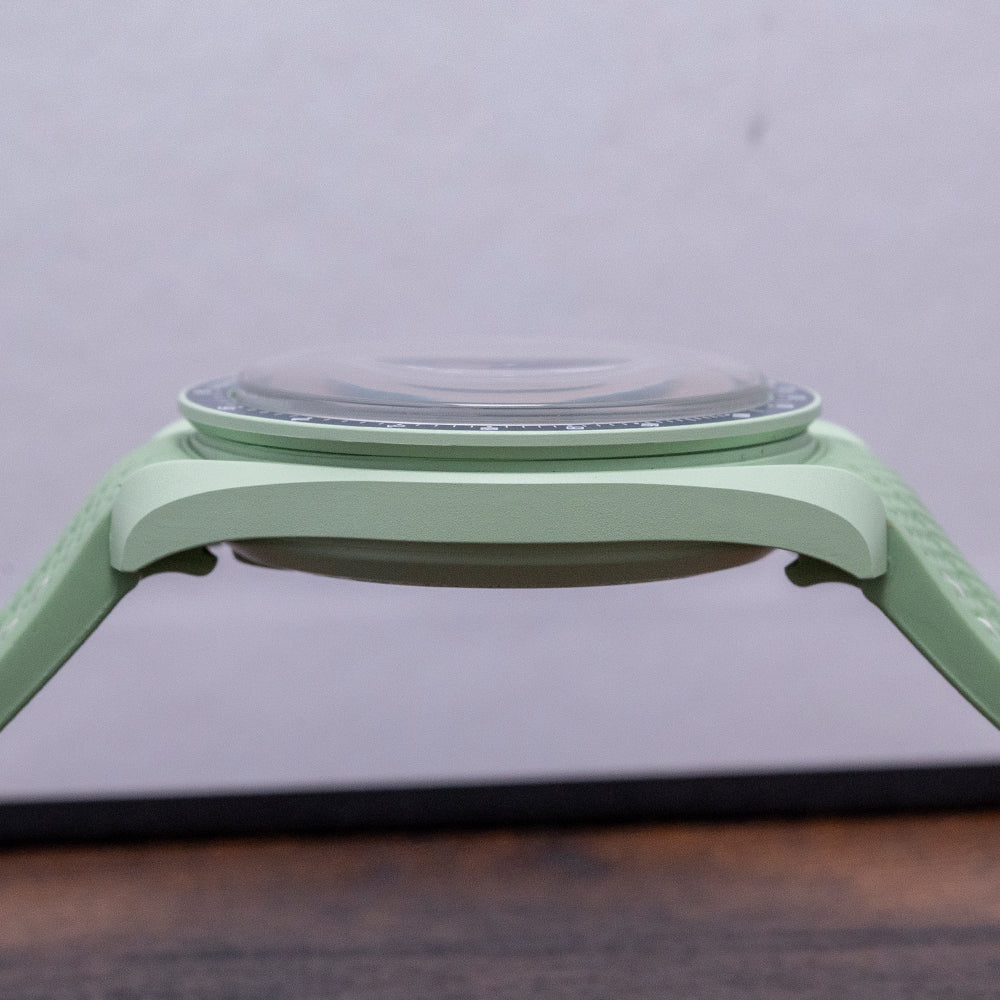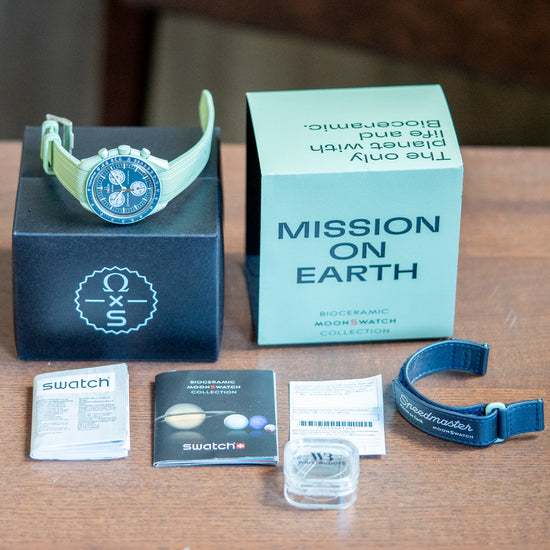 Here we have a 2023 Swatch x Omega Moonswatch Mission to Earth, part of the Bioceramic MoonSwatch collection of 11 planets found in our solar system. This is the first Omega and Swatch collaboration, incorporating the best elements of the Speedmaster and the modern materials used by Swatch, launched on the 26th of March 2022 to huge fanfare where we saw massive crowds trying to buy the first batch at only a few Swatch boutiques around the world. The 42mm pale green BioCeramic case curves over your wrist with the characteristic Omega twisted lugs. Bioceramic is made of a composition of ceramic and bio-sourced material that is found in castor-plant oil. A lug-to-lug length of 47mm and a case thickness of 13mm ensures a comfortable fit. Down the right side, we have the recessed piston chronograph pushers and a signed push/pull crown in the centre. The fixed bezel has a blue Tachymeter scale with the ubiquitous Dot above the 90 holding a domed crystal with the hidden “S” in the centre, just like the original Speedmaster, above a blue dial. An outer minute track is precisely executed with SuperLumiNova coated baton indexes marking the hours; at 3 o’clock, a 10-hour register; at 6 o’clock, a continuous seconds register; and finally, at 9 o’clock, a 60-minute register, each white register is slightly recessed with a rich brown hand. Slender sword hands infilled with SuperLumiNova are complemented by a rich brown tapered chronograph hand, at 12 o’clock we have the Omega x Swatch motif and at 9 o’clock “Speedmaster” completes this dynamic celestial-inspired collaboration chronograph. On the reverse, we have the details of the watch pressed into the BioCeramic and an Earth-covered hatch for the battery. The watch comes paired with its 20mm Wristbuddys pale green fitted rubber strap and its original blue coloured 20mm Swatch x Omega Velcro strap. This watch is sold with its original Swatch x Omega Saturn box and paperwork.