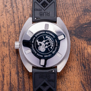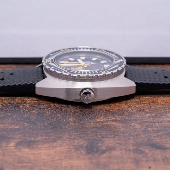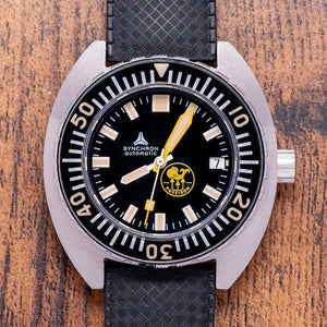 Here we have a 2022 Synchron Poseidon Ice Diver Limited Edition of #732/1000 pieces, building on the success of their faithful reissue homage to the original DOXA Army reference 11891-4 of the 1970s, a very rare watch, they incorporate vintage styling with modern materials and using CNC Technology to create the case. This is their third Military diver and has been designed in collaboration with Swedish dive gear manufacturer Poseidon Diving Systems, which introduced the first single hose regulator and a sealing system used in cold water diving; the 42mm brushed Tonneau-shaped stainless steel case sits on the wrist like a cushion, it is a tried and tested formula originally designed and developed by Urs Eschle who was the product manager for the original Doxa Sub and Jacques Cousteau who adopted it in his Aqualung range, with a lug-to-lug length of 45mm and a case thickness of 14mm give the watch an impressive wrist presence. On the right side, slightly recessed, is a large signed screw-down crown with deep knurling for extra grip. The unidirectional 120-click bezel has a saw-like serrated edge for grip and a 60-minute sapphire insert with “Old Radium” SuperLumiNova coated numerals, holding a domed sapphire crystal above a high glossy Black dial. A black outer minute track has thick white baton indexes filled with “Old Radium” SuperLumiNova marking the hours. At 3 o’clock, there is a date window with yellow-framed Ploprof-style hands filled with “Old Radium” SuperLumiNova complemented by a yellow square counterweighted sweeping second hand. In the upper left hand, we have a Synchron motif and “automatic” printed underneath, and in the lower right, the Poseidon lois go, completing this military-inspired dive tool watch. On the reverse, a screw-down case back with the engraved Poseidon logo in the centre and the number out of #732/1000 on the outer edge, inside an automatic La Joux-Perret G100, 28 jewels, beating at 28,800 beats per hour. This quality movement is designed and manufactured by La Joux-Perret in La Chaux-de-Fonds, Switzerland. The watch comes paired with its 20mm black Tropic rubber strap with a pin buckle, and the watch comes with a Synchron presentation tube and paperwork.