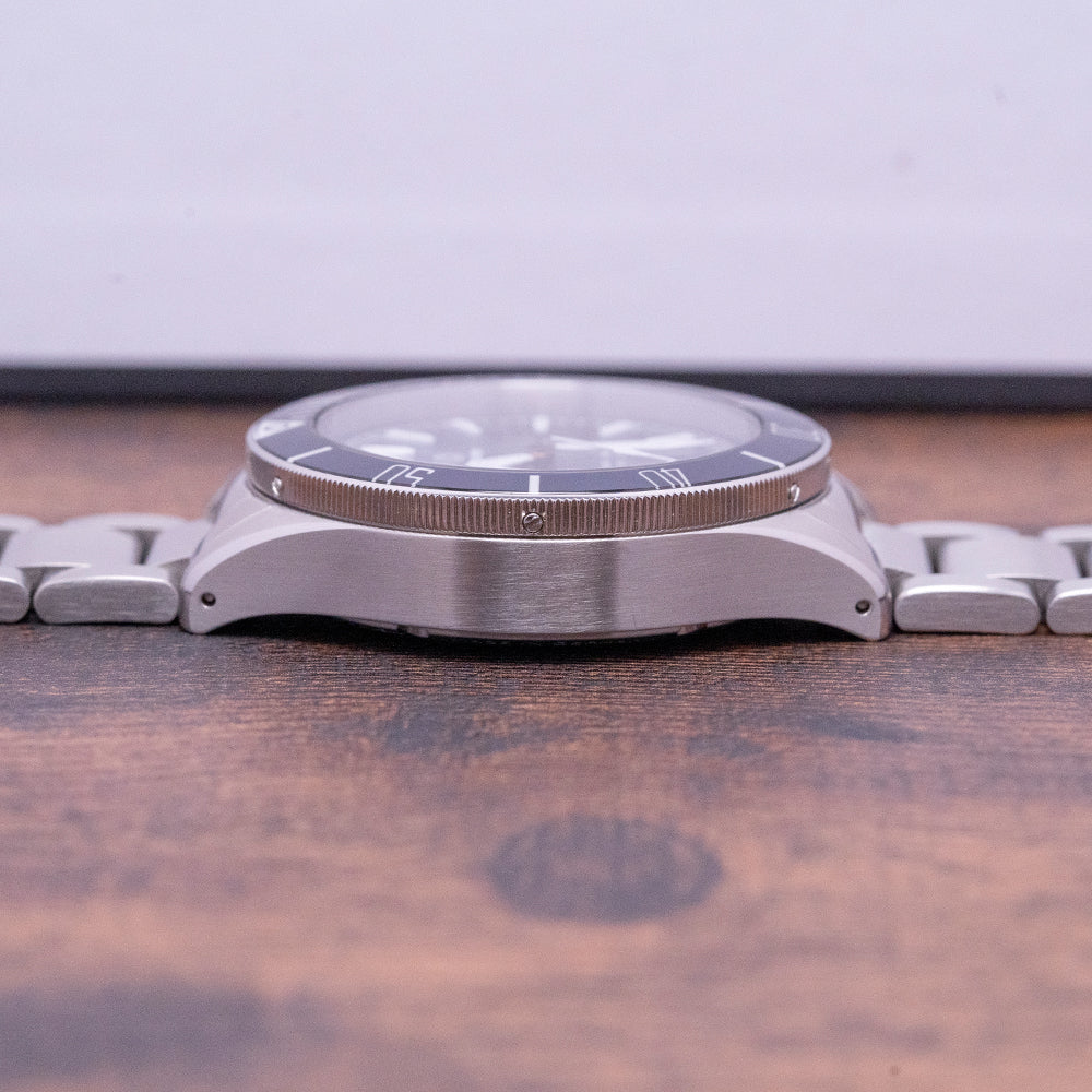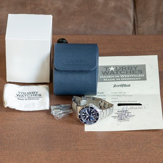 This watch is sold with its original Tourby travel case and paperwork. The watch comes paired with its original 20mm Tourby brushed stainless steel bracelet with a signed folding clasp and dive extension, all links provided. The watch is from August 2023 and is sold in worn condition, but overall very fair as you can see. The watch comes with its Manufacturer's Warranty.