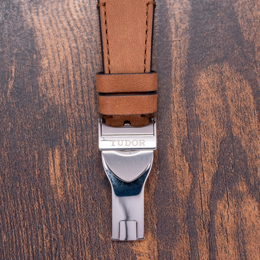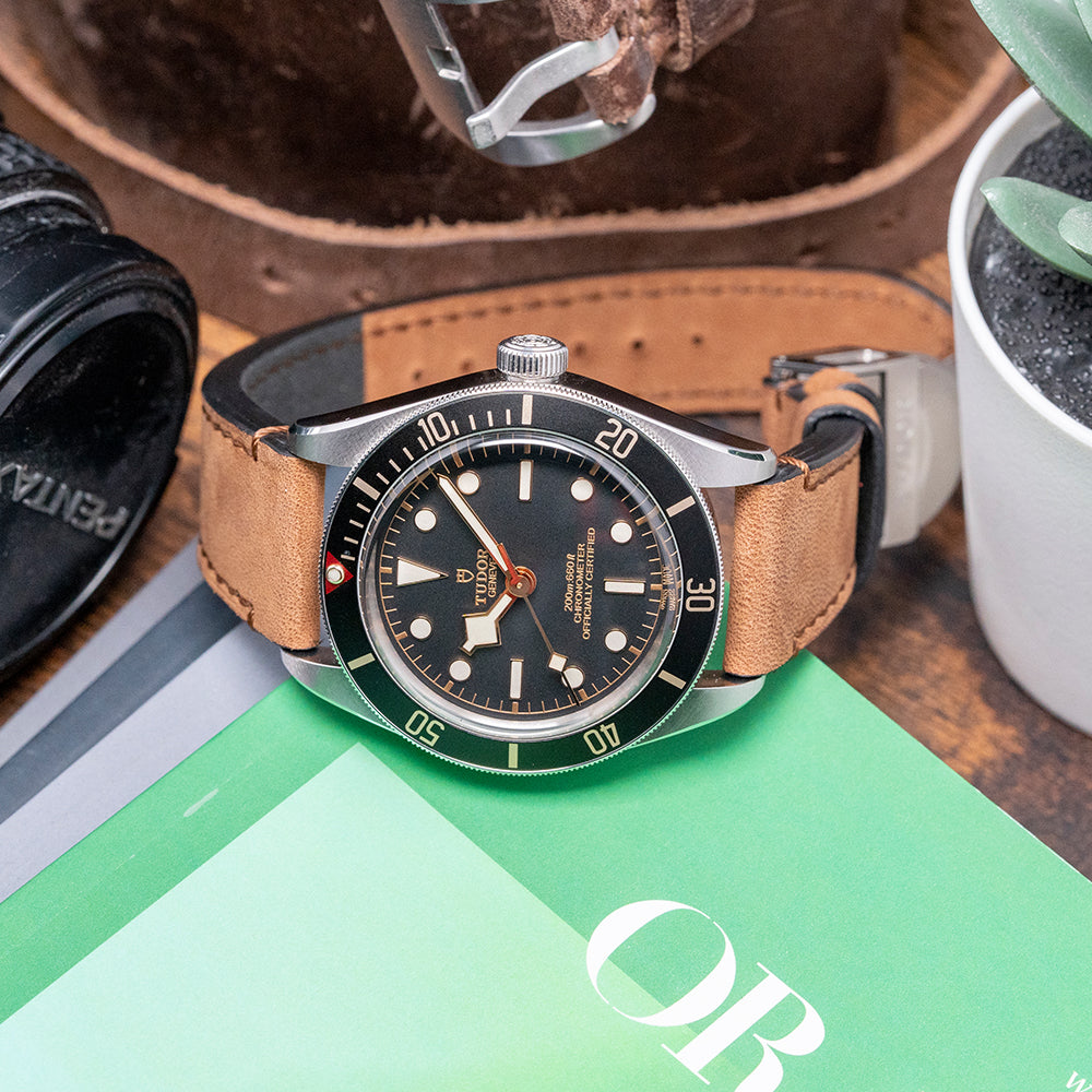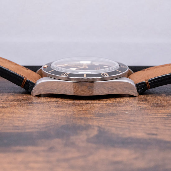 Here we have a 2023 Tudor Black Bay 58 Black on Strap 79030N that pays tribute to their first divers; introduced in 1958, the Ref 7924 had a 39mm case and a big crown that achieved 200m water resistance, which was some achievement back then. A 39mm stainless steel case with polished and satin finishes, the curve of the case tapers towards the lugs with a lug-to-lug length of 47.5mm and a case thickness of 12mm, giving the watch an impressive wrist presence. On the right side is a screw-down signed crown, unidirectional dive bezel with 60-minute numerals on a matte black aluminium insert; at 12 o’clock, we have the characteristic red inverted triangle and lume pip. Domed sapphire crystal AR coated protects a matte black dial, a gold-toned minute track is precisely executed with applied gold-toned disc and baton hour markers coated in Super-LumiNova, and gold-toned Snowflake hands are coated in Super-LumiNova, complemented by a gold-toned Snowflake counterbalance sweeping second hand. The warm tones of the dial, indexes and hands add a vintage aesthetic to this distinctive dive watch. On the reverse, a coin-edged screw-down case back; inside, we have their in-house automatic Tudor MT5402 Certified Chronometer, 25 jewels, 28,800 beats per hour and a bidirectional rotor system that provides a very impressive power reserve. The watch comes with its 20mm Tudor leather strap, signed deployant clasp, and the watch comes with its Tudor presentation box, swing tag, and paperwork.