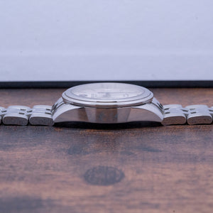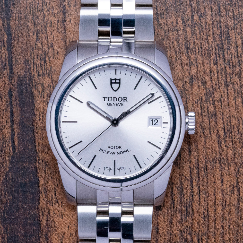 Here we have a 2023 Tudor Glamour Date Automatic 55000 with a 36mm stainless steel case, the case gently curves over your wrist with tapered lugs, and a lug-to-lug length of 43mm and a case thickness of 10mm ensures a comfortable fit. On the right side is a screw-down signed crown. A polished stainless steel smooth stepped bezel holds a flat sapphire crystal above a sunburst silver dial, an outer minute track with fine baton indexes marks the hours, and at 3 o’clock a date window. Chamfer edged baton hands with luminance strip down their centre complemented by a tapered sweeping second hand with a teardrop counterweight. An applied Tudor shield at 12 with text precisely applied to the dial with the smiley “self-winding” at 6 o’clock. On the reverse, a coin-edged screw-down case back, inside an automatic Tudor Cal. T601, 25/26 jewels, 28,800 beats per hour, this workhorse movement has a base of either the ETA 2824-2 or the Sellita SW200-1 with a bidirectional rotor and hand winding and hacking seconds for your convenience. The watch comes paired with its Tudor 20mm stainless steel, polished centre links bracelet with a signed folding clasp; all links are provided and come with its Tudor presentation box and papers.