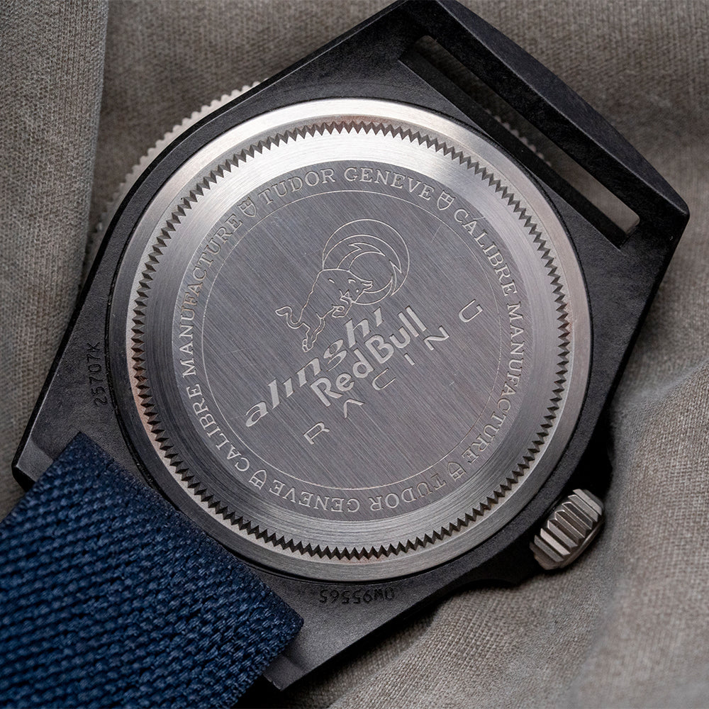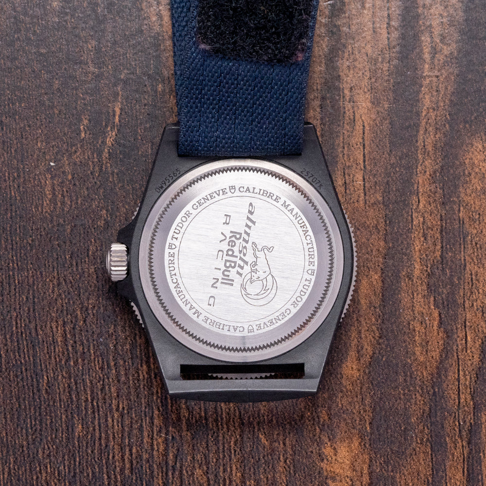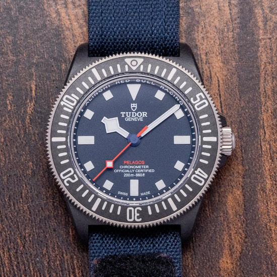 Here we have a 2023 Tudor Pelagos FXD Alinghi Red Bull Racing Edition 25707KN, released in 2022, this is the first time Tudor has ventured into competitive yacht racing with the help of the Alinghi Red Bull Racing Team. It is engineered using the latest technology in composite materials such as Carbon, Titanium, and stainless steel, as used on the America’s Cup 75 hydrofoil racing yacht. The curvaceous 42mm black Carbon Fibre composite case curves over your wrist with tapered lugs, and a lug-to-lug length of 50mm and a case thickness of 12.5mm give the watch an impressive wrist presence. On the right side is a signed titanium screw-down crown with deep knurling for grip. A 120-click bidirectional Titanium bezel has a coin edge for grip and a matte black carbon 60-minute scale, holding a flat sapphire crystal above a matte blue dial. The sloping minute chapter ring has “Alinghi Red Bull Racing” printed around its edge, applied 3-dimensional luminous monobloc ceramic Triangle, square and rectangle indexes mark the hours, characteristic Tudor “Snowflake” hands filled with SuperLumiNova are complemented by a red sweeping second hand, at 12 o’clock we have the Tudor motif at 6 o’clock a red “Pelagos” “Chronometer Officially Certified 200m-660ft” complete this racing themed sports dive watch. On the reverse, a screw-down stainless steel case back engraved with the Alinghi Red Bull Racing logo, inside an automatic Tudor Cal. MT5602, in-house Certified Chronometer (COSC) movement, 25 jewels, 28,800 beats per hour, first introduced in 2015. The watch is paired with its 22mm blue sail canvas velcro strap with Carbon Fibre composite hardware, plus a 22mm MN strap and it comes with its Tudor presentation box and paperwork.