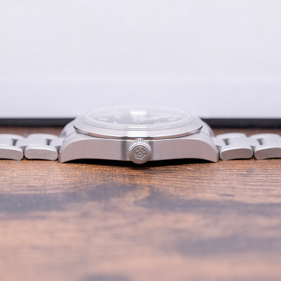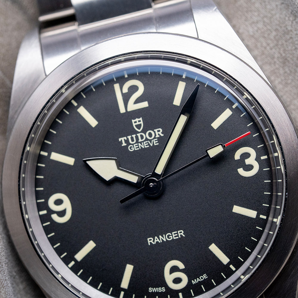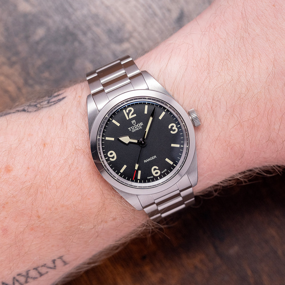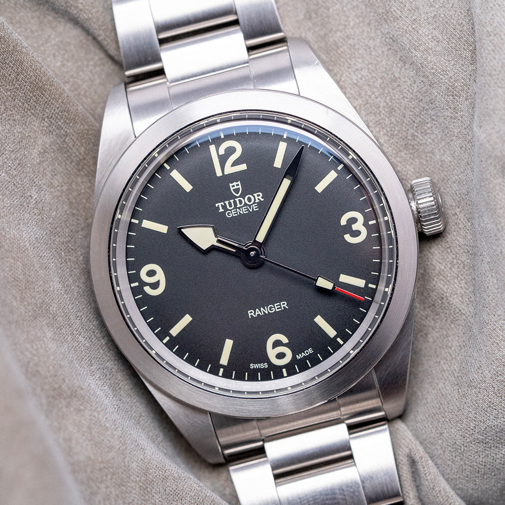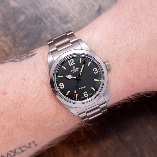 Here we have a 2023 Tudor Ranger Automatic on a Bracelet 79950, which is an update to their 2014 reference 79910. The Ranger watches were Tudor's version of the Rolex Explorer. When launched, it celebrated the 70th Anniversary of the British North Greenland expedition in 2022, a two-year scientific mission studying ice sheets. Featuring a 39mm satin-brushed 316L stainless steel case that curves over your wrist, with chamfered edges and tapered lugs, its curvaceous flanks lead to a lug-to-lug length of 48mm and a case thickness of 12.5mm, giving the watch an impressive wrist presence. On the right side, a screw-down crown with the Tudor Rose in relief in the centre. Brushed and polished surfaces transition with crisp edges. A satin-brushed, smooth bezel holds a domed AR-coated sapphire crystal above a matte black dial with a fine-grain texture. An outer minute track is precisely printed with Arabic 12, 3, 6, and 9, and baton indexes marking the hours coated in a beige Super-LumiNova for that vintage aesthetic. The arrow and sword hands are complemented by a red-tipped sweeping second hand. At noon, we have the Tudor motif, and at 6 o’clock, “Ranger” completes this historical tool watch, modernised and reimagined. On the reverse, a coin-edged screw-down case back, featuring an in-house MT5402 (COSC) Certified movement with 27 jewels and 28,800 beats per hour. A bi-directional rotor and Antimagnetic silicon hairspring provide a robust and accurate movement first introduced in 2018, and are also found in their Black Bay 58. It comes paired with its Tudor 20mm three-link brushed stainless steel bracelet, featuring the Tudor “T-fit” safety catch quick-adjustment system and a signed folding clasp; all links are included. It also includes a Tudor presentation box, swing tag and paperwork.