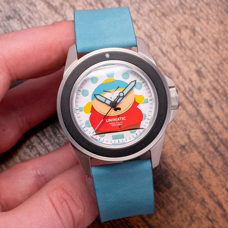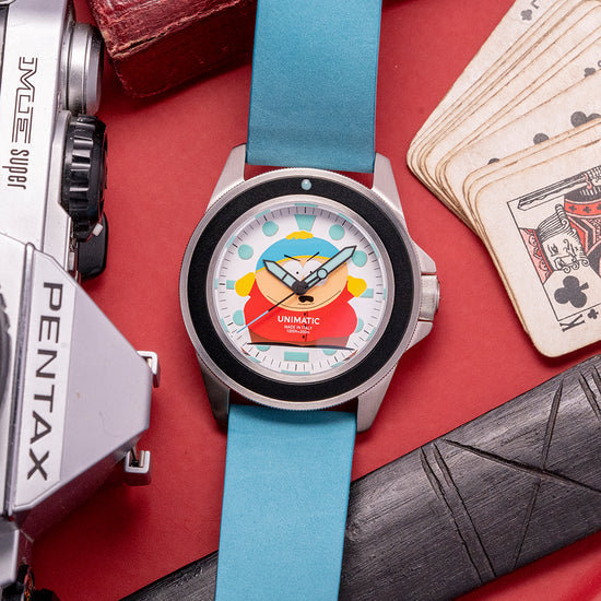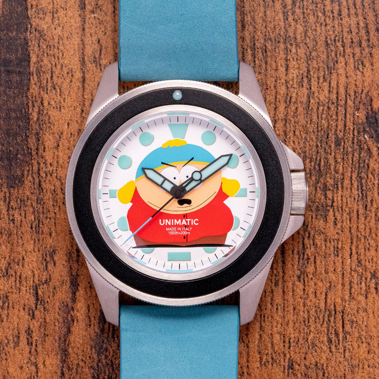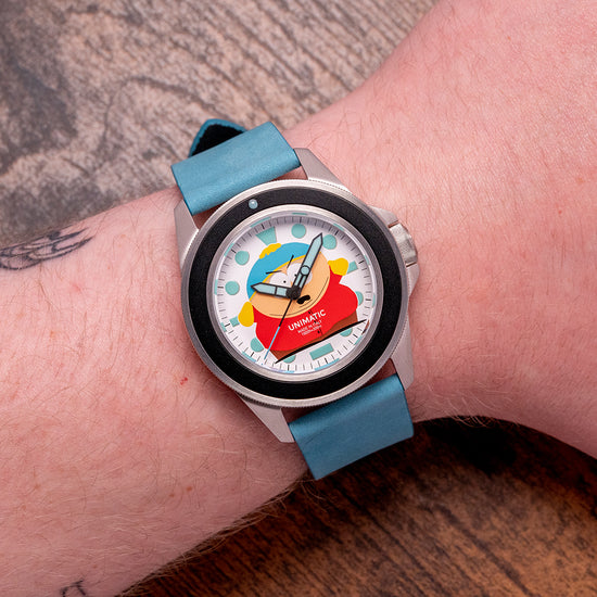 Here we have a 2023 Unworn Unimatic x South Park U1-EC Limited of 083/100 a collaboration between Unimatic and South Park created by Trey Parker and Matt Stone, an adult-themed animated series based in an obnoxious primary school in Colorado near the Rocky Mountains in the US that follows four characters, Stan Marsh, Kyle Broflovski, Eric Cartman, and Kenny McCormick and was first aired on TV in 1997. A 41mm brushed stainless steel case that curves over your wrist with thick tapered lugs, a lug-to-lug length of 49mm and a case thickness of 14mm ensures a comfortable fit. On the right side a screw-down crown protected by crown guards, the unidirectional bezel has a black aluminium sterile insert with the characteristic lume pip at 12 o’clock holding a double domed sapphire crystal AR coating on the inside above a matte white dial with the multi-coloured printed character from South Park Eric Cartman in his turquoise beanie. An outer minute track is precisely executed with turquoise disc and baton indexes marking the hours coated in Super-LumiNova C9 and slender sword hands are infilled with the same Super-LumiNova C9 complemented by a lollipop counterbalance sweeping second hand. On the reverse, a screw-down case back with the characters from South Park etched across the centre and the watch's specification etched around its edge, inside an automatic Seiko Cal. NH35A, 24 jewels, beating at 21,600 beats per hour, this workhorse movement has hand winding and hacking seconds. The watch comes fitted on its 22mm Turquoise Nubuck leather strap with a signed brushed stainless steel buckle plus an additional black 22mm nylon NATO strap with a signed brushed stainless steel buckle in the box and the watch comes with its Unimatic strong pelican case and paperwork.