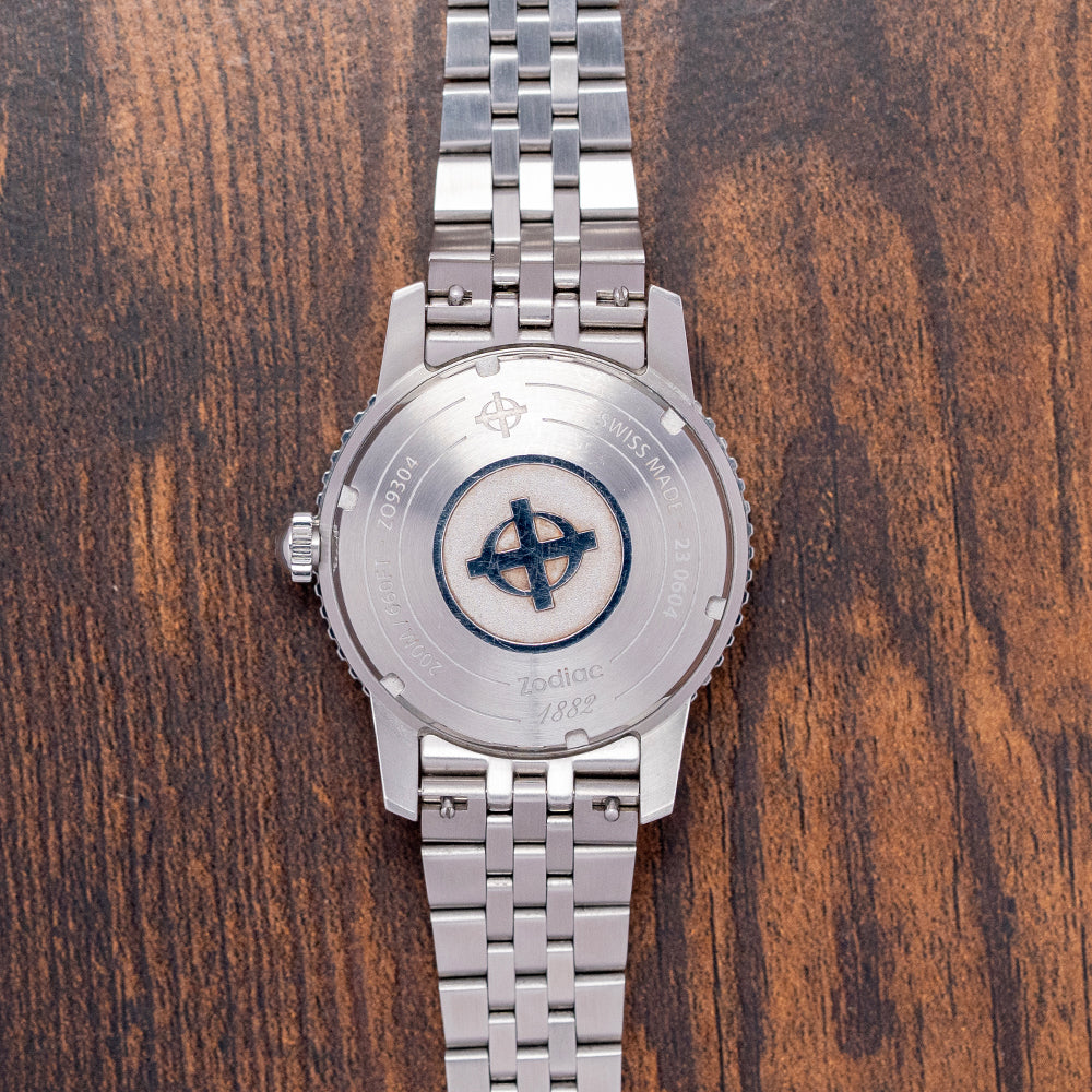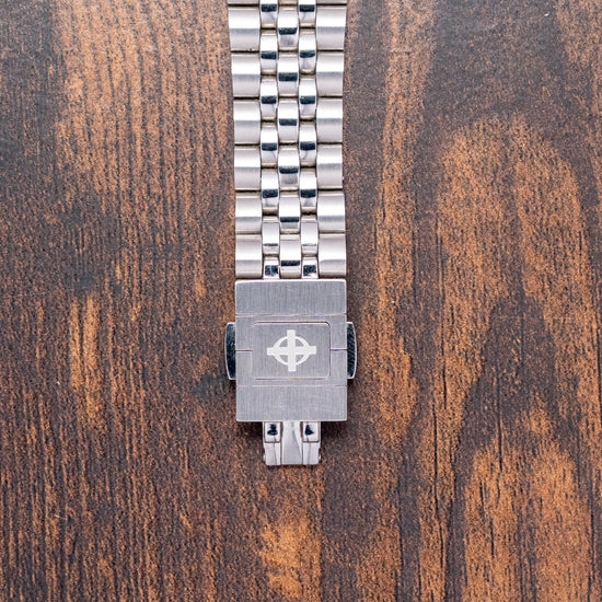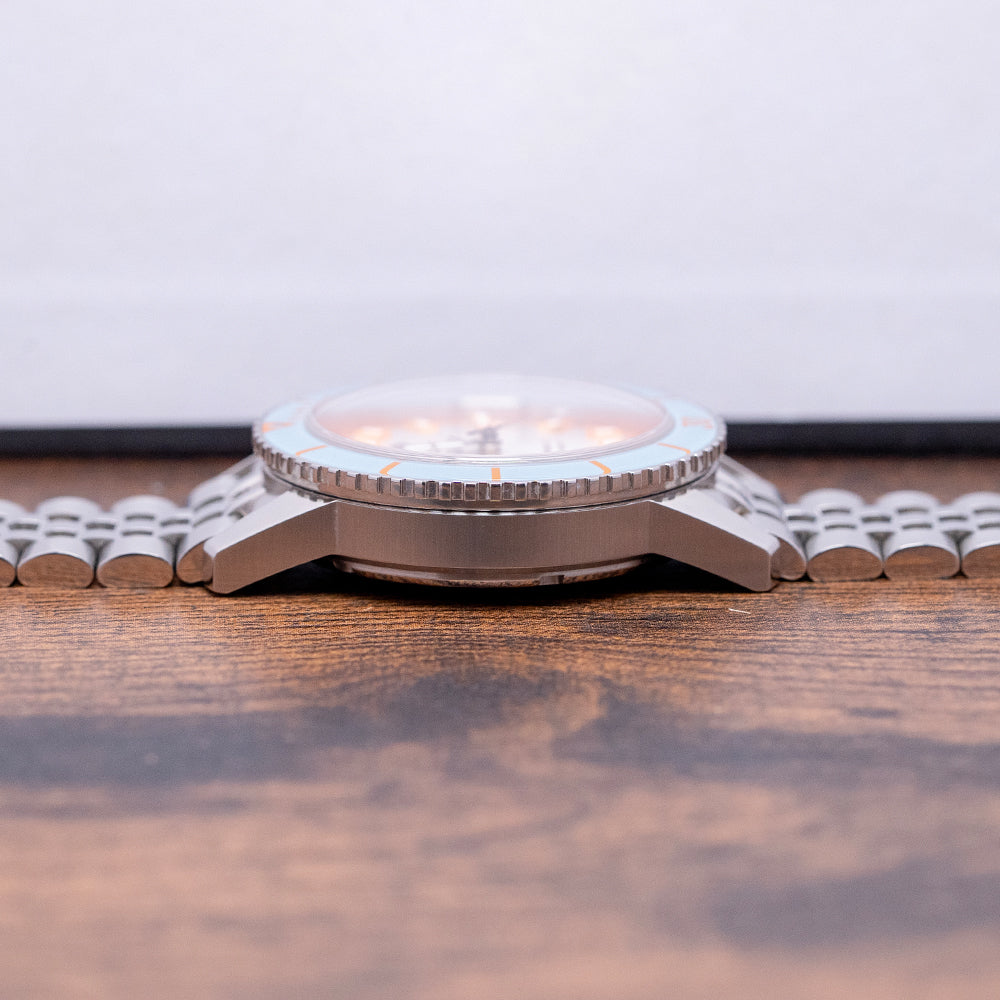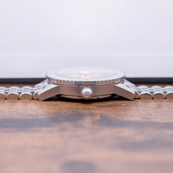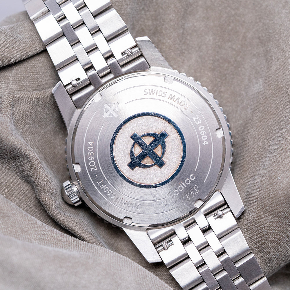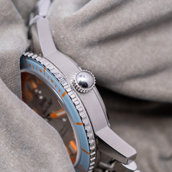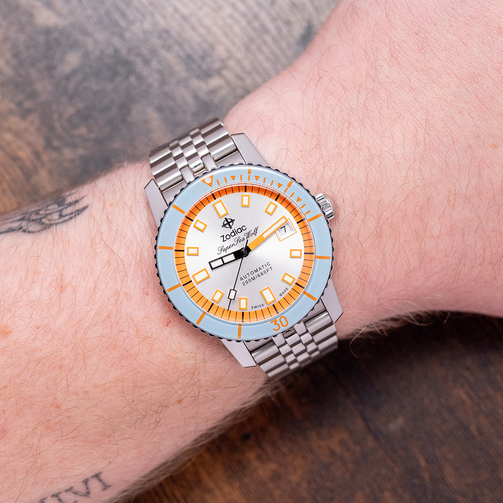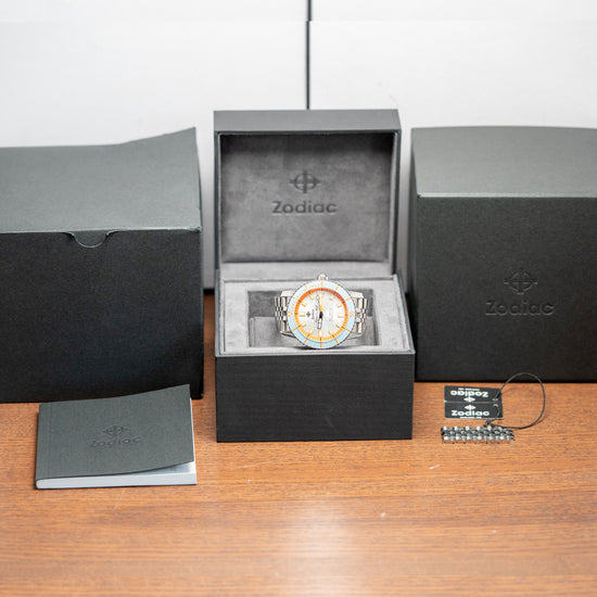 Here is a 2023 Zodiac Super Sea Wolf Compression Diver ZO9304, nicknamed the ‘Gulf’ from the motor racing world, Gulf Motor Oil, due to its distinctive colour way. Featuring a 40mm brushed stainless steel case that curves over your wrist with steeply angled flat-ended lugs. The brushed curved flanks lead to a lug-to-lug length of 48.5mm and a case thickness of 13mm, giving it an impressive wrist presence. On the right side, a signed screw-down crown features deep knurling for enhanced grip. The unidirectional bezel features a glossy, sapphire-protected blue-and-orange 60-minute dive insert that resembles the Bakelite bezels used in the past. Its flat sapphire crystal sits slightly above the bezel, protecting a stunning sunburst silver dial. An orange outer minute chapter ring surrounds applied orange outlined Super-LumiNova filled indexes marking the hours; the steel hour hand and orange minute hand are complemented by a steel counterweighted second hand; at 12 o’clock, we have the applied Zodiac motif ‘Super Sea Wolf’, and at 6 o’clock, ‘Automatic 200M/660FT' completes this colourful dive watch. On the reverse, a screw-down solid case back with the details of the watch around its edge and the embossed Zodiac motif in the centre, inside an automatic STP Cal. 1-11, 26 jewels, beating at 28,800 beats per hour. It comes paired with its original 20mm Zodiac stainless steel Jubilee bracelet secured by a push-button deployant clasp; all links are provided. This watch is sold with its original Zodiac box, swing tag and Zodiac paperwork.