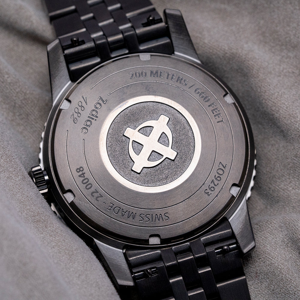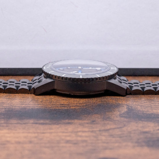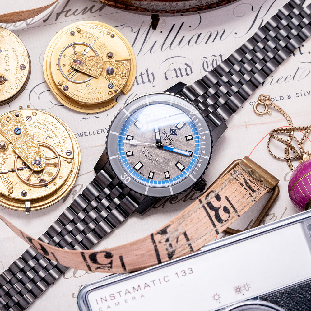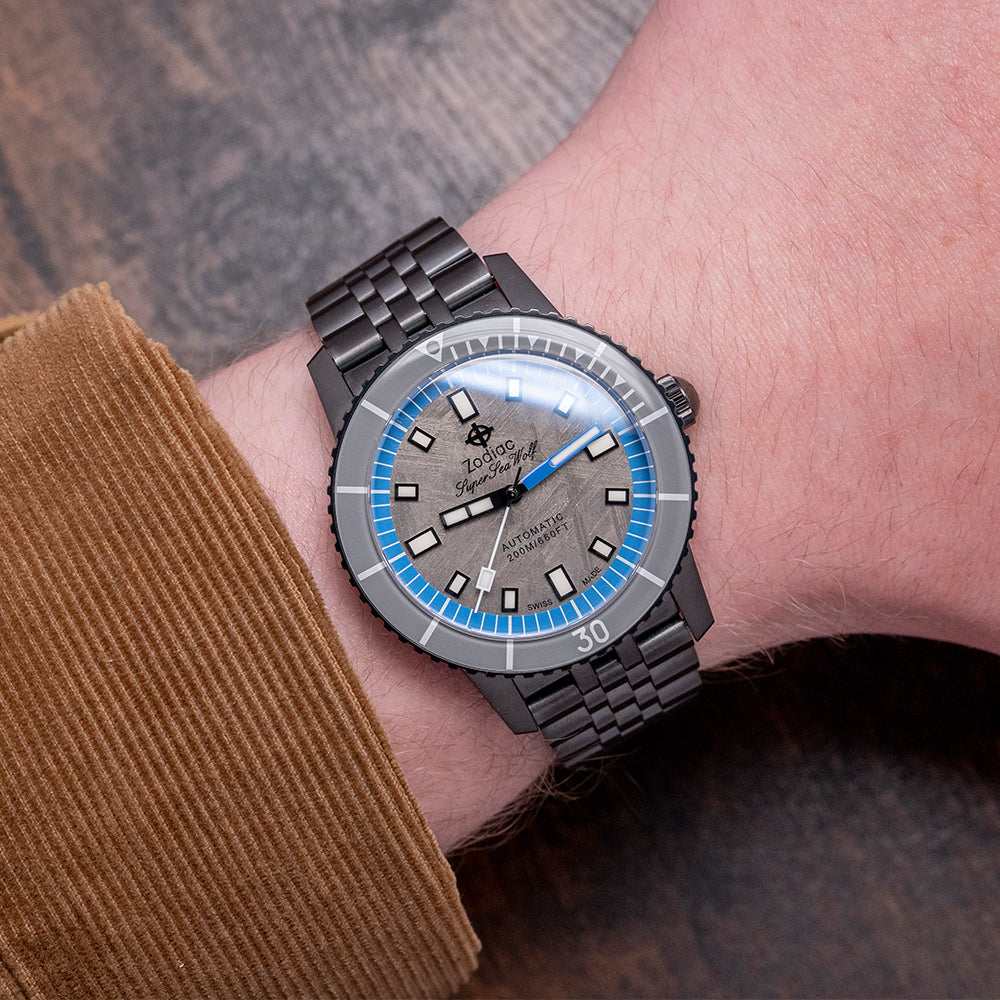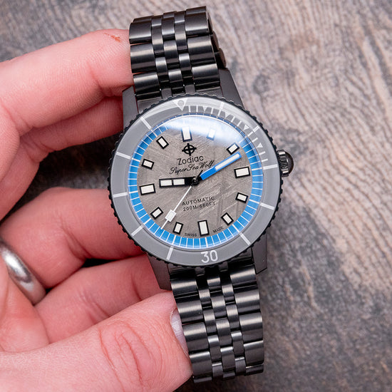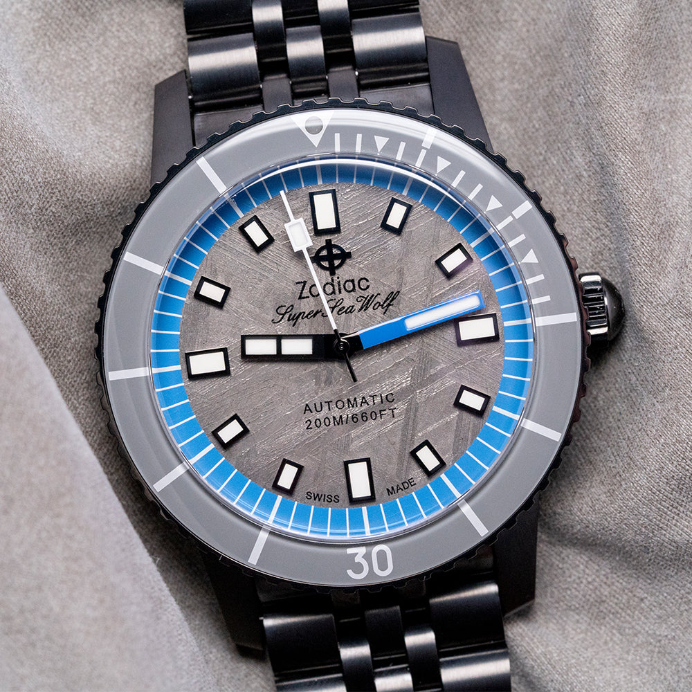 Here is a 2023 Zodiac Super Sea Wolf Meteorite ZO9293 Limited Edition of 182 pieces. It's a 40mm black DLC-plated case that curves over your wrist with steeply angled lugs. The watch's curved flanks lead to a lug-to-lug length of 48.5mm and a case thickness of 13.5mm, giving it an impressive wrist presence. On the right side, there is a signed crown with deep knurling for grip. The unidirectional black DLC-plated bezel has a glossy grey ceramic 60-minute dive insert that resembles the Bakelite bezels used in the past. Its flat sapphire crystal sits slightly above the bezel, protecting a stunning grey Meteorite dial with its unique reflective pattern that plays with the light as you rotate your wrist. A blue outer minute chapter ring surrounds applied black outlined Super-LumiNova filled indexes marking the hours; the black hour hand and blue minute hand are complemented by a white counterweighted second hand; at 12 o’clock, we have the applied Zodiac motif “Super Sea Wolf” and at 6 o’clock “Automatic 200M/660FT” completes this space infused limited edition dive watch. On the reverse, a screw-down solid black DLC-plated case back with the details of the watch around its edge and the embossed Zodiac motif in the centre, inside an automatic STP Cal. 1-11, 26 jewels, beating at 28,800 beats per hour. This movement is based on either the ETA 2824-2 or Sellita SW200-1, with hacking seconds for your convenience. It comes paired with its original 20mm Zodiac black DLC-plated stainless steel Jubilee bracelet secured by a push-button deployant clasp; all links are provided. This watch is sold with its original Zodiac box, swing tag and Zodiac paperwork.