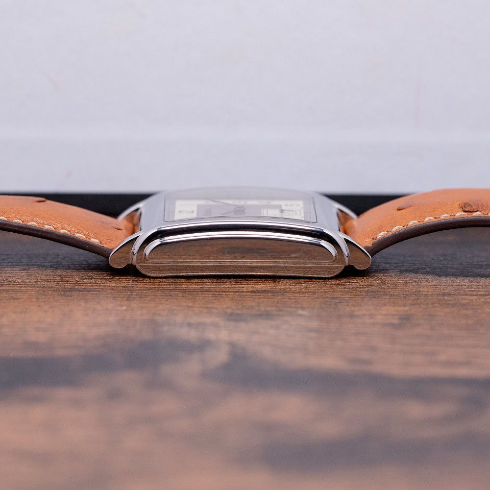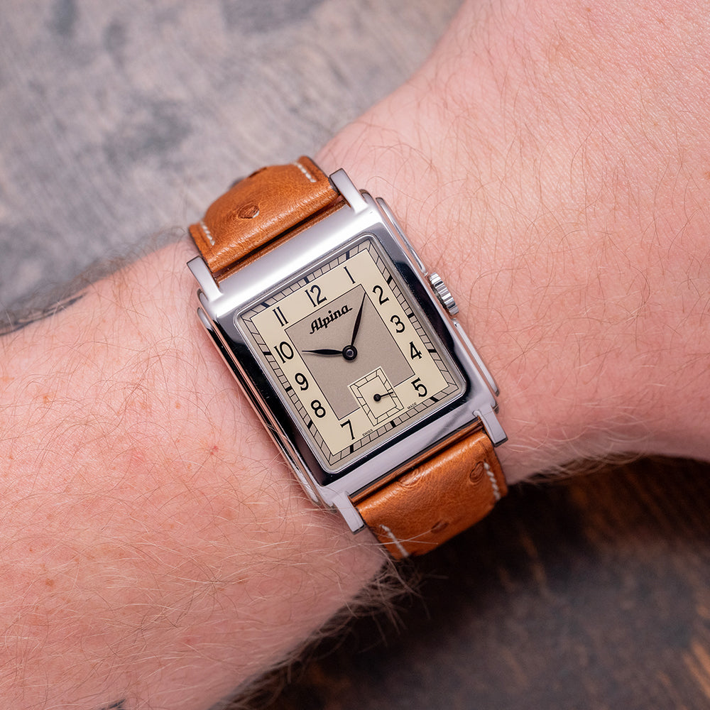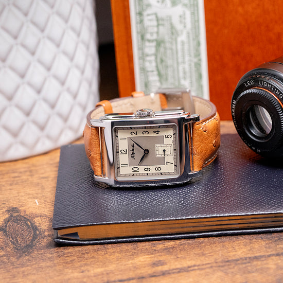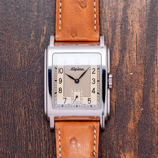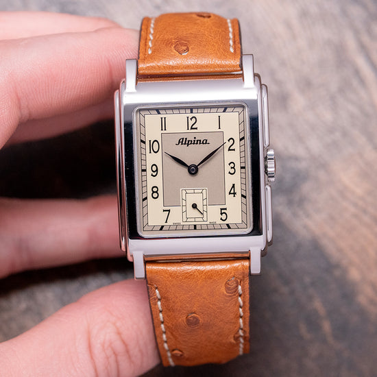 Here we have the 2024 Alpina Alpiner Heritage Carrée Auto AL-530SAC3C6, part of their Heritage collection, celebrating the 140th Anniversary of the brand. Inspired by their creative 1930s ‘Alpina 4’ sports watch, which incorporated Gottlieb Hauser's philosophy of four key attributes of a sports watch: stainless steel, water resistance, anti-magnetic properties, and anti-shock resistance. It features a polished 32.5mm rectangular stainless steel case that sits comfortably on your wrist, thanks to the angled and rounded lugs. The sculpted flanks take us back to the time of streamlined steam trains and sleek motor vehicles. A coin-edge crown on the right side sits between the sculpted flanks. Its sapphire crystal fits perfectly between the polished, smooth bezel, showcasing the Art Deco style two-tone silver and cream dial. A minute rail track surrounds the cream rectangle with Arabic numerals printed in black, marking the hours. Elegant leaf hands sit majestically in the centre above a rectangular sub dial. At noon, the Alpina motif completes this vintage-inspired sports watch. On the reverse, a screwed-down sapphire exhibition case back engraved with the details of the watch around its edge, inside an automatic Alpina Cal. AL530 (Sellita SW261), 31 jewels, beating at 28,800 beats per hour. This quality movement features a modified signed rotor, hacking seconds, and hand-winding for your convenience. It comes paired with its 22mm Alpiner leather strap and signed pin buckle. This watch is sold with its original Alpina box, swing tag and paperwork.