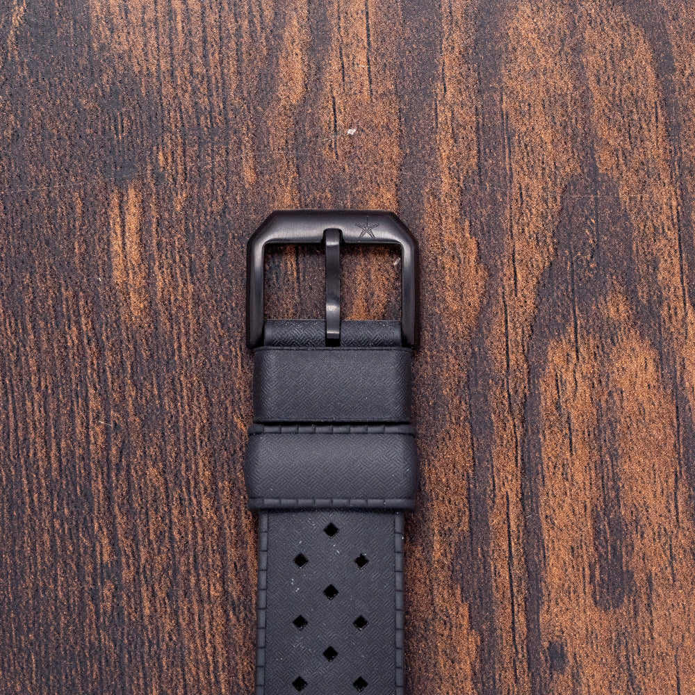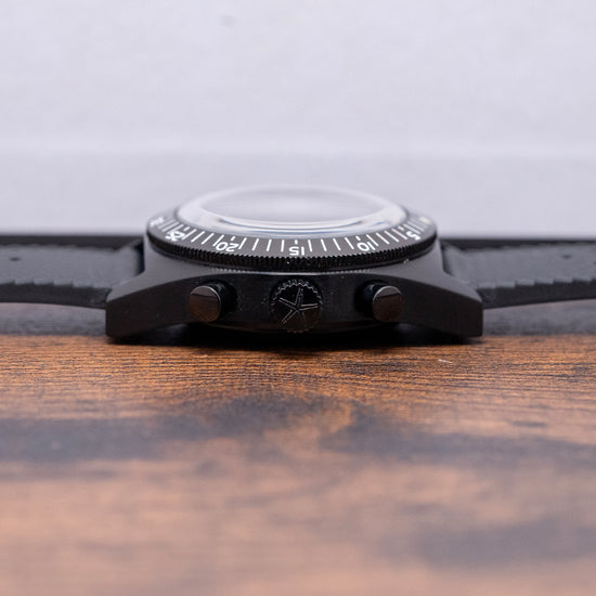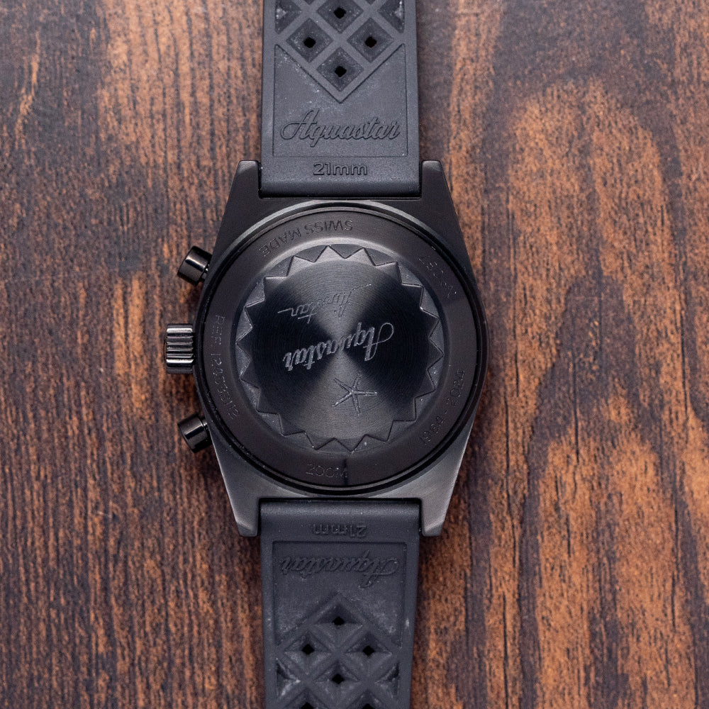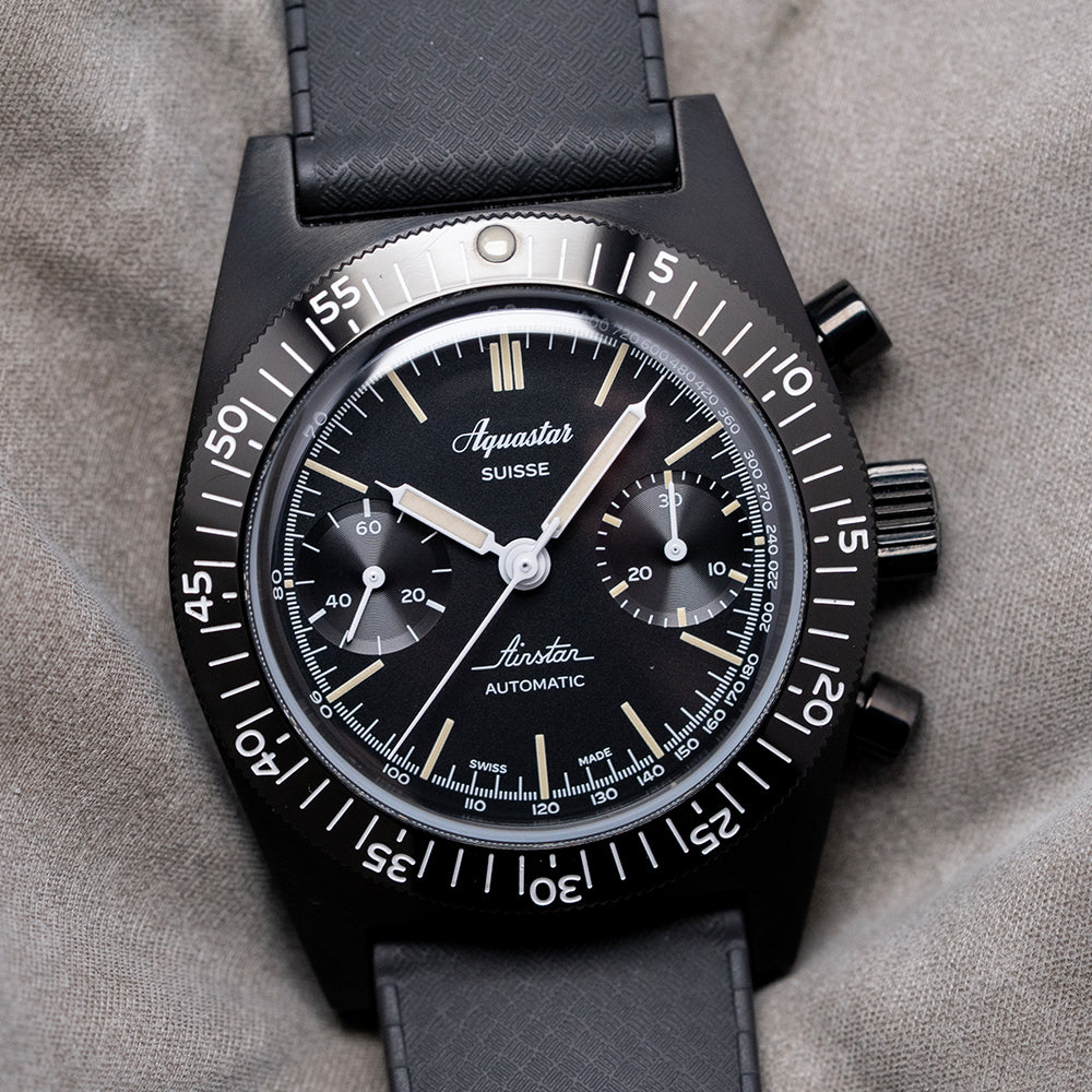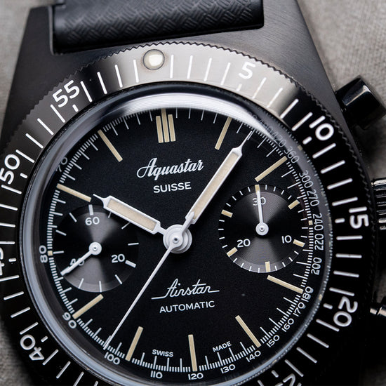 Here we have a stealthy 2024 Aquastar Airstar Chronograph 60th Anniversary, limited to 300 pieces per year. It's a modern contemporary design inspired by the 1950s and 1960s skin diver. Featuring a 39mm black DLC-coated 316L stainless steel case that comfortably sits on your wrist with tapered flat-ended lugs. Its curved profile leads to a lug-to-lug length of 49mm and a case thickness of 16.5mm, giving the watch an impressive wrist presence. Down the right side, we have the black DLC-coated piston pushers and a large signed coin-edged crown in the centre. The coin-edged, sloping matte black DLC-coated 120-click unidirectional bezel features a polished 60-minute scale and Super-LumiNova pip at 12, holding a domed sapphire crystal triple AR-coated above a black bicompax dial. An outer white printed Tachymeter scale is precisely executed, surrounding the aged Super-LumiNova indexes marking the hours. At 3 o’clock, a 30-minute register and at 9 o’clock, a running seconds, elegant white syringe-style hands are filled with Super-LumiNova and complemented by a white chronograph hand. The Aquastar motif sits at noon, and ‘Airstar Automatic’ completes this high-contrast bicompax sports watch. On the reverse, a black DLC-coated screw-down case back is engraved with the details of the watch around its edge and the ‘Aquarstar Airstar’ motif in the centre. Inside an automatic Valjoux Cal. 7753, 27 jewels, beating at 28,800 beats per hour, this movement has a base of the iconic ETA 7750 with hand winding and hacking seconds for your convenience. It comes paired with its 21mm Aquastar black Tropic rubber strap and an Unused 21mm NATO strap. This watch is sold with its original Aquastar Tube case and paperwork.