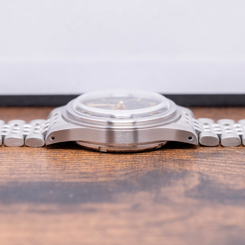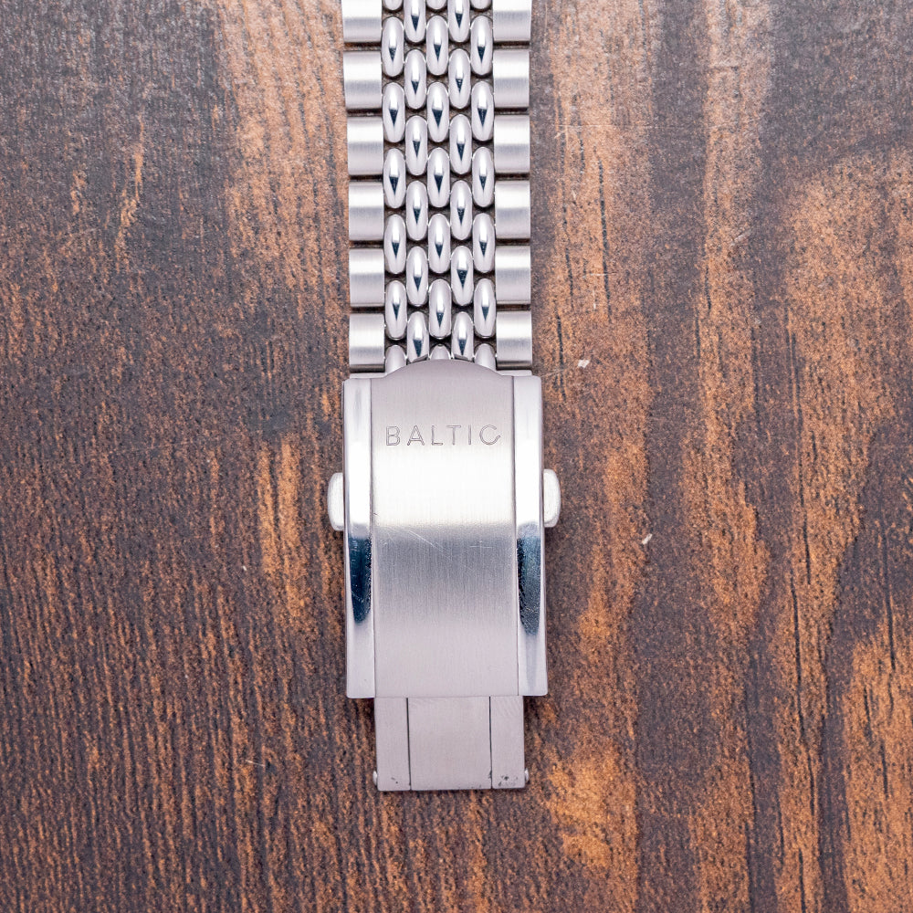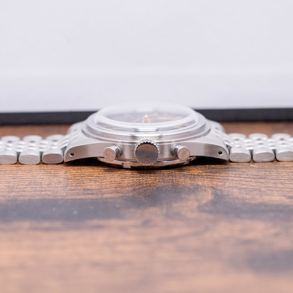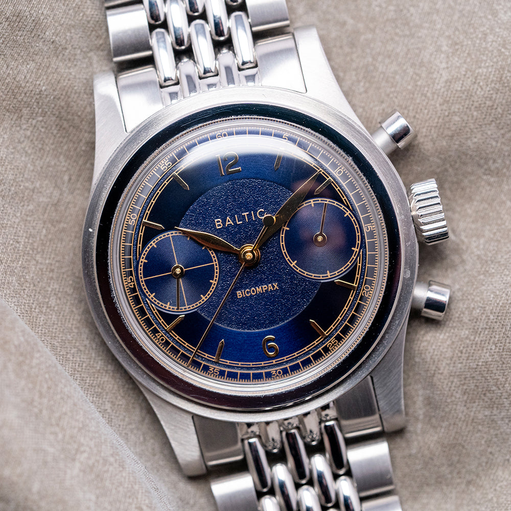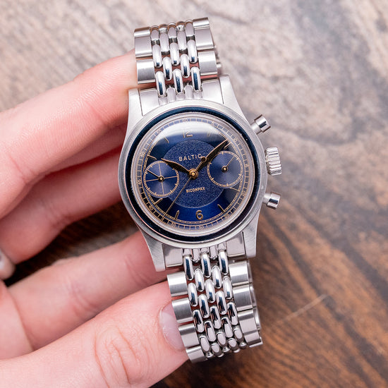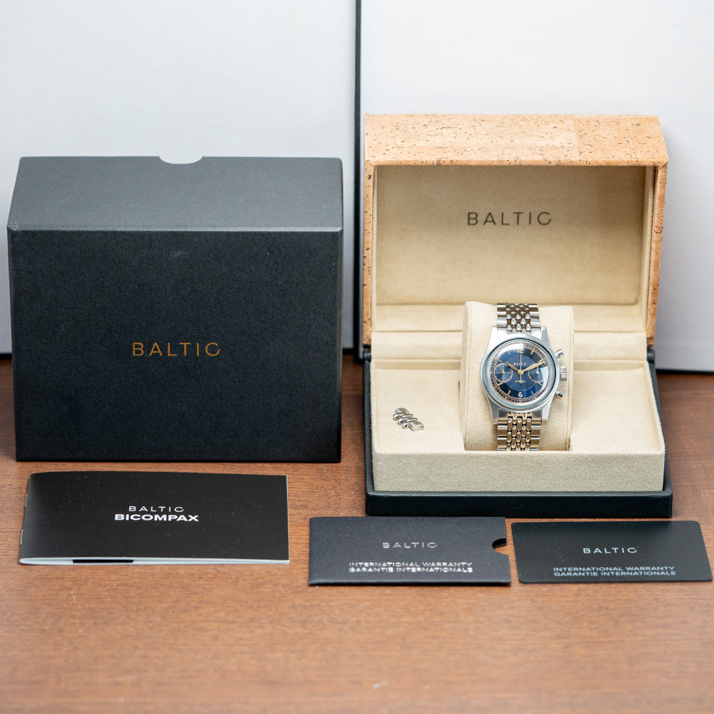 Here we have a 2024 Baltic Bicompax 003 Blue Gilt Chronograph inspired by the stylish chronographs of the 1940s. The 36.5mm brushed 316L stainless steel case gently curves over your wrist with tapered drilled lugs. Its curved brushed flanks lead to a lug-to-lug length of 45.5mm and a case thickness of 13mm, ensuring a comfortable fit. On the right, we have the chronograph piston pushers, and in the centre, a large, deep-knurled crown. The smooth, polished bezel holds a domed hesalite crystal above the star of the show, a blue sector dial with circular patterning and a sandy texture. The dial comprises a finely printed outer minute track and two recessed gilt registers for 60 seconds and 30 minutes. The dial is perfectly balanced with the contrasting applied gilt Arabic numerals and batons marking the hours. Gilt leaf hands are complemented by a lollipop counterweighted chronograph hand, completing this vintage-inspired contemporary Bi-Compax. At 12 o’clock we have the Baltic motif and at 6 o’clock Bicompax. On the reverse, a screw-down exhibition case back, inside a manually wound Seagull ST 1901, 21 jewels, 21,600 beats per hour. It comes paired with its original 20mm Baltic-signed “Beads of Rice” bracelet, secured by a push–button, Baltic–signed deployant clasp, and will fit up to a 7.1-inch wrist and also comes with its Baltic presentation box and papers.