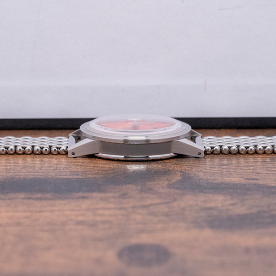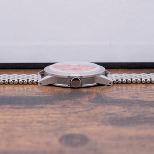 Here we have a 2024 Baltic Prismic Stone Red Agate Limited Edition 016/200 pieces. The 36mm round case is made of Grade 5 Titanium with a grainy finish. The drilled angled flat-ended lugs are brushed and polished, the curved flanks lead to a lug-to-lug length of 43.5mm and a case thickness of 9mm, ensuring a comfortable fit on your wrist. On the right side, there is a polished coin-edged crown. The brushed and polished stainless steel smooth bezel holds a double domed sapphire crystal AR coated on the inside above a stunning Red Agate natural stone with a unique pattern. Applied polished facet indexes mark the hours magically catching the light as you rotate your wrist, polished and brushed Dauphine hands sit about a running seconds at six. At 12, we have the Baltic motif completing this sophisticated timepiece. On the reverse, a screwed-down exhibition case back with the details of the watch and the limited number around its edge, inside a Manually Wound Peseux Cal. 7001, 17 Jewels beating at 21,600 Beats per hour. This movement is beautifully decorated with Côtes de Genève, blued screws and diamond polished bevels. It comes paired with its quick-release 20mm beads of rice stainless steel bracelet secured by a signed adjustable push-button clasp. This watch is sold with its original Baltic presentation box and paperwork.