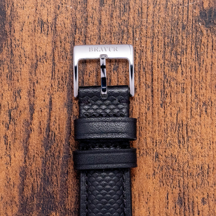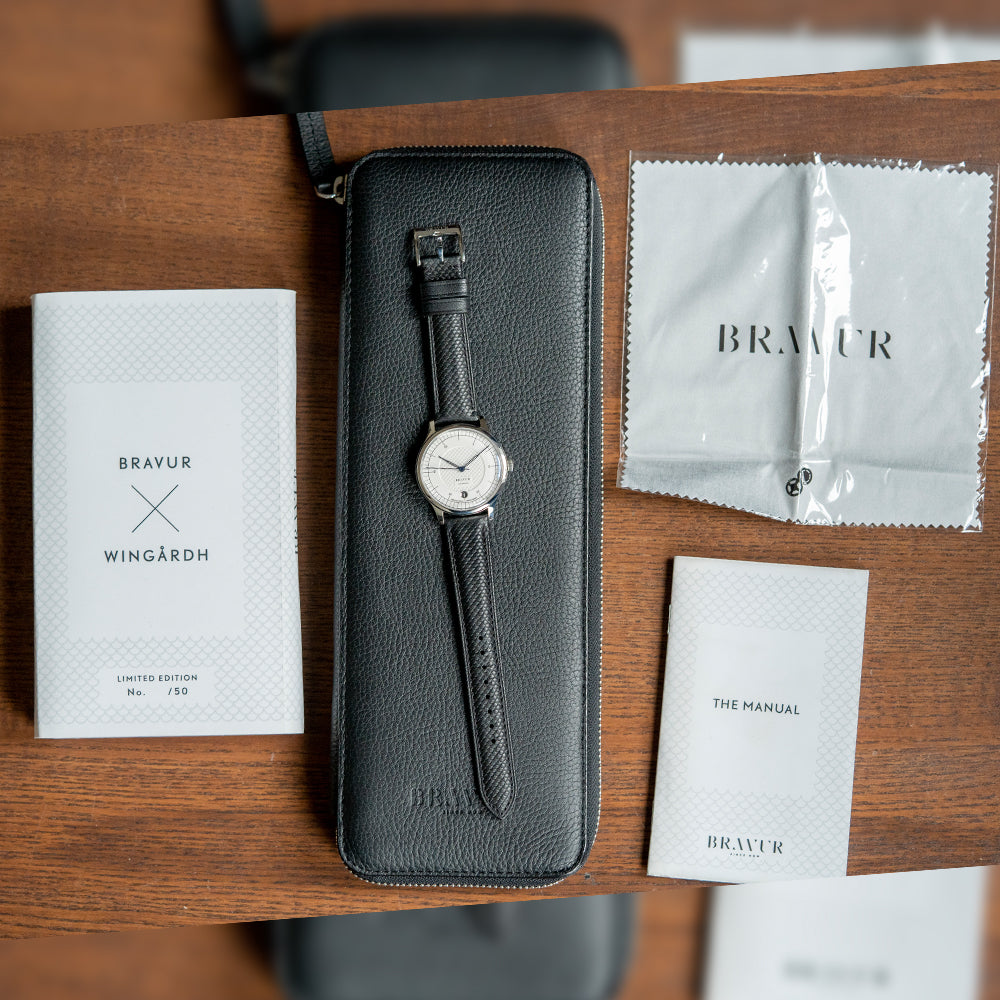 Here, we have a unique collaboration, 2024 Bravur x Wingårdh Limited Edition 32/50 pieces. Renowned Swedish architect Gert Wingårdh and his talented son, Rasmus Wingårdh, an award-winning designer in his own right, have taken on the exciting challenge of reinterpreting Bravur’s acclaimed Scandinavia model. This collaboration has resulted in a distinctive timepiece that draws its inspiration from the breathtaking landscapes of the Swedish west coast and the ethereal quality of Scandinavian light. The design beautifully reflects the region’s natural beauty and cultural heritage, combining artistic vision with functional elegance. Each element of the watch is thoughtfully crafted to embody the Swedish environment's essence, making it a stylish accessory and a tribute to the Scandinavian way of life. The 37mm brushed and polished stainless steel case curves over your wrist with tapered lugs. The brushed flanks transition seamlessly with the polished top surfaces, leading to a lug-to-lug length of 43mm and a case thickness of 10.5mm, ensuring a comfortable fit on your wrist. On the right side is an onion-style coin-edged signed crown. The slim, polished, smooth bezel holds a box-shaped sapphire crystal AR coated on the inside for perfect viewing of the distinctive crisp white dial. A thick raised ring has an outer minute track and a 60-minute scale in fine print; uniquely, the number out of 50 is highlighted by a circle at 50 and a black dot at 32 on the minute track. In the centre, an attractive embossed fish scale pattern with the elegant blued syringe hands complemented by a blue sweeping second hand. At 6 o’clock, a round date window with white on black numerals. The Bravur motif “Automatic” sits above “Swedish Soul Swiss Heart”, giving a clever nod to its inspiration. On the reverse, a screwed-down solid case back with a limited number, embossed fish scale pattern and the collaborative details of the watch, inside an automatic Sellita Cal. SW300m, 25 jewels, beating at 28,800 beats per hour, it has hand winding, hacking seconds and a quick-set date for your convenience. It comes paired with an 18mm black leather strap with an embossed fish scale pattern and a polished, signed pin buckle. The watch is sold with its Bravur leather travel case and paperwork.