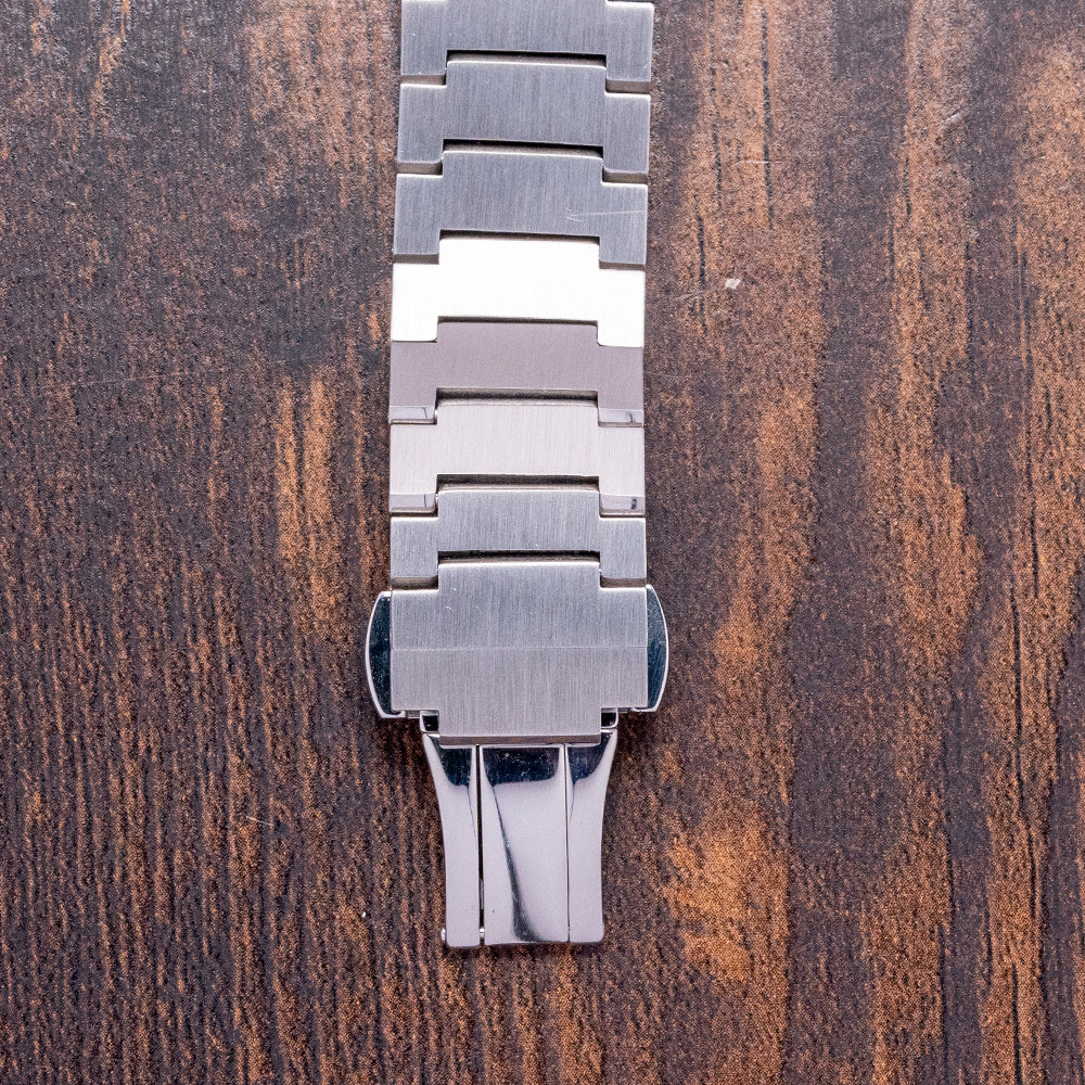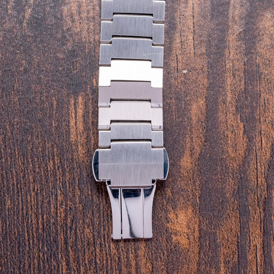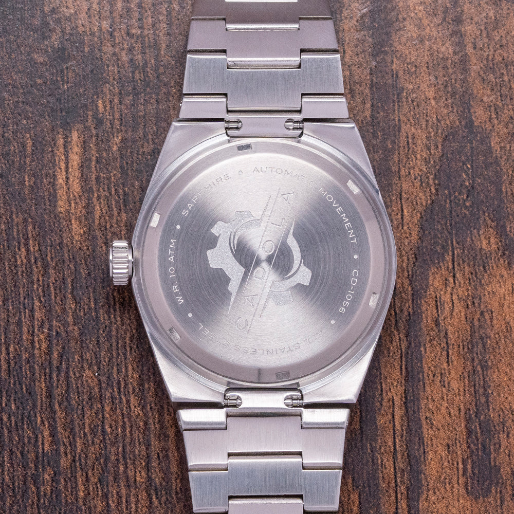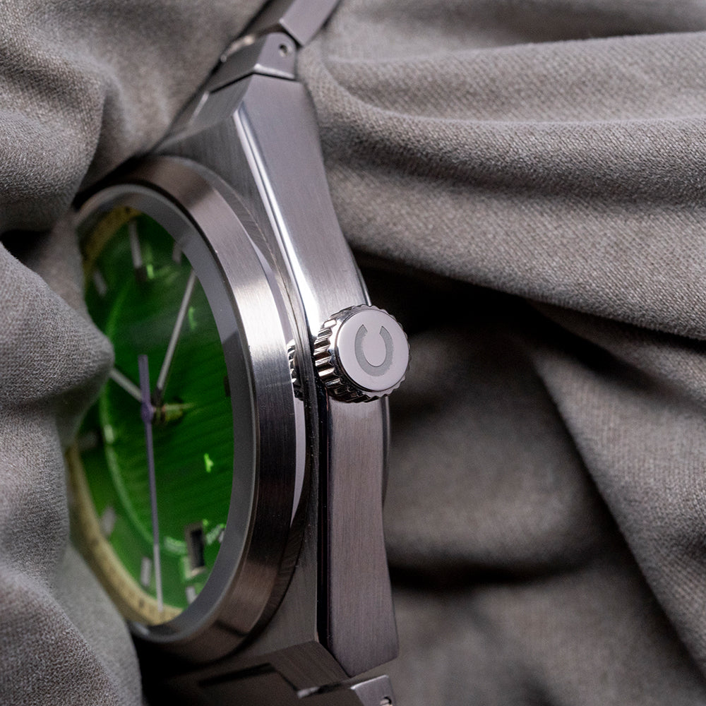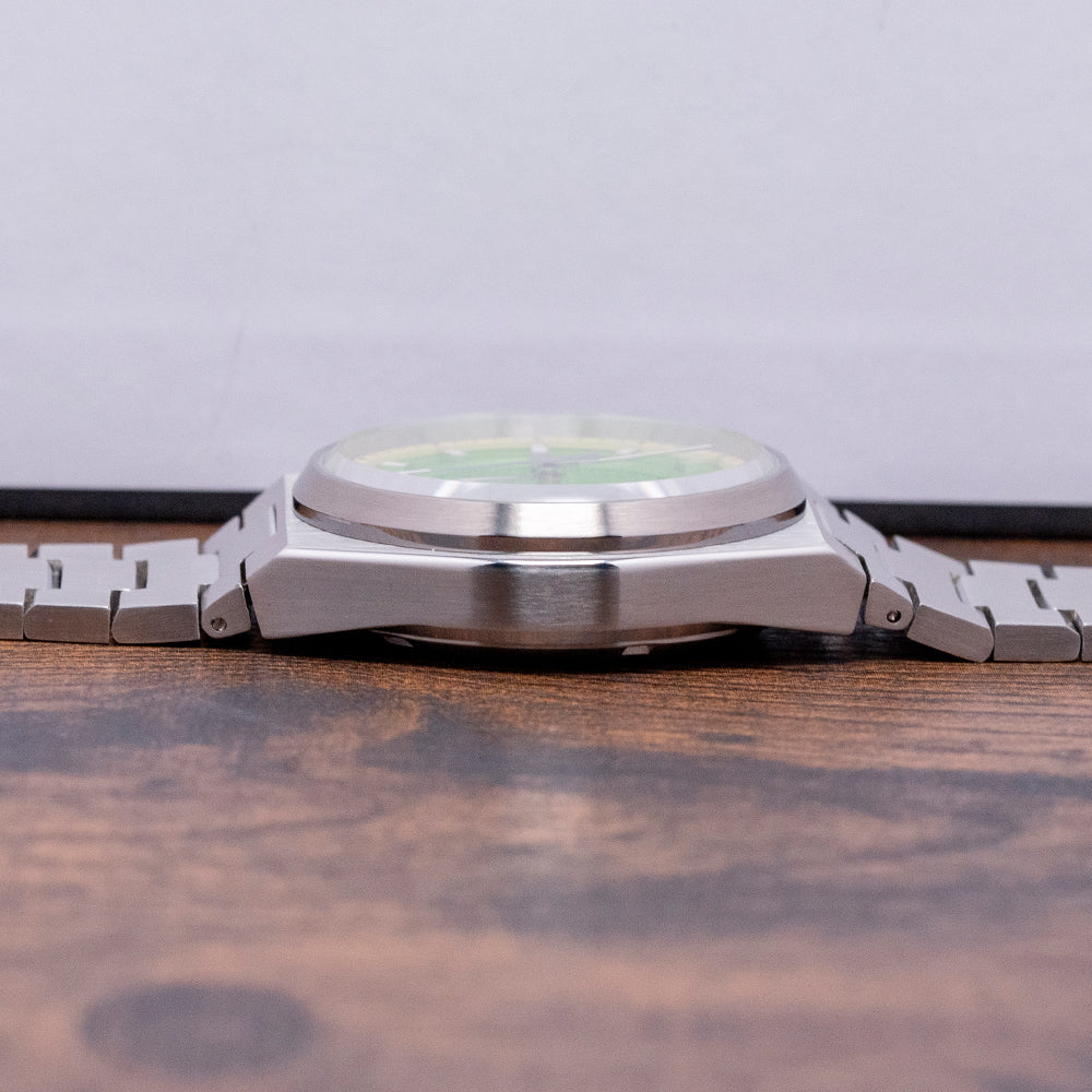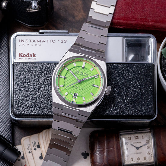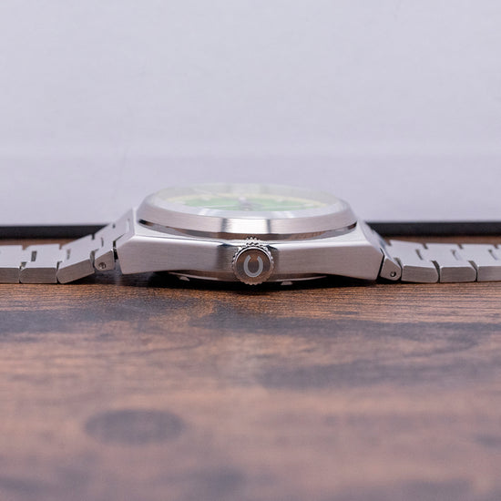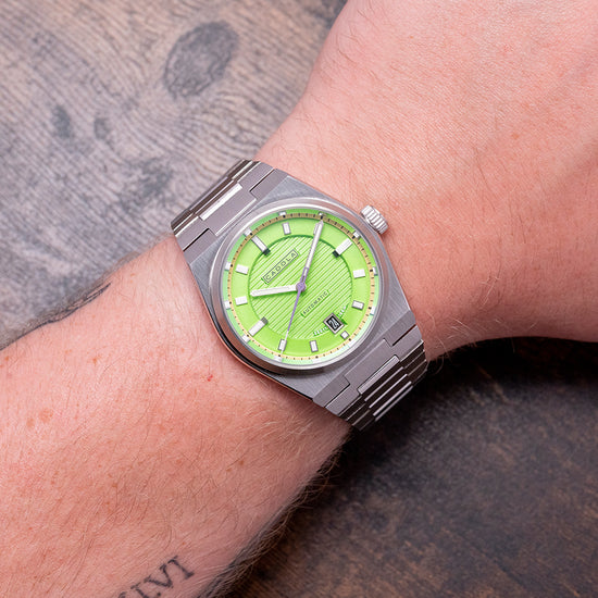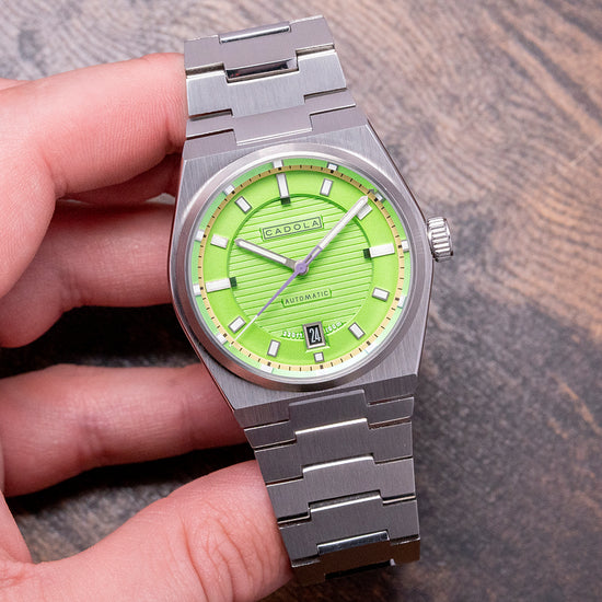 Here we have a 2024 Cadola Lydden Hill Automatic Steering Green named after the Lydden Hill Race Circuit in Denton, with Wootton, Kent. Featuring a 41mm 'PRX' style angular brushed and polished stainless steel tonneau-shaped case that flows over your wrist thanks to the integrated bracelet. Its curved flanks lead to a lug-to-lug length of 51mm and a case thickness of 12.5mm, ensuring a comfortable fit. On the right side, there is a coin-edged push/pull crown. The smooth, polished bezel holds a sapphire crystal above a striking green sector-style dial. A yellow outer minute track surrounds a green inner ring with applied baton indexes marking the hours, at 6 o’clock, a framed date window, slender hands coated in lume sit on the horizontal striped middle section, and complemented by a tapered second hand, at noon we have the Cadola motif and at 6 o’clock ‘Automatic’ completes this versatile sports watch. On the reverse, a solid case back, inside an automatic Seiko Cal. NH35, featuring 24 jewels that beat at 21,600 beats per hour, featuring hand-winding, hacking seconds, and quick-set date functions for your convenience. It comes paired with its 26mm integrated brushed stainless steel bracelet that tapers towards the signed butterfly clasp; all links are provided. This watch is sold with its Cadola box, swing tag and paperwork.