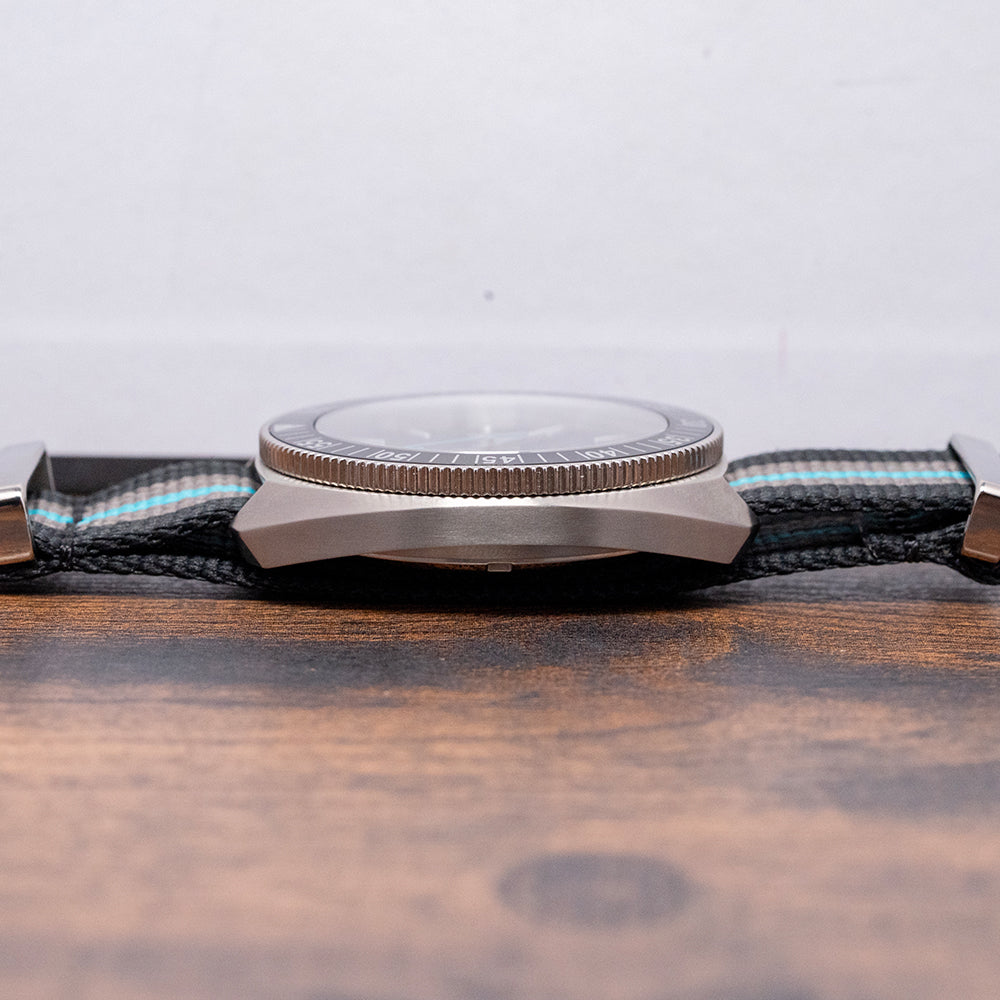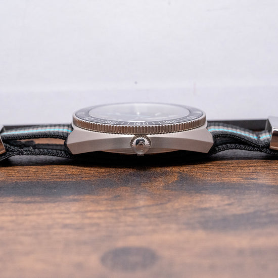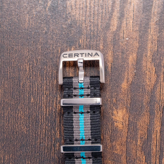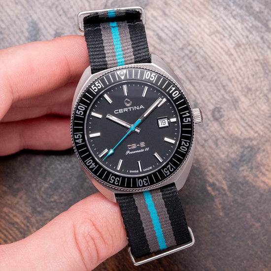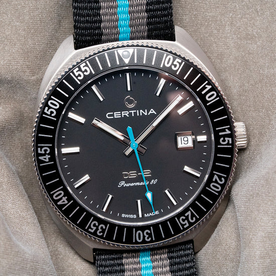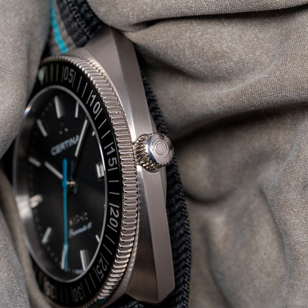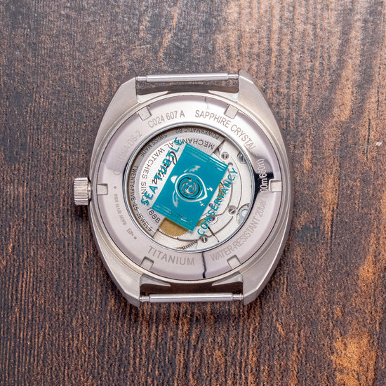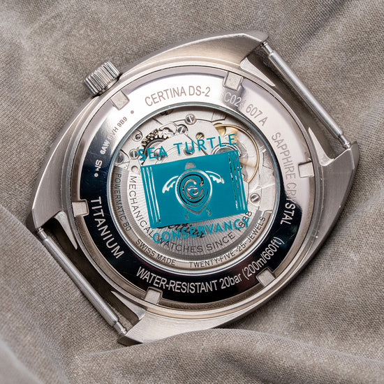 Here, we have a curvaceous 2024 Certina DS-2 Turning Bezel Sea Turtle Conservancy Special Edition. The Sea Turtle Conservancy (STC) is recognised as the oldest organisation focused on the study and conservation of sea turtles. Based in Florida, this group collaborates on projects worldwide to protect and conserve sea turtle populations. In 2017, Certina announced its partnership with the Sea Turtle Conservancy to support the Tour de Turtles project. Featuring a 41mm titanium tonneau-shaped case, a design first introduced in the 1960s. Its brushed, chamfered lines transition towards thick, flat-ended lugs. On the right side is a coin-edged signed crown. The titanium unidirectional bezel has a matte black aluminium dive insert with clearly marked 60-minute silver numerals. A round, flat sapphire crystal AR-coated sits above a matte black dial; an outer minute track surrounds applied, facet-edged baton indexes filled with Super-LumiNova, marking the hours. At 3 o’clock, a framed date window. Baton hands are filled with Super-LumiNova and complemented by a blue sweeping second hand. At noon, we have the Certina motif, and at 6 o’clock, ‘DS-2 Powermatic 80’. On the reverse, a screw-down exhibition case back is engraved with the details of the watch around its edge. At the centre, the historic Certina turtle emblem and the watch's details are engraved around its edge, with the Sea Turtle Conservancy Special Edition logo positioned at the centre. Inside an automatic Powermatic Cal. 80.611, 25 jewels, 21,600 beats per hour, based on the ETA 2824-2 architecture with hand winding and hacking seconds and comes paired with a 20mm striped grey-blue fabric strap made from #tide ocean material secured by Titanium hardware and comes with its Certina Sea Turtle Conservancy box, swing tag and paperwork.