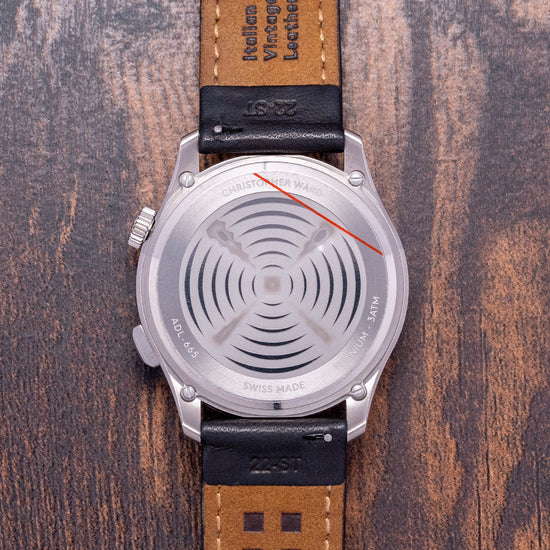 Here we have the incredible 2024 Christopher Ward Bel Canto Nero Automatic 41mm. This ambitious undertaking has brought together the worlds of high-end watchmaking and the visual arts; its name comes from one of the most melodic styles in Opera, which is fitting as Mike France, co-founder and CEO of Christopher Ward, is a huge fan. The 41mm Grade 5 Titanium alloy case features their Light-catcher polished and brushed elements that transition with crisp edges; the curve of the case leads to finely tapered lugs and a lug-to-lug length of 48mm, and a case thickness of 13mm, ensuring a comfortable fit on your wrist. On the right side, a signed push-down crown is used at 2 o’clock to set the time, and at 4 o'clock, an on/off pusher for the hourly chime is indicated by a red arrow on the dial. A stepped brushed and polished Light-catcher smooth bezel holds a domed sapphire crystal AR coated above a stunning black dial with a radial brushed effect. At 12 o’clock, we have the floating open mini-dial with polished and brushed raised indexes coated in Super-LumiNova SLN C1 X1 BL marking the hours; Christopher Ward's hands are infilled with the same luminance, all secured above a gear train and anchored to the stunning dial by two screwed in arching beams. Beneath, we have the intricate three-dimensional hand-polished bridge and hammer mechanism. Next, you find the mirror-polished chiming gong and the surrounding steel spring that has been delightfully tuned in “D” for that perfect hourly chime (sonnerie au passage); the connecting red arrow indicates whether the chime is active in the form of a sound wave or off with the flat line. On the reverse, a screw-down case back with a deep engraved sound wave across it, inside an automatic Christopher Ward Cal. FS01. This movement is based on the JJ01 movement from the C9 Harrison jumping hour and has been modified by Frank Stelzer, Christopher Ward technical director and Master Watchmaker by adding 60 additional components. The watch comes with a 22mm Christopher Ward brushed quick-release Grade 2 Titanium 3-link bracelet secured by a signed push-button clasp with ratchet micro-adjustment, all links are provided, and a 22mm Christopher Ward leather strap with a signed buckle; it also comes with a Christopher Ward presentation box and paperwork.