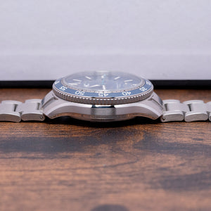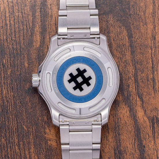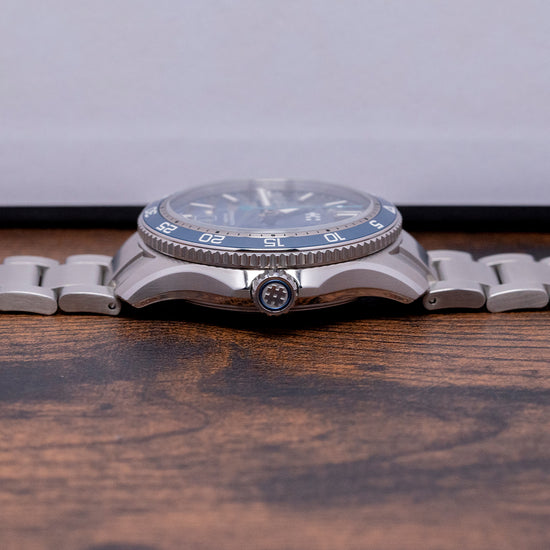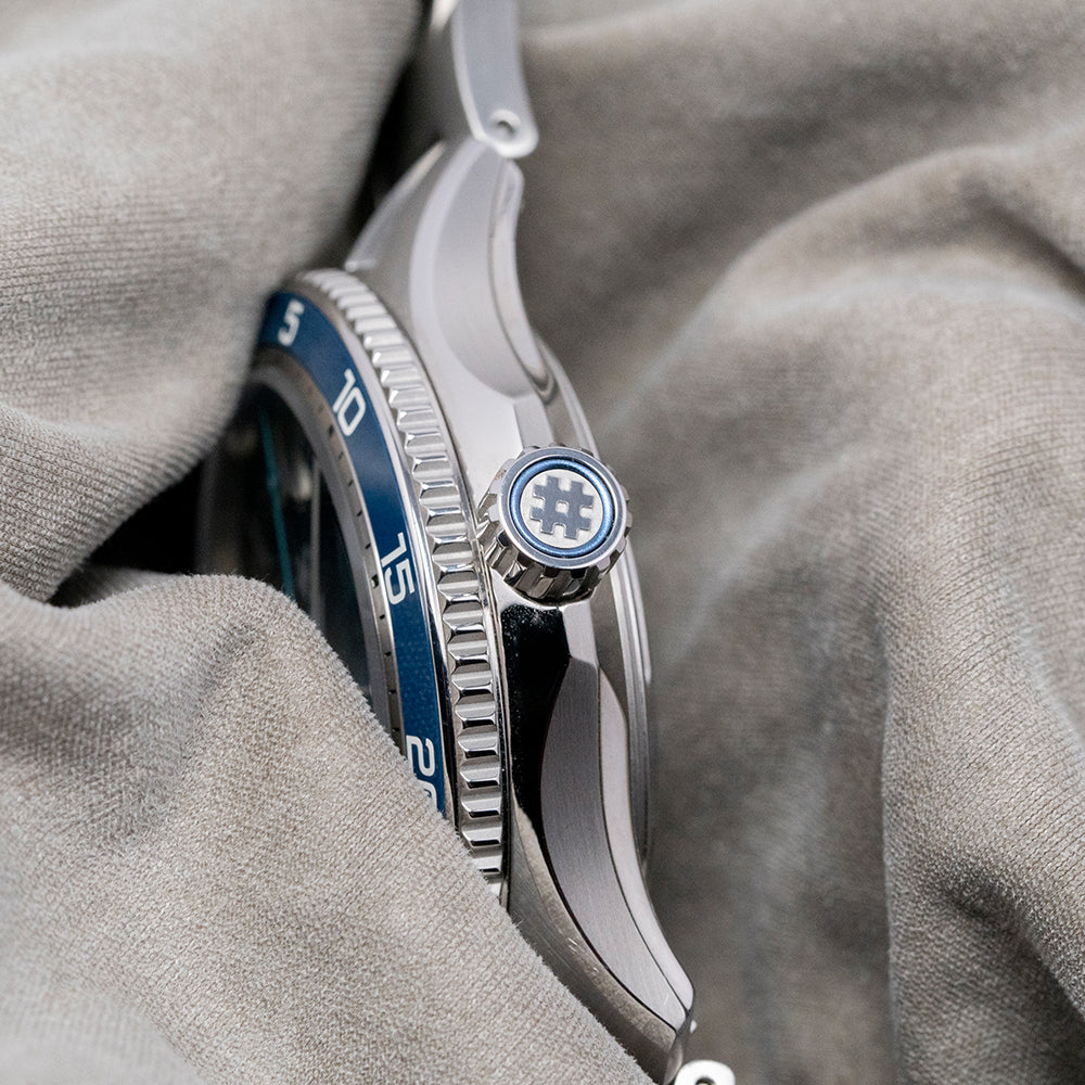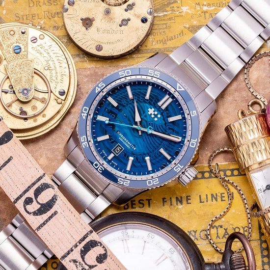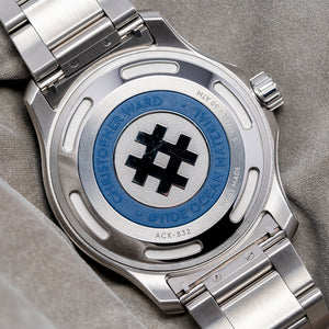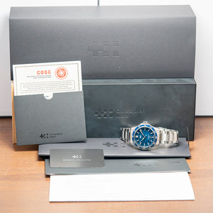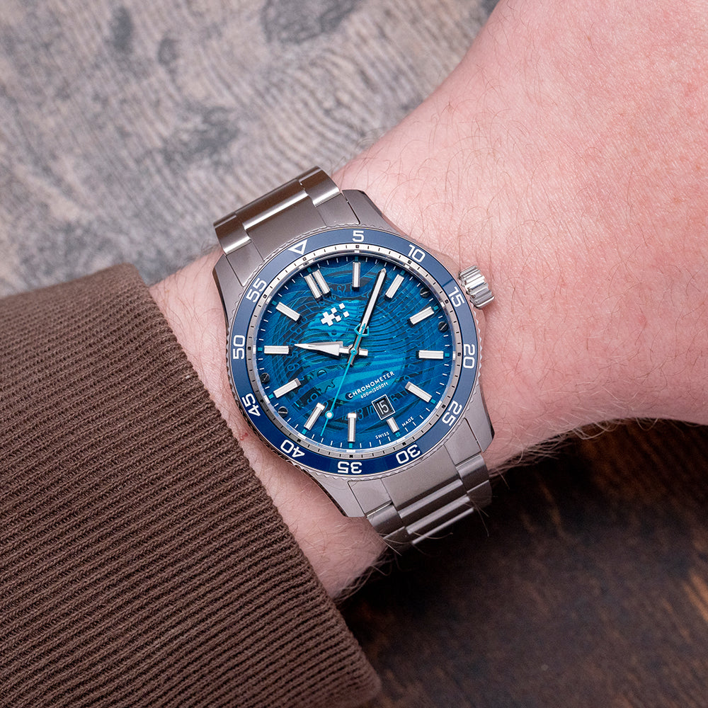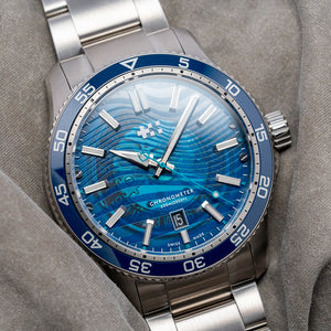 The 2024 Christopher Ward C60 #Tide V4 Logo COSC is made in conjunction with #tide implemented by the Swiss non-profit Jan & Oscar Foundation and the International Union for Conservation of Nature (IUCN). Around Ranong, Thailand, the Moken and other tribes around the region ‘fish’ for ocean plastic, which is converted by #tide ocean material, a social enterprise, into plastic pellets, these are turned into a quality canvas-like material that is perfect for watch straps or a moldable liquid plastic. Both have been applied on the C60 #tide. The 42mm stainless steel Light-catcher™ case has polished and brushed surfaces that transition with crisp edges. A lug-to-lug length of 49mm and a case thickness of 14mm give the watch an impressive wrist presence. On the right side, we have a signed screw-down crown protected by crown guards. The unidirectional stainless steel bezel has a blue zirconia (ZrOÇ) ceramic 60-minute insert with Super-LumiNova® Grade X1 BL C1 numerals. The domed sapphire crystal sits above a striking sapphire blue sapphire dial with a curvy wave pattern in Super-LumiNova® Grade X1 BL across it. The applied bevel-edged baton indexes coated in Super-LumiNova® Grade X1 BL C1 sit above the dial, marking the hours. Broad arrow hands are coated in the same Super-LumiNova® Grade X1 BL C1 and complimented by a blue signature trident counterweighted sweeping second hand. At 6 o’clock, a framed date window with its ring of numbers can be seen through the dial. The bezel numerals, indexes, and hands have a neon glow from the SuperLuminova in the dark when charged. On the reverse, a screw-down case back with the #tide logo embossed in the centre and a ring of the recycled plastic has also been embedded in the case back. Inside an Automatic Sellita SW200-1 COSC, 26 jewels, 28,800 beats per hour. COSC Certified, with a bespoke “Colimaçoné” finishing (a type of twisting sunray graining), and the rotor has a double Twin-flag engraving across it. It comes paired with its original Christopher Ward 22mm quick-release brushed marine-grade stainless steel bracelet with a signed micro-adjusted ratchet clasp for your convenience. It also comes with its Christopher Ward presentation box and papers.