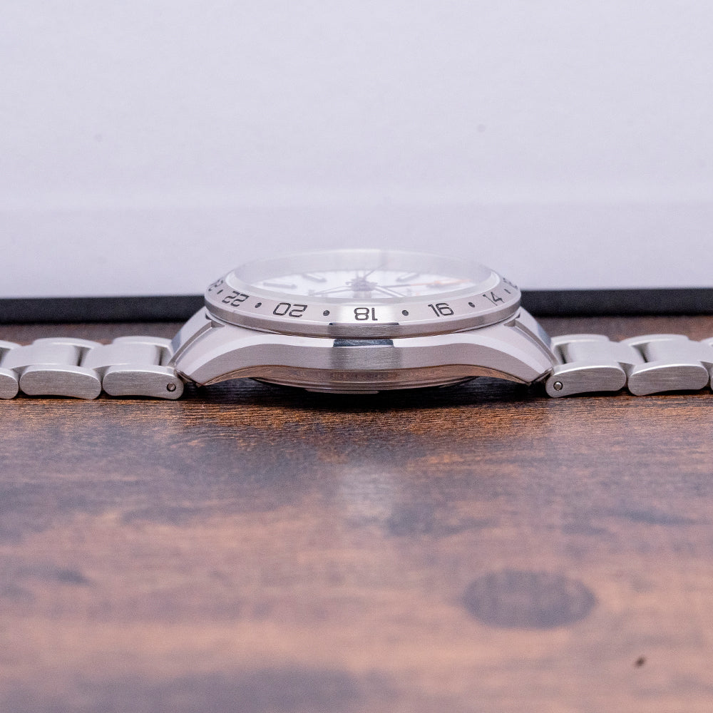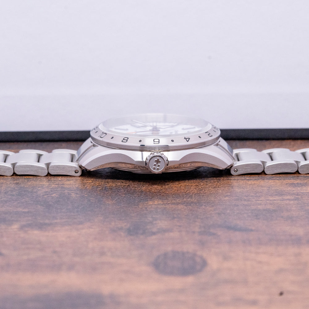 Here we have a 2022 Christopher Ward C63 Sealander GMT that has a 39mm 316L marine-grade stainless steel Light-catcher case that gently curves over your wrist with tapered lugs and a lug-to-lug length of 45.5mm and a case thickness of 12mm, ensuring a comfortable fit. Brushed and polished surfaces transition with crisp edges that play with the light as you rotate your wrist, hence the name. On the right side is a screw-down signed crown with an embossed Christopher Ward motif. A fixed 24-hour brushed bezel has black lacquer-filled numerals and holds an anti-reflective sapphire crystal. The white polished lacquered dial has an outer minute chapter ring with printed Arabic numerals and an orange pip, applied bevel-edged gun-metal diamond polished baton indexes with a strip of Super-LumiNova Grade X1 BL C1 down their centres to mark the hours, the polished edges magically catch the light. At 6 o’clock, a date window. Brushed and polished gun-metal hands are filled with the same luminance complemented by an orange-tipped GMT arrow hand and an orange-tipped sweeping second hand, complete with the characteristic Trident counterweight. Text is precisely applied with a splash of orange at 6 o’clock, indicating its water resistance. This go-anywhere, do-everything watch is perfectly balanced. On the reverse, a screw-down exhibition case back, inside an automatic Sellita SW330-2, 25 jewels, 28,800 beats per hour, with a bespoke “Colimaçoné” finishing (a type of twisting sunray graining). The rotor has a double Twin-flag engraving across it. The watch comes paired with a Christopher Ward 20mm 3-link brushed stainless steel bracelet secured by a signed clasp, all links are provided, and the watch also comes with its Christopher Ward presentation box and papers.