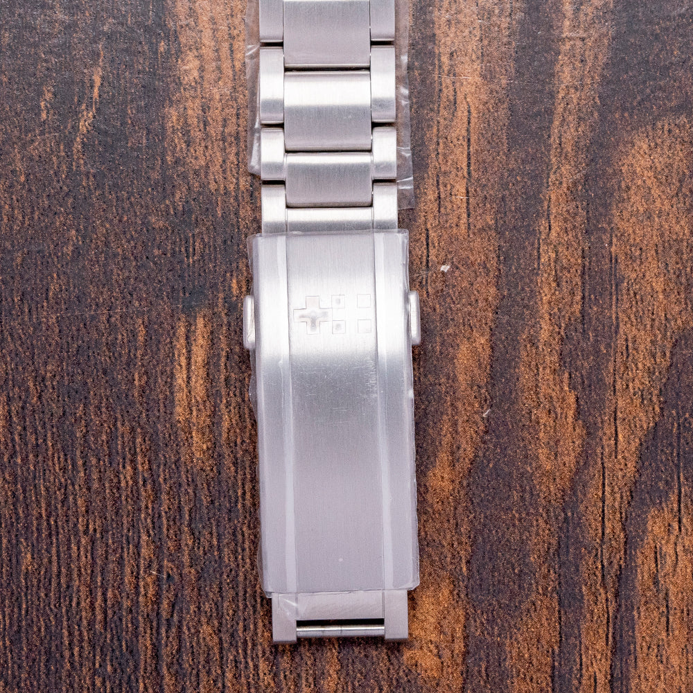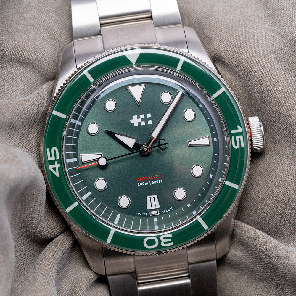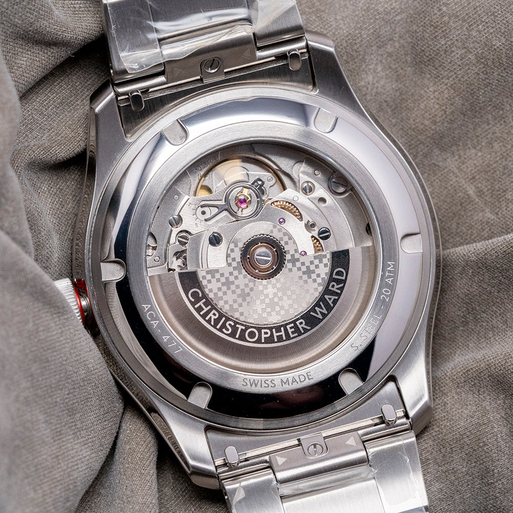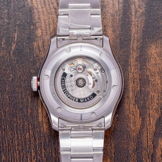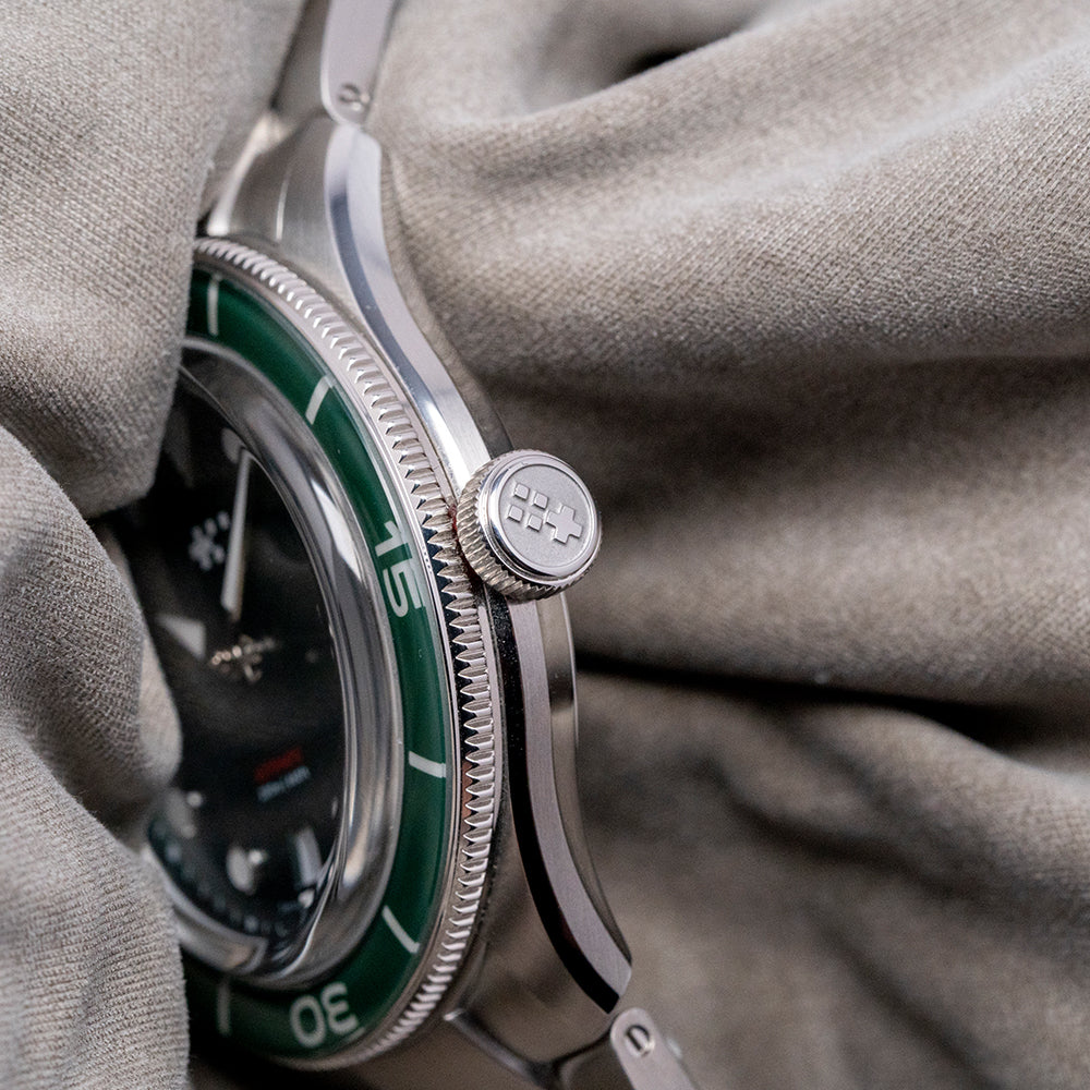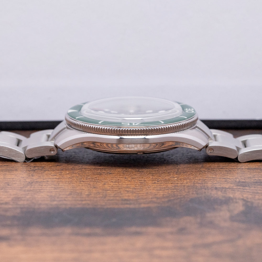 Here we have a 2024 Christopher Ward C65 Aquitaine Auto Green inspired by the early dive watches of the 1950s and the famous Blancpain 50 Fathoms; a 41mm stainless steel case curves over your wrist with tapered lugs, and a lug-to-lug length of 46mm and a case thickness of 12mm give the watch an impressive wrist presence. This striking Christopher Ward’s Light-catcher case features polished and brushed surfaces that transition with crisp edges. On the right side, a screw-down signed crown features a unidirectional bezel with deep knurling for extra grip, a curved sapphire green insert with Super-LumiNova Grade X1 BL lumed 60-minute numerals, and a domed sapphire crystal AR-coated above a matte green dial. An outer minute track features a disc and slender trapezoid indexes filled with Super-LumiNova Grade X1 lume for a vintage aesthetic. At 6 o’clock, a date window, diamond-polished hands filled with the identical Super-LumiNova Grade X1, are complemented by a lollipop trident counterweighted sweeping second hand. At 12 o’clock, we have the Christopher Ward motif; at 6 o’clock, an orange ‘Automatic’ and ‘200m/660ft’ are printed in white underneath, completing this dynamic sports watch. On the reverse, a screw-down exhibition case back engraved with the details of the watch around its edge, inside an automatic Sellita SW200-1, 26 jewels, beating at 28,800 beats per hour. It comes paired with its Christopher Ward 22mm rubber strap with a signed buckle, plus a still stickered 22mm brushed stainless steel bracelet secured by a signed push-button deployant clasp; all links are included, and it comes with a Christopher Ward presentation box and paperwork.