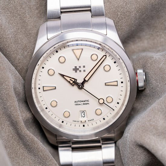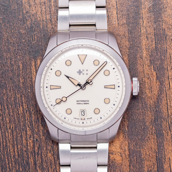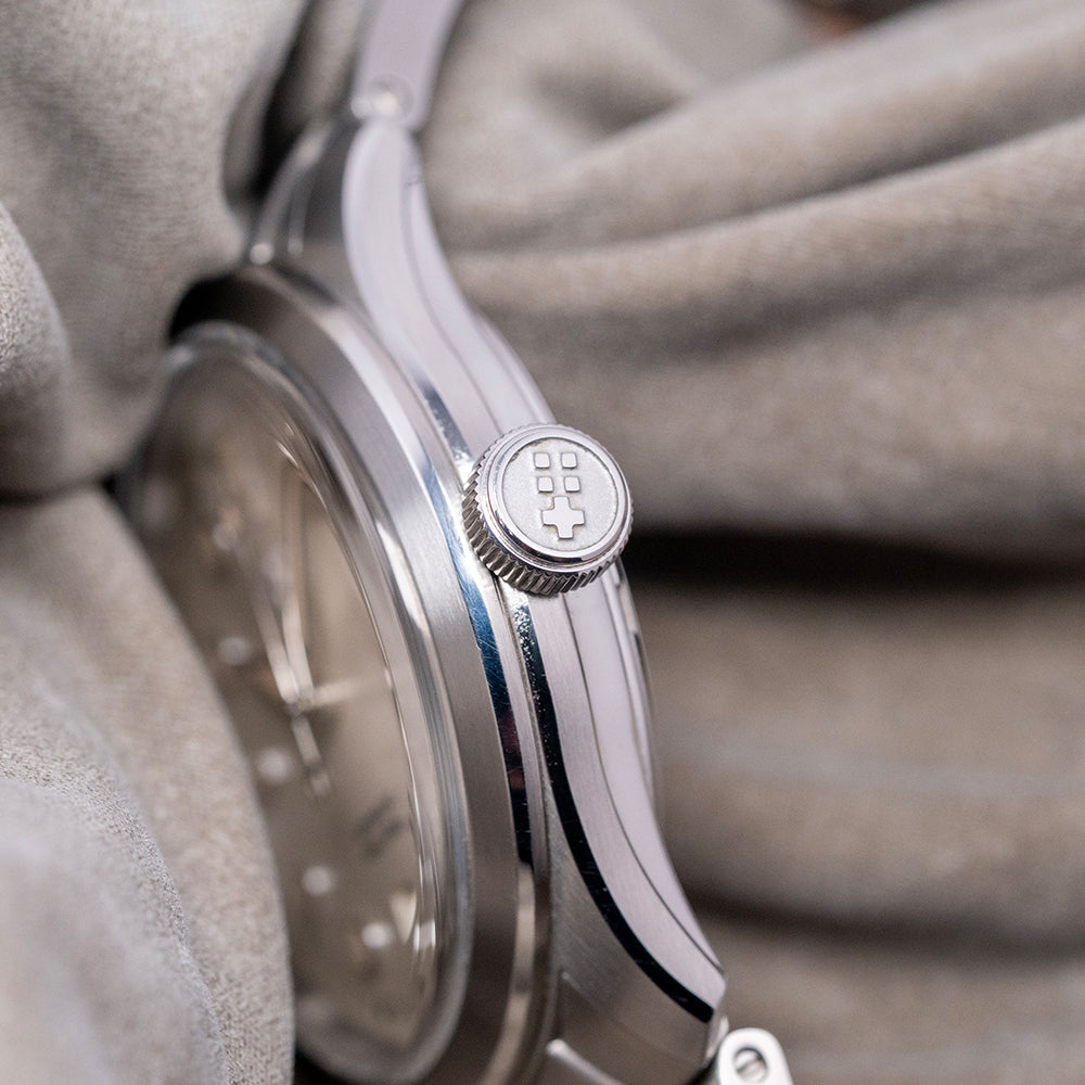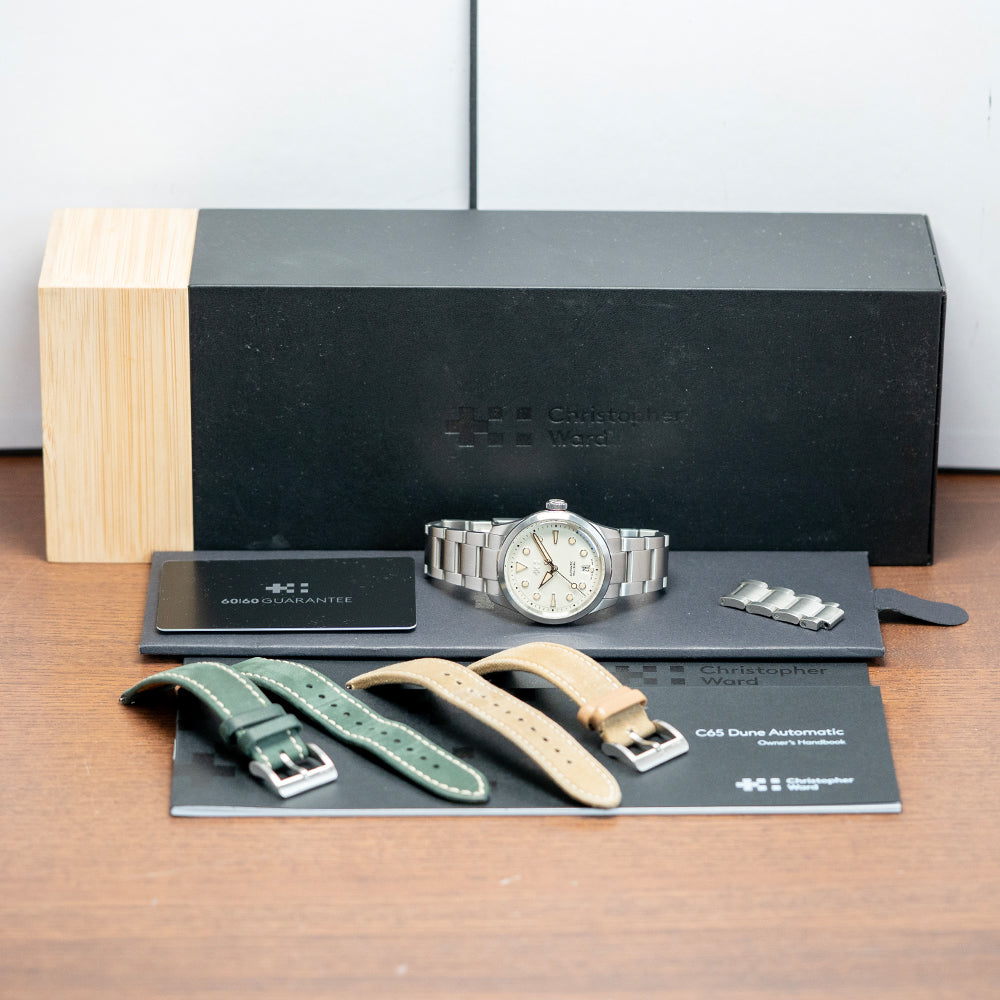 Here we have a 2024 Christopher Ward C65 Dune on a bracelet featuring a curvaceous 38mm 316L marine-grade stainless steel Light-catcher case that has brushed and polished surfaces that transition with crisp edges, catching the light as you rotate your wrist hence the name, a lug-to-lug length of 43.5mm and a case thickness of 11.5mm ensures a comfortable fit, on the right side is a screw-down signed crown with an embossed Christopher Ward Twin Flag motif. A Circular brushed and polished smooth fixed bezel holds an anti-reflective box glass sapphire crystal above the White Sand Dune dial, and an outer minute chapter ring surrounds applied chamfered diamond-polished disc and dagger indexes filled with Super-LumiNova Grade X1 marking the hours. The polished edges catch the light in a magical way, at 6 o’clock, a date window. Brushed and polished hands are filled with the same luminance, complemented by a sweeping second hand complete with the characteristic Trident counterweight. At 12 o’clock, we have the applied Christopher Ward Twin Flag motif with black text at 6 o’clock indicating its water resistance. This go-anywhere, do-everything watch is perfectly balanced. On the reverse, a screw-down exhibition case back with the details of the watch engraved around its edge, inside an automatic Sellita SW200-1, 26 jewels, 28,800 beats per hour, with a bespoke “Colimaçoné” finishing (a type of twisting sunray graining), the rotor has a double Twin-flag engraving across it. It comes paired with its Christopher Ward 20mm Marine-grade brushed stainless steel bracelet with a quick-release for easy changing; all links are included, plus two additional CW straps, and the watch also comes with its Christopher Ward presentation box and papers.