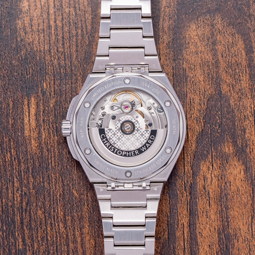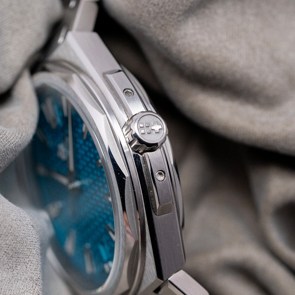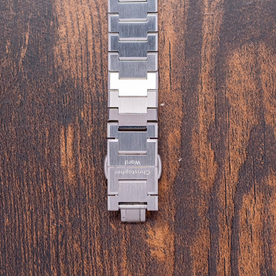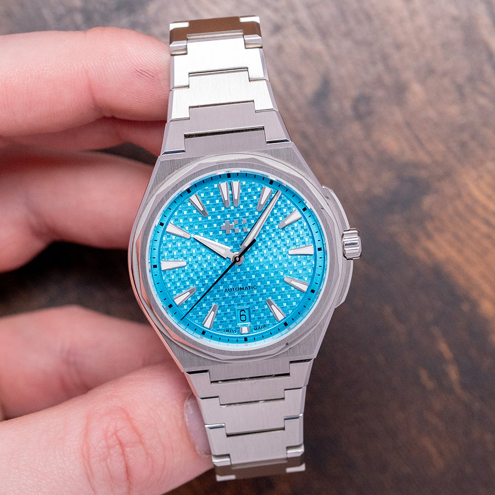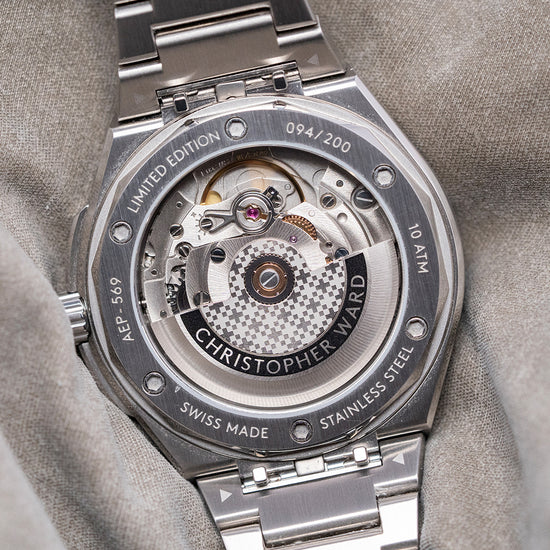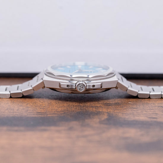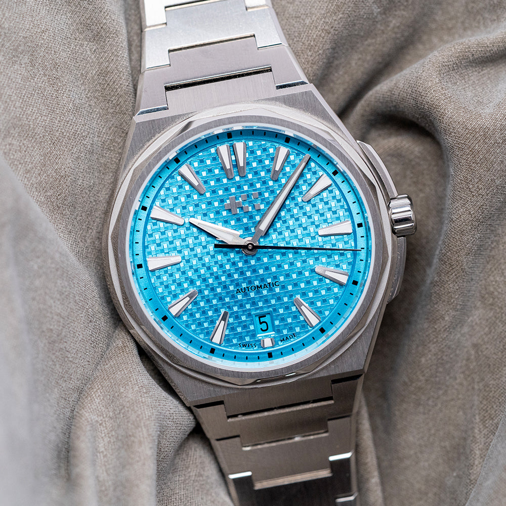 Here we have a 2024 Christopher Ward The Twelve Ice Cream Blue. The Ice Cream collection was released to celebrate International Ice Cream Day on July 21st. Featuring a polished, sandblasted and brushed 40mm stainless steel tonneau-shaped case. Its profile takes many of the design cues from the iconic Patek Philippe Nautilus and Audemars Piguet Royal Oak, flowing seamlessly over your wrist thanks to the integrated bracelet. A lug-to-lug length of 43mm and a case thickness of 10mm give the watch an impressive wrist presence. On the right side, a screw-down, embossed, signed crown is protected by low-profile crown guards. The stepped, brushed, and sandblasted dodecagonal bezel features a polished 12-sided scalloped edge, holding a sapphire crystal AR-coated above a dynamic three-dimensional stamped Ice Cream Blue dial of repeating ‘pluses’ from the twin flag. An outer minute chapter ring surrounds applied brushed and facet diamond-polished dagger indexes filled with Super-LumiNova Grade X1 BL C1 marking the hours; at 6 o’clock, we have a colour-matched date window. Brushed and diamond-polished sword hands filled with the same lume are complemented by a tapered, sweeping second hand. The various surfaces play magically with the light as you rotate your wrist. At 12 o’clock, an applied Christopher double flag motif, and at 6 o’clock, “Automatic” completes this striking, versatile sports watch. On the reverse is a screw-down exhibition case with the details around its edge inside an automatic Sellita Cal. SW200-1, 26 jewels, 28,800 beats per hour, a robust and reliable movement, with a bespoke “Colimaçoné” finishing (a type of twisting sunray graining), and the rotor has a double Twin-flag engraving across it. It comes paired with its 23mm stainless steel integrated bracelet, innovative quick-release system, and a signed concealed butterfly clasp; all links included, plus a 23mm integrated Christopher Ward blue rubber strap and signed pin buckle. The watch also comes with its Christopher Ward presentation box and papers.