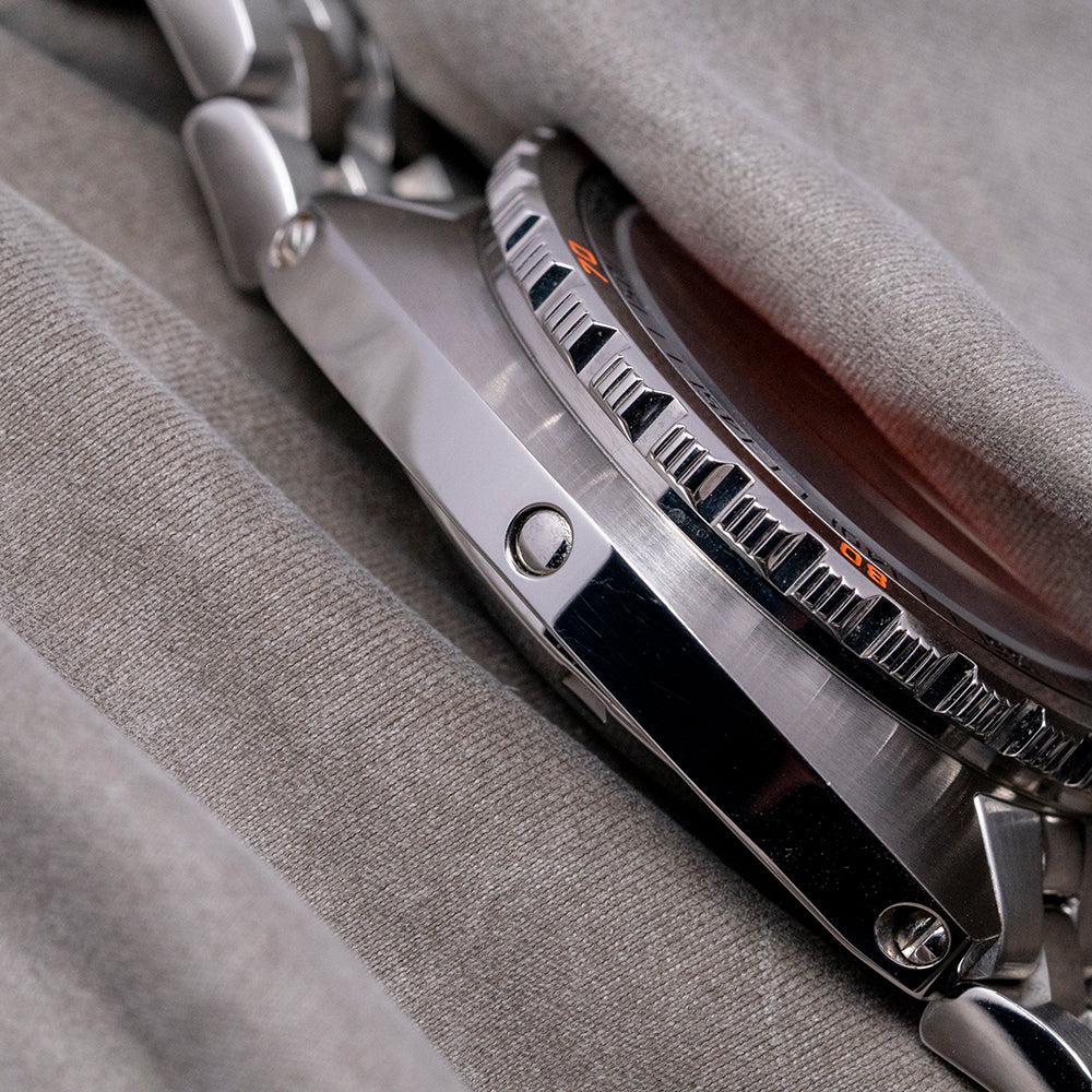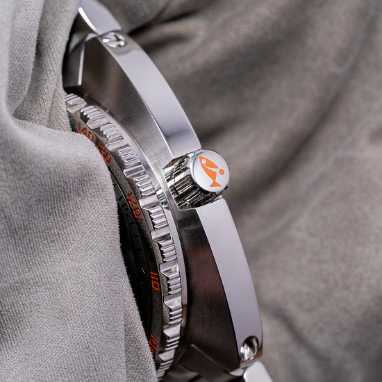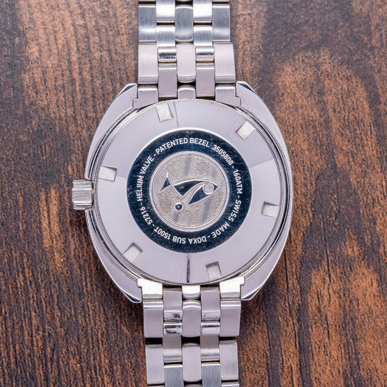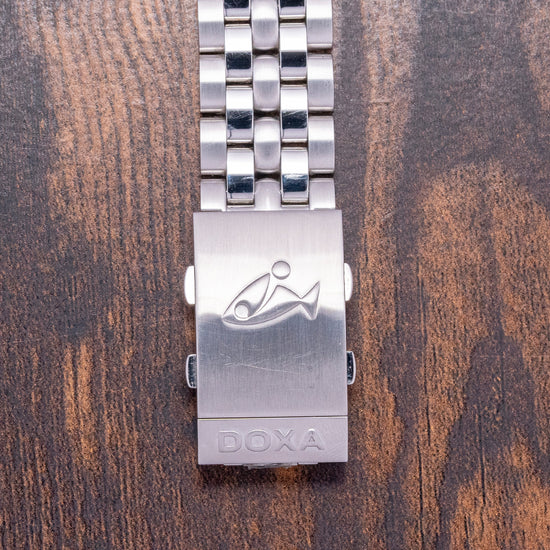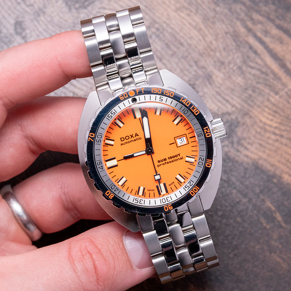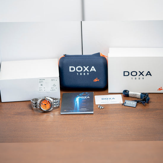 Here we have a 2024 Doxa SUB 1500T Professional Orange paying tribute to their 1968 SUB 300T Conquistador, which was the first publicly available dive watch with a Helium escape valve and patented bezel. The 45mm C-shaped 316L stainless steel case sits on the wrist like a cushion. This case was designed and developed in 1968 by Urs Eschle, who was the product manager and his team, polished sides and brushed top surfaces transitioned with crisp edges towards the stubby lugs. A lug-to-lug length of 47mm and a case thickness of 16mm give the watch an impressive presence on the wrist. At 3 o’clock a screw-down crown that fits recessed into the side of the case for protection and is signed with an orange DOXA fish, on the left side at 9 o’clock we have the integrated Helium escape valve, the patented unidirectional bezel has the U.S. Navy No Decompression scales, with an outer depth scale in feet in orange and the minute scale in black, to allow divers to gauge how much air was left in their tanks. The boxed sapphire crystal sits above the iconic orange dial, and large double baton indexes with SuperLumiNova down their centres mark the hours. At 3 o’clock, a framed date window, featuring a small black hour hand and a larger black minute hand, is complemented by a black second hand with a black square counterweight filled with SuperLumiNova. This colour combination is highly visible when diving. A crosshair on the dial features text on the upper left side, with “DOXA” and “automatic” printed, and on the lower right side, “SUB 1500T” and “Professional”. On the reverse, a screw-down case back with the details of the watch engraved around its edge and the DOXA motif on top of waves in bas-relief in the centre, inside a Swiss automatic movement. It comes paired with its 20mm 316L stainless steel 5-link bracelet, featuring brushed and polished finishing, secured with screws. The watch also has a push-button release folding signed deployant clasp with a dive extension. Additionally, it includes a Doxa presentation box, swing tag, and papers.