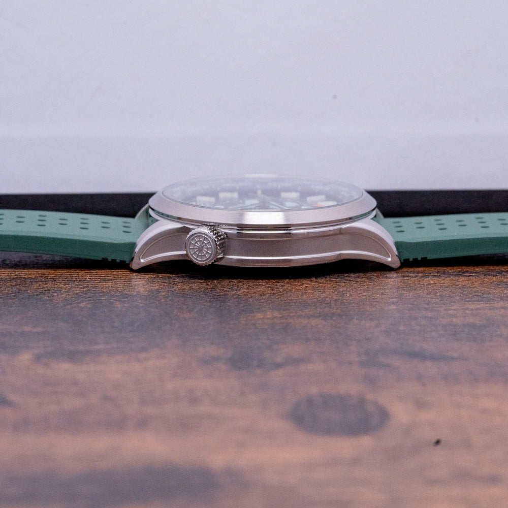 This watch is sold with its original Farer Box, travel case, swing tag, and Paperwork. It comes paired with a 20mm quick-release green 20mm Farer Tropic rubber strap plus a 20mm 3-link Farer brushed stainless steel bracelet secured with a push-button-released butterfly clasp; all links are provided. The watch is from February 2024 and is in fantastic condition, as you can see from the photos. It also comes with its Manufacturer Warranty.