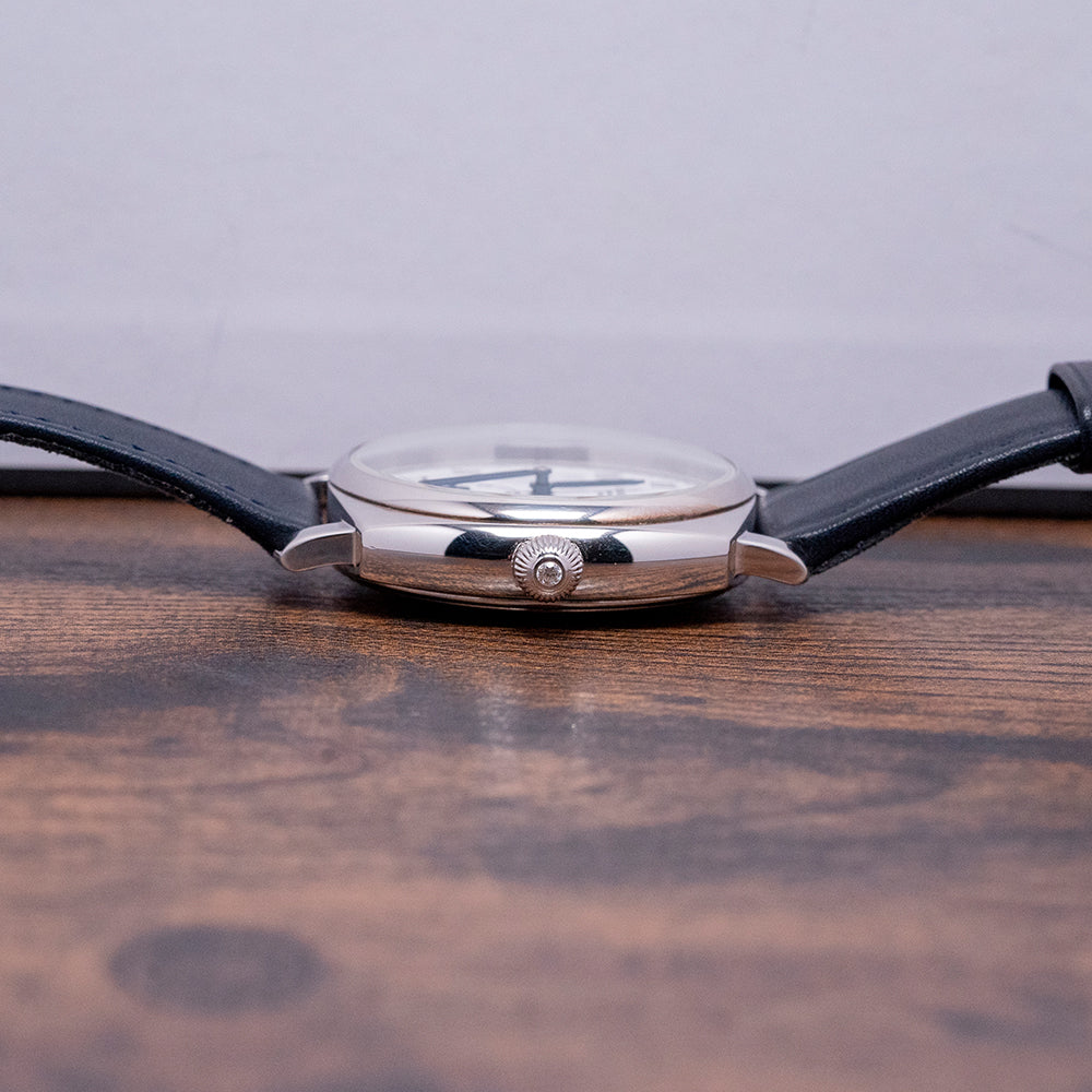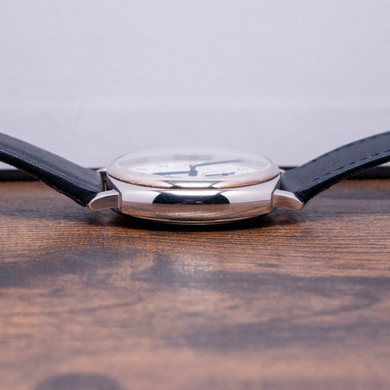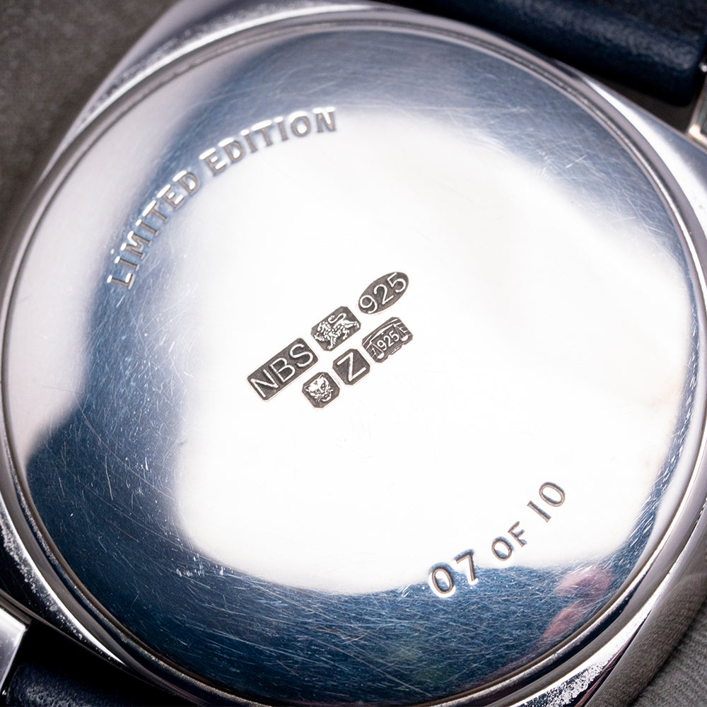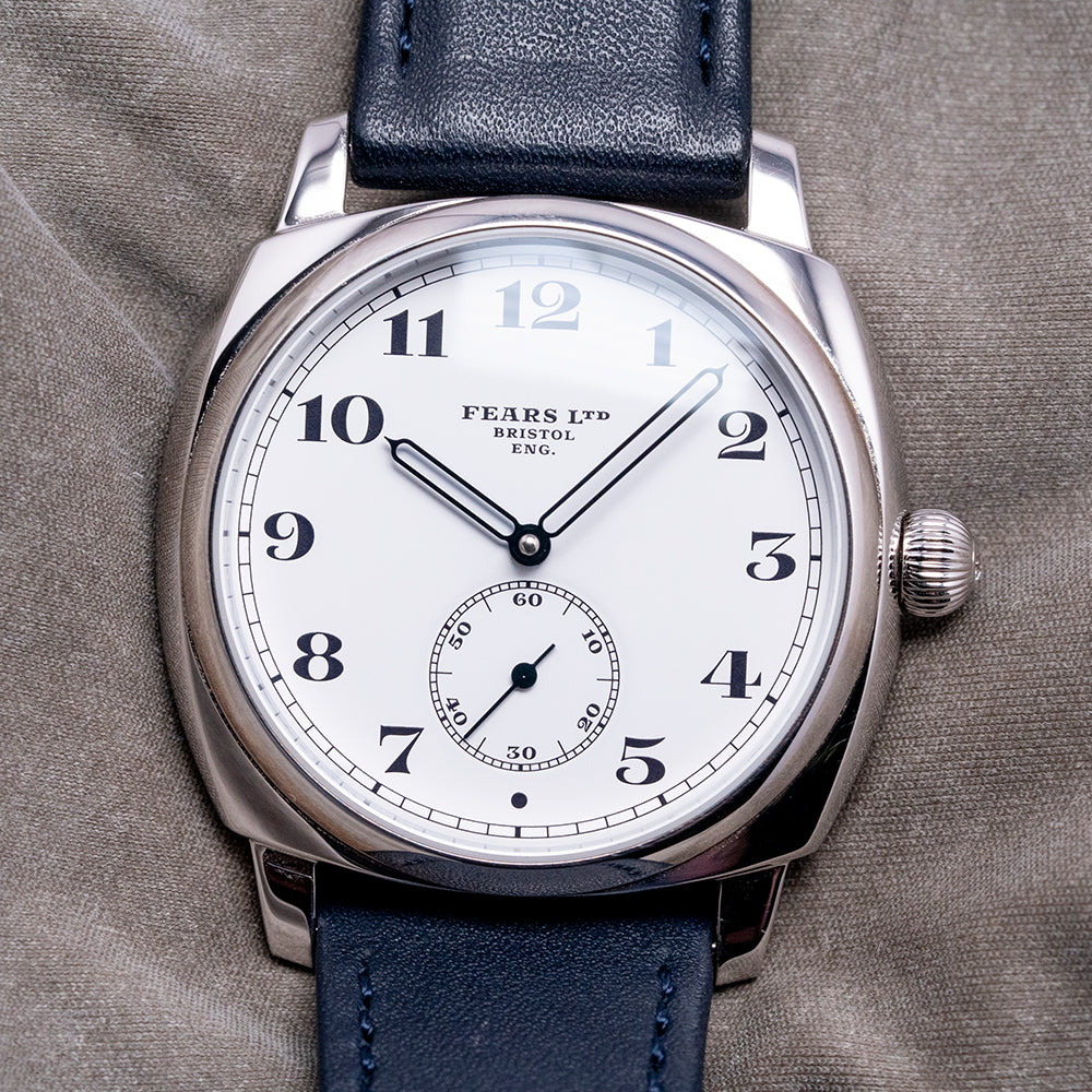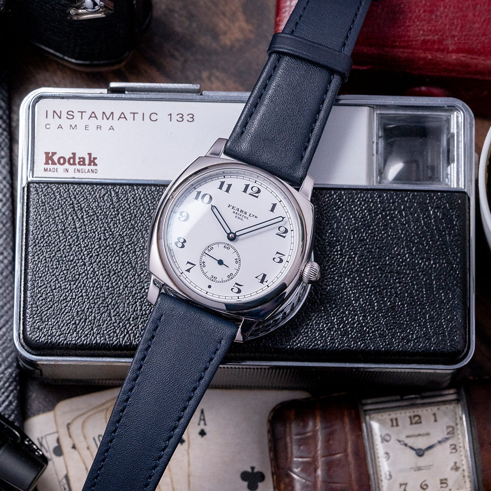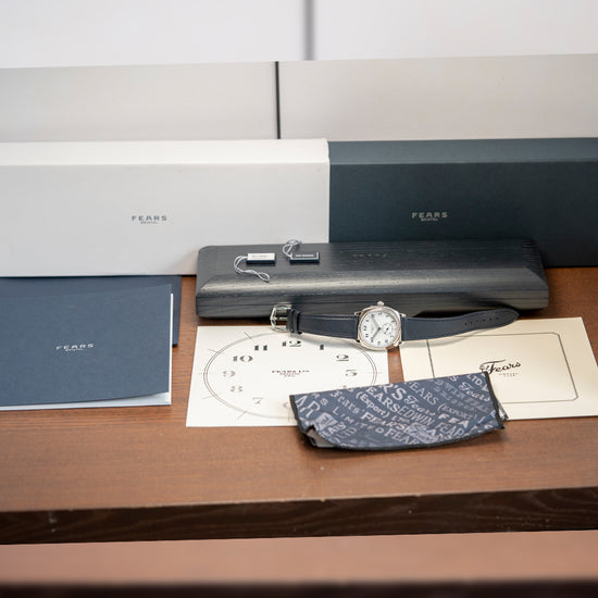 Here we have the stylish 2024 Fears Brunswick 38 '1924 Edition' Sterling Silver White Limited, with just 10 pieces. This watch celebrates the 100th Anniversary of Fears. Each piece has a unique serial number engraved between the lugs at 12 o’clock; this number can be used to identify the watch's history in its master database. The inspiration for this watch case comes from a Fears watch, originally made in 1924. The 38mm cushion case begins life as a solid block of 925 Sterling Silver and is polished to a deep shine, achieving a mirror-like finish. Its curved flanks lead to a lug-to-lug length of 43mm and a case thickness of 12mm, ensuring a comfortable fit on your wrist. On the right side, a traditional polished 925 sterling silver “onion” shaped crown with a diamond set inside. A domed sapphire crystal ARdur coated inside and out sits above an incredible hand-polished white lacquer dial. An outer minute rail track surrounds numerals in crisp white, inspired by the 1924 Fears archive. Each set of Fears-shaped hands is subtly skeletonised before being blued using vapour deposition. At 6 o’clock, a sub-second complete with a blued stick hand. At noon, we have the Fears motif completing this striking dress watch. On the reverse, we have a solid 925 Sterling Silver case back with the London Assay Office hallmark. Inside, we have a manually wound LJP Cal. D100, 18 jewels, 21,600 beats per hour. It comes paired with its 20 mm Fears leather strap and 925 Sterling Silver pin buckle, London Assay Office hallmarks. The Fears Brunswick 38 'Silver Noir' is presented in a slim wooden box, including its Fears paperwork.