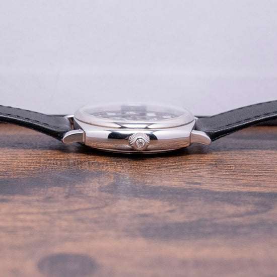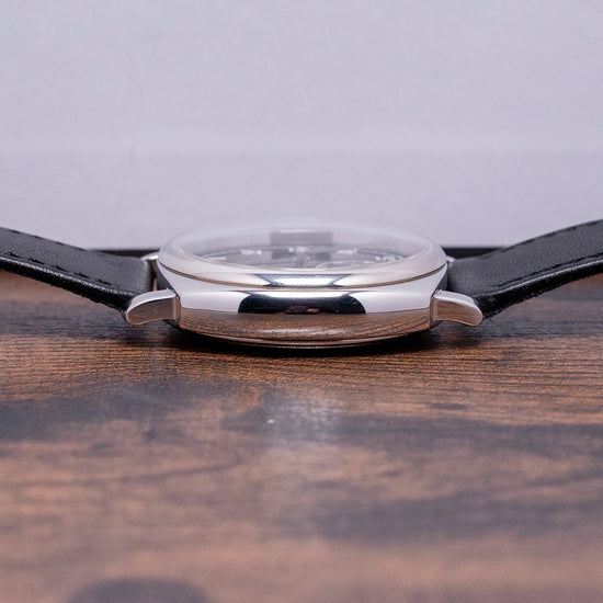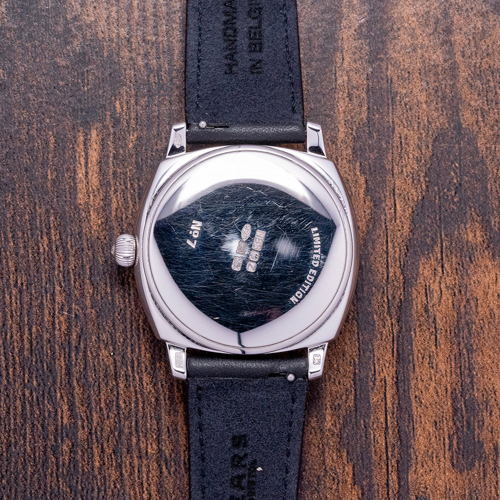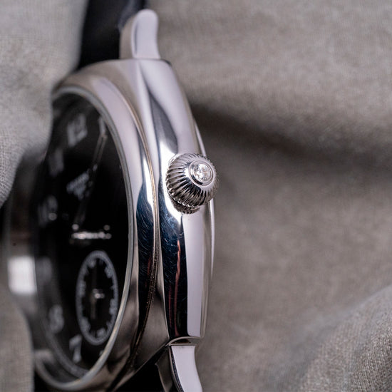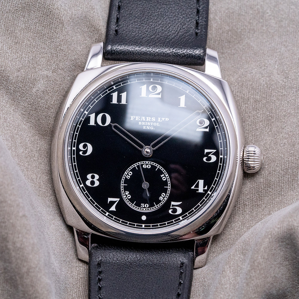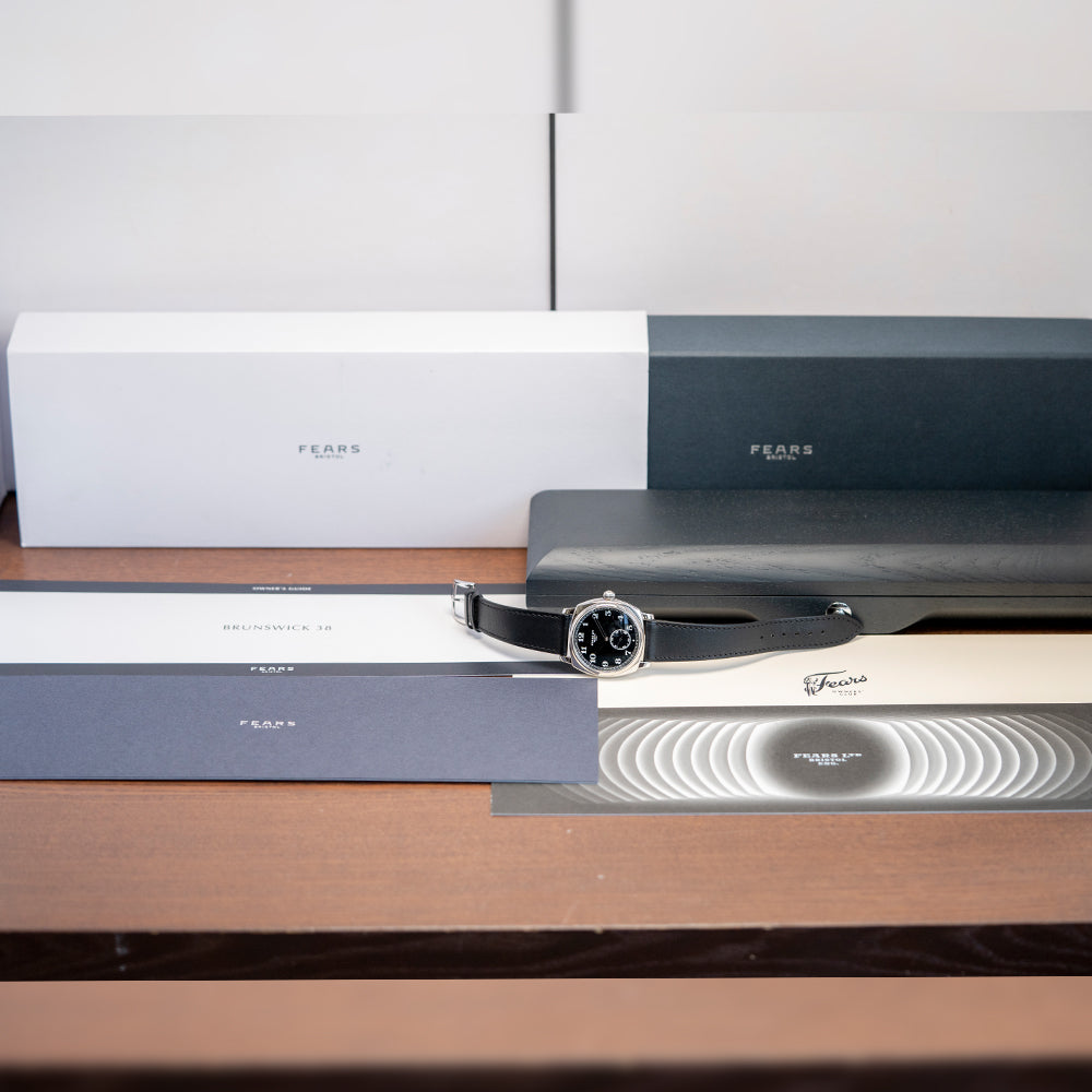 Here we have the stylish 2024 Fears Brunswick 38 'Silver Noir' 925 Sterling Silver Black Limited, with 20 pieces produced in total. Each piece has a unique serial number engraved between the lugs at 12 o’clock; this number can be used to identify the watch's history in its master database. The inspiration for this watch case comes from a Fears watch, originally made in 1924. The 38mm cushion case begins life as a solid block of 925 Sterling Silver and is polished to a deep shine, achieving a mirror-like finish. Its curved flanks lead to a lug-to-lug length of 43mm and a case thickness of 12mm, ensuring a comfortable fit on your wrist. On the right side, a traditional polished 925 sterling silver “onion” shaped crown with a diamond set inside. A domed sapphire crystal ARdur coated inside and out sits above an incredible hand-polished black lacquer dial. An outer minute rail track surrounds numerals in crisp white, inspired by the 1920s Fears archive. Each set of Fears-shaped hands is subtly skeletonised before being coated in rhodium and polished. At 6 o’clock, a sub-second complete with a rhodium stick hand. At noon, we have the Fears motif completing this striking dress watch. On the reverse, we have a solid 925 Sterling Silver case back with the London Assay Office hallmark. Inside, we have a manually wound LJP Cal. D100, 18 jewels, 21,600 beats per hour. It comes paired with its 20 mm Fears Black leather strap and 925 Sterling Silver pin buckle, London Assay Office hallmarks. The Fears Brunswick 38 'Silver Noir' is presented in a wooden box including its Fears paperwork.