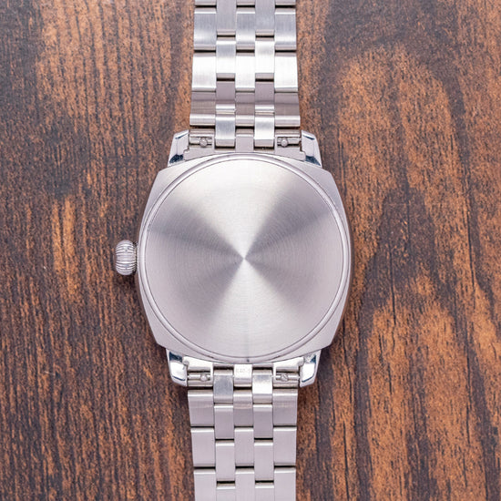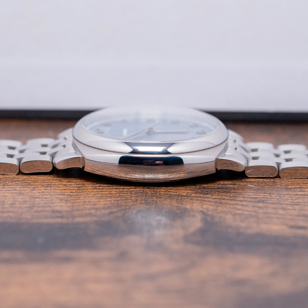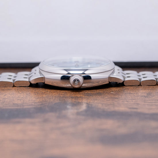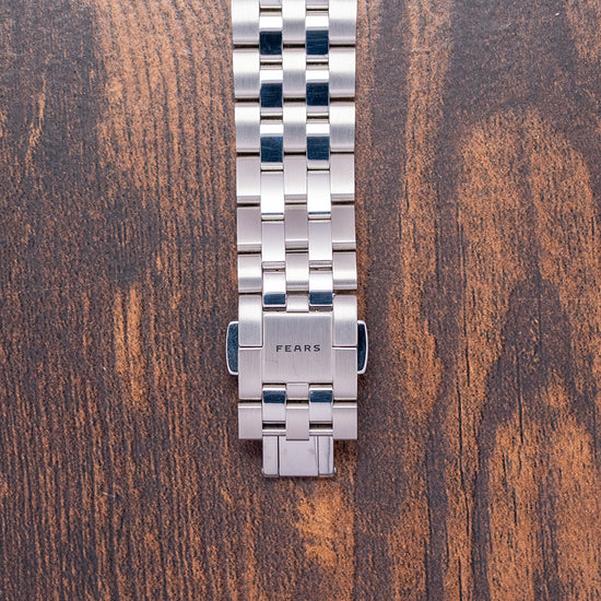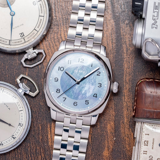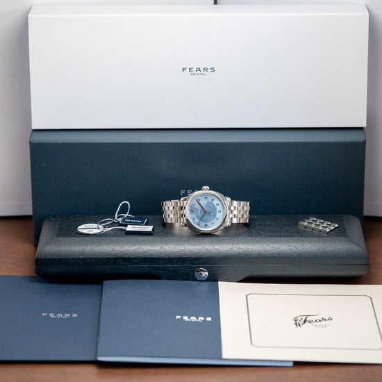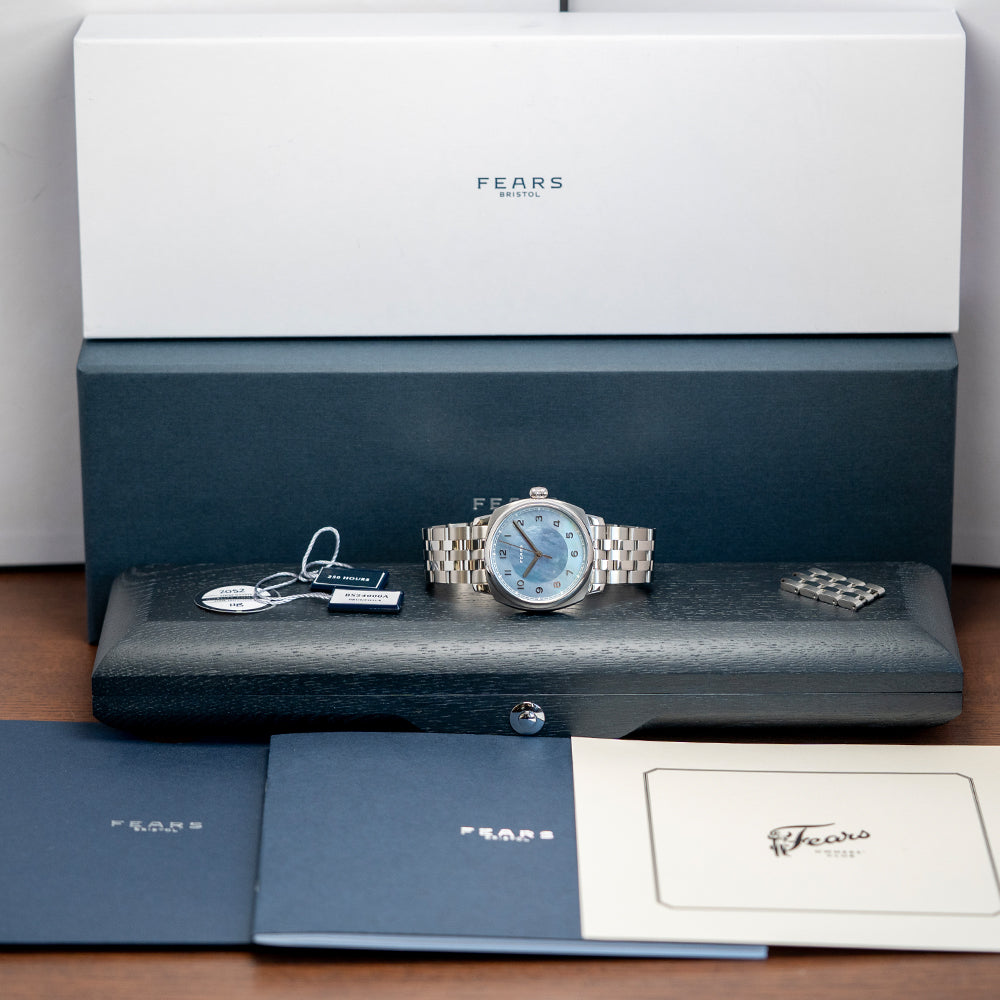 Here is the stylish 2024 Fears Brunswick 40 Aurora Mother of Pearl on a Bracelet. Each piece has a unique serial number engraved between the lugs at 12 o’clock; this number can be used to identify the watch's history in its master database. The inspiration for this watch case comes from a Fears watch, originally made in 1924. The 40mm brushed and polished stainless steel cushion case sits comfortably on your wrist, thanks to its short, straight lugs. Its curved flanks lead to a lug-to-lug length of 46mm and a case thickness of 12mm, ensuring a comfortable fit on your wrist. On the right side, a traditional polished “onion” shaped screw-down crown. A domed sapphire crystal, ARdur-coated inside and out, sits above an incredible blue mother-of-pearl dial composed of two pieces. An outer minute rail track surrounds applied numerals in a custom ‘Edwin’ typeface, made of polished brass and coated in Rhodium. Each set of Fears hands is made of polished brass, bevelled and coated in Rhodium and complemented by a Fears pipette counterweighted second hand. At noon, we have the Fears motif completing this striking dress watch. On the reverse, we have a solid screw-down case back. Inside, we have an automatic La Joux-Perret Cal. G101, 24 jewels, 28,800 beats per hour, featuring hand-winding and hacking seconds. It comes paired with its brushed and polished 20mm Fears quick-release five-link Stainless Steel bracelet; all links are included. The Fears Brunswick 40 Aurora Mother-of-Pearl is presented in a slim Fears presentation box with swing tags and its Fears paperwork.