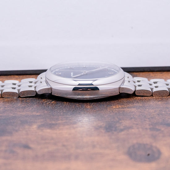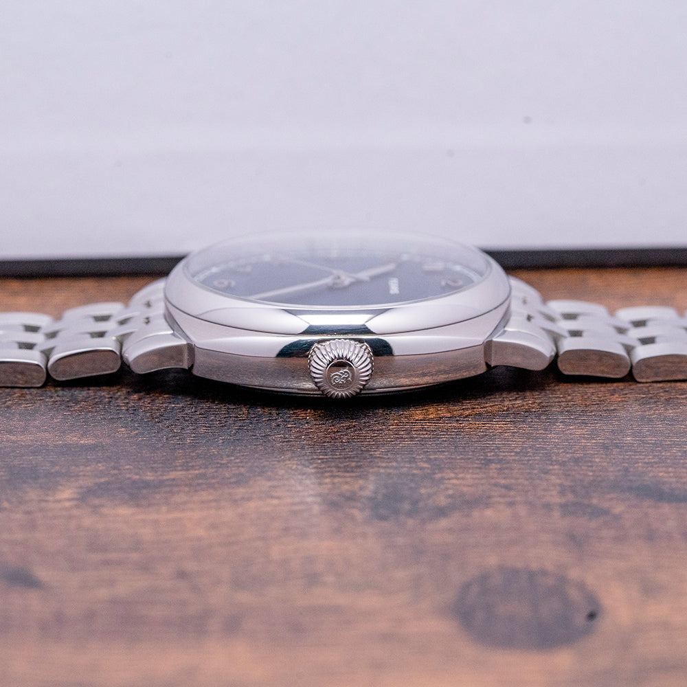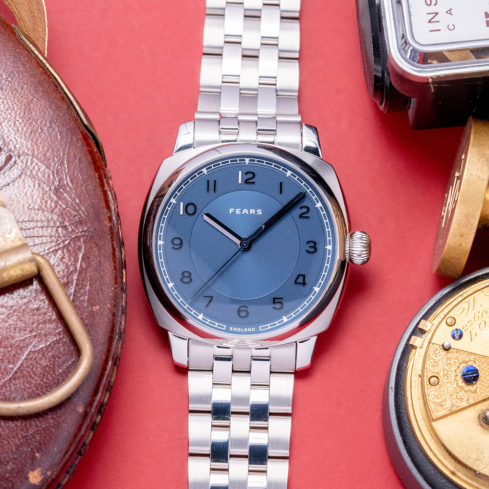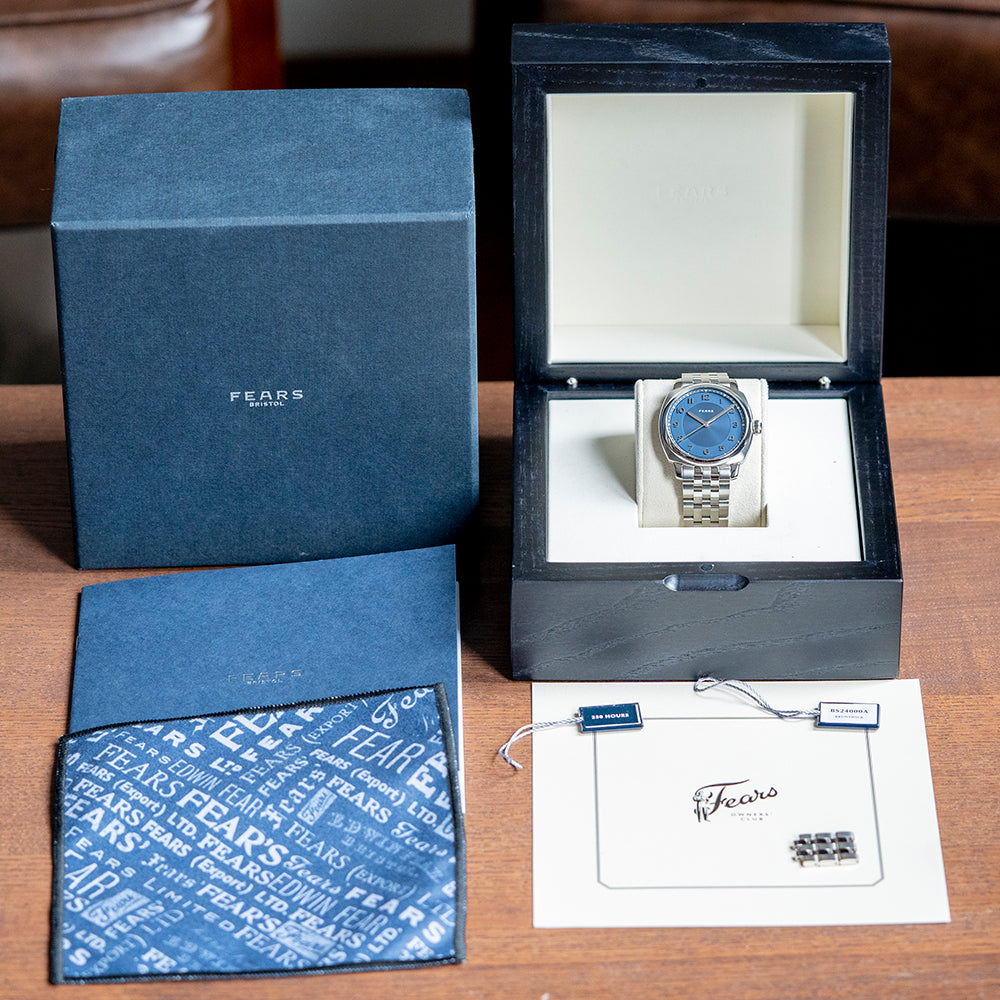 Here we have a 2024 Fears Brunswick 40 Blue Automatic, now Discontinued, which features a 40mm 316L stainless steel cushion case that creates a sportier and more contemporary wrist presence. The subtle curve of the case leads to thick lugs with a lug-to-lug length of 46mm and a case thickness of 12mm, ensuring a comfortable fit on your wrist. Polished and brushed surfaces transition with elegant lines. We have an onion-style crown on the right side for that vintage appeal, and a polished smooth bezel holds a domed sapphire crystal AR coated on both sides. This striking blue dial has an expertly hand-brushed vertical finish with a sunken centre and is decorated in a fine concentric CNC Guilloché pattern, a minute track precisely executed with triangular markers at hourly intervals. The rich blue hues are derived from a galvanic blue coating that changes in the light as you rotate your wrist, giving it a two-tone appearance, and applied CNC-milled and diamond-polished “Edwin” Arabic numeral indexes coated in Rhodium mark the hours. The hands are now solid “pipette-shaped” with their distinctive profile and tip, the hands and second hand are Rhodium plated with a diamond-cut bevel running down its centre and polished to a mirror shine. A polished second hand with the “Fears pipette” counterbalance completes this dynamic, perfectly balanced timepiece. At 12 o’clock, we have the Fears motif completing this dynamic, perfectly balanced timepiece. On the reverse, a milled solid stainless steel case back, inside an automatic ETA 2824-2, 25 jewels 28,800 beats per hour, and the date mechanism has been removed and replaced with a 2-position click fitted, decorated in Côte de Genève and blued screws, the custom rotor features the decorative “Bristol Flower”. The watch is fitted on a bespoke, easy-release, five-link, 20mm bracelet made of milled stainless steel, its flush fitting gives it an integrated aesthetic, and the alternating polished and brushed finishing complements the case finishing. The bracelet is secured to the wrist with a push-button release butterfly clasp, which, when opened, shows a decorative “Bristol Flower” motif. The Brunswick Fears Blue 40 is presented in a bespoke wooden box crafted in Britain from English Ash, which is stained Fears Blue, lined in genuine cream suede, the watch sits proudly on a special cushion.