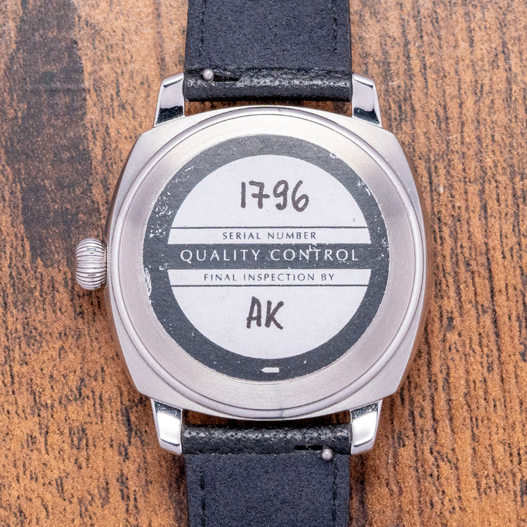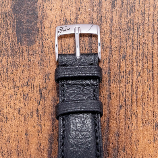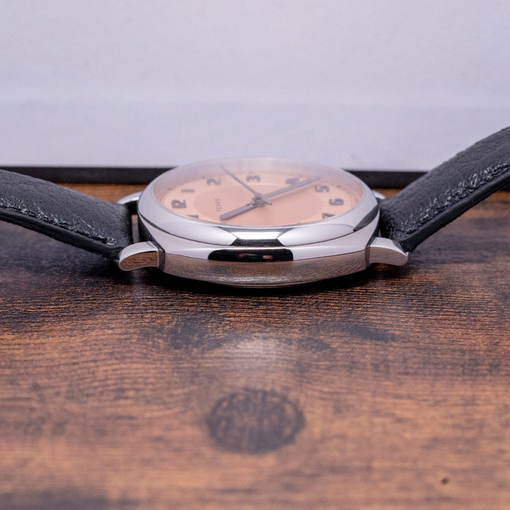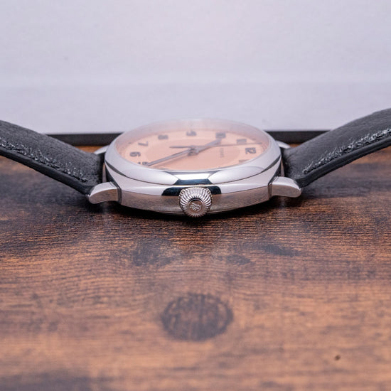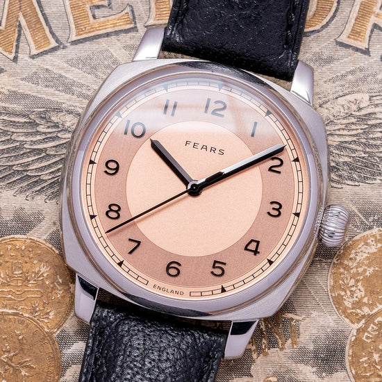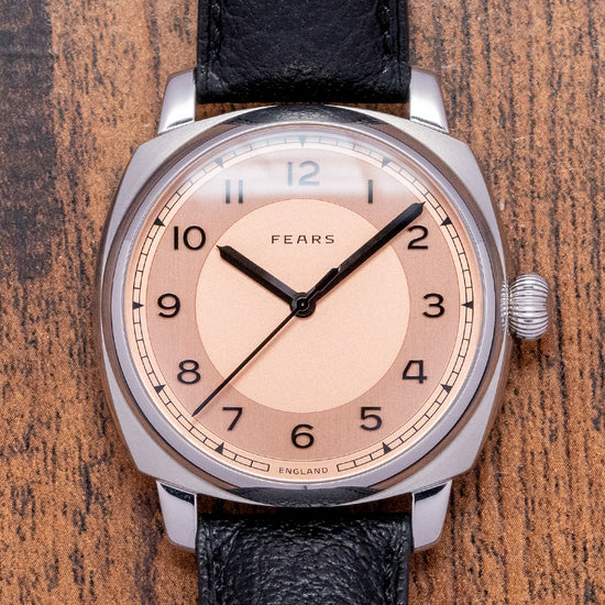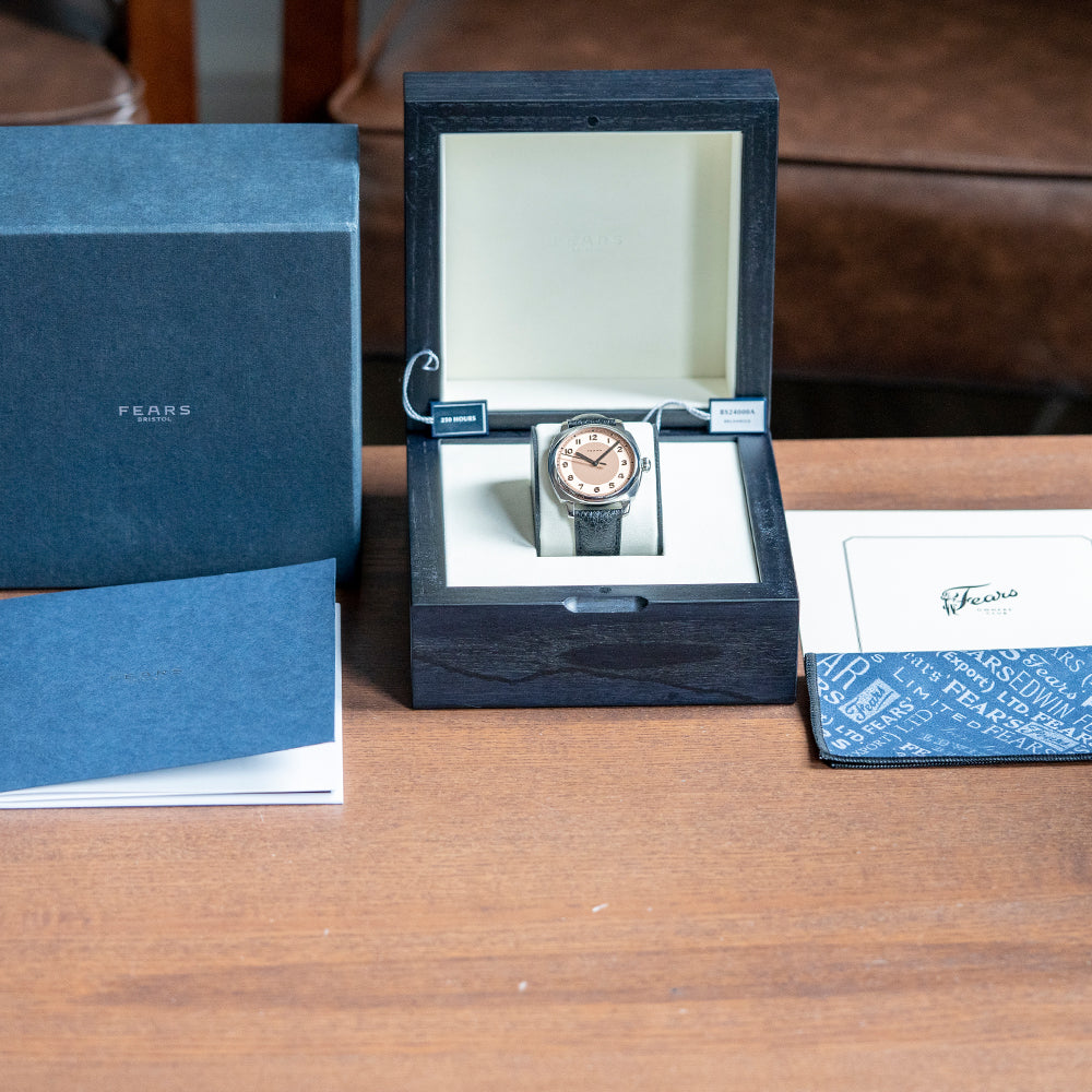 Here we have a 2024 Fears Brunswick 40mm Copper Salmon Automatic, which features a 40mm 316L stainless steel cushion case that creates a sportier and more contemporary wrist presence. The subtle curve of the case leads to thick lugs with a lug-to-lug length of 46mm and a case thickness of 12mm, ensuring a comfortable fit on your wrist. Polished and brushed surfaces transition with elegant lines. We have an onion-style screw-down crown on the right side for that vintage appeal, and a polished smooth bezel holds a domed sapphire crystal AR coated on both sides. This striking Copper Salmon dial made in Germany has an expertly hand-brushed vertical finish with a sunken centre decorated in a fine sandblasted texture, a minute track precisely executed with triangular markers at hourly intervals. This special dial was first used on Fears watches of the 1940s and 50s. This rich tone is created using galvanic coatings of 18ct rose gold and copper, making each dial unique and allowing it to catch the light in a beautiful, subtle way, and applied CNC-milled and diamond-polished “Edwin” Arabic numeral indexes coated in black gold mark the hours. The hands are now solid “pipette-shaped” with their distinctive profile and tip; the hands and second hand are coated in black gold with a diamond-cut bevel running down its centre and polished to a mirror shine. At noon, the Fears motif completes this dynamic, perfectly balanced timepiece. On the reverse, a milled solid stainless steel case back, inside an automatic La Joux-Perret Cal. G101, 24 jewels 28,800 beats per hour, with the date mechanism removed. La Joux-Perret designed and manufactured this quality movement in La Chaux-de-Fonds, Switzerland. The watch is fitted on a 20mm Fears Raven Black buffalo leather strap lined in blue-dyed Alcantara and secured by a Fears Cypher signed pin buckle. The Brunswick Fears Blue 40 is presented in a slim, bespoke wooden box crafted in solid Ash, stained with Fears Blue and lined in genuine cream suede. The watch sits proudly on a special cushion.