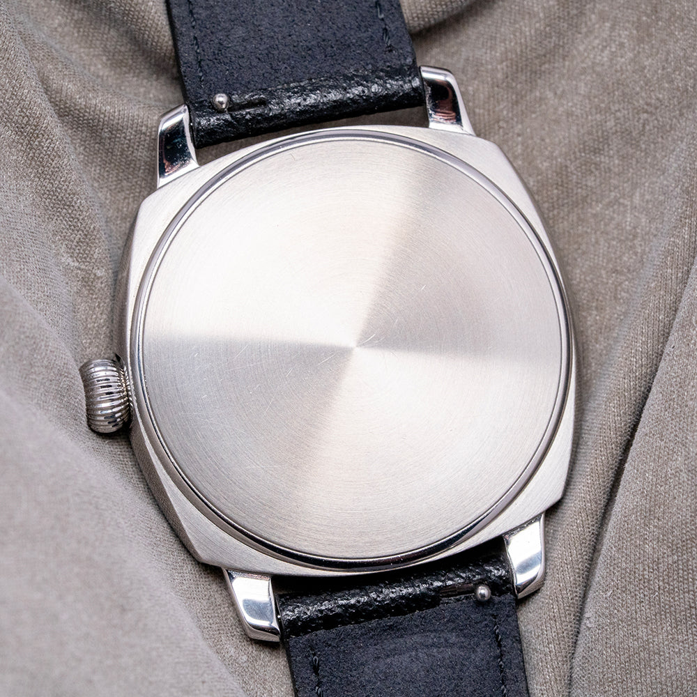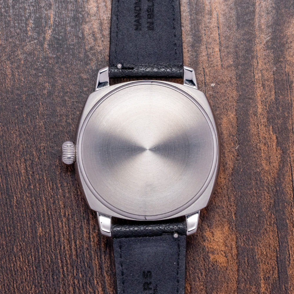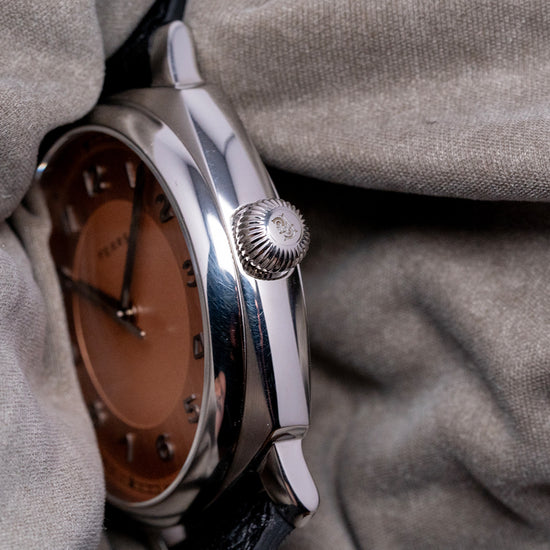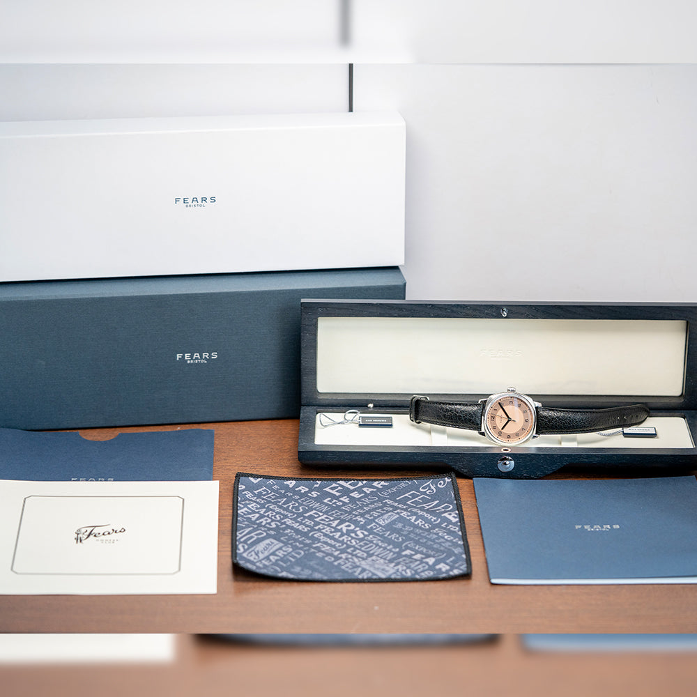 Here we have a 2024 Fears Brunswick 40mm Copper Salmon automatic, which features a 40mm 316L stainless steel cushion case that creates a sportier and more contemporary wrist presence. The subtle curve of the case flanks leads to thick straight lugs with a lug-to-lug length of 46mm and a case thickness of 12mm, ensuring a comfortable fit on your wrist. Polished and brushed surfaces transition with elegant lines. We have an onion-style screw-down crown on the right side for that vintage appeal, and a polished, smooth bezel holds a domed sapphire crystal AR-coated on both sides. This striking Copper Salmon dial is hand-brushed with a vertical finish and has a sunken centre decorated in a fine sandblasted texture. A minute track precisely executed with triangular markers at hourly intervals. This special dial was first used on Fears watches of the 1940s and 50s. This rich tone is created using galvanic coatings of 18ct rose gold and copper, making each dial unique and allowing it to catch the light in a beautiful, subtle way and applied CNC-milled and diamond-polished “Edwin” Arabic numeral indexes coated in black gold mark the hours. The hands are now solid “pipette-shaped” with their distinctive profile and tip; the hands and second hand are coated in black gold with a diamond-cut bevel running down their centre and polished to a mirror shine. At noon, the Fears motif completes this dynamic, perfectly balanced timepiece. On the reverse, a milled solid stainless steel case back, inside an automatic La Joux-Perret Cal. G101, 24 jewels, 28,800 beats per hour, with the date mechanism removed. La Joux-Perret designed and manufactured this quality movement in La Chaux-de-Fonds, Switzerland. The watch is fitted on a 20mm Fears Raven Black buffalo leather strap lined in blue-dyed Alcantara and secured by a Fears Cypher signed pin buckle. The Brunswick Fears Blue 40 is presented in a slim, wooden box and includes its Fears paperwork.