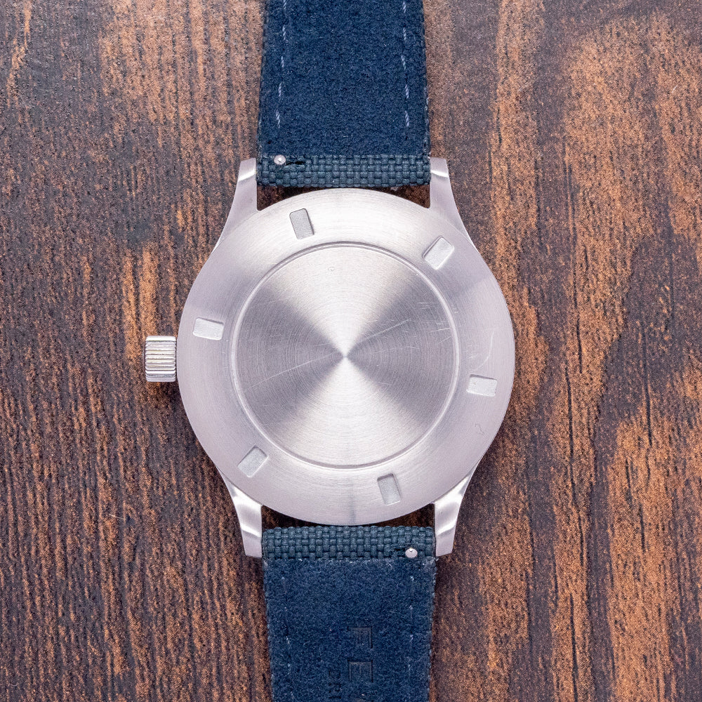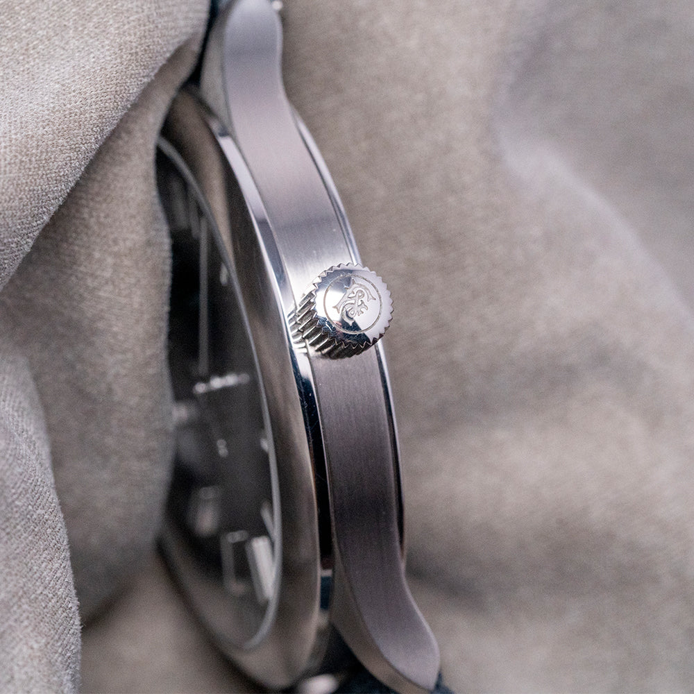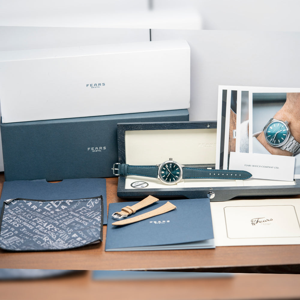Here we have a special 2024 Fears Redcliff Date Mallard Green 'Boutique Only Edition', named after the street in Bristol where Fears was founded. Its 39.5mm polished and brushed stainless steel case curves over your wrist with tapered lugs. The brushed flanks lead to a lug-to-lug length of 46mm and a case thickness of 10.5mm, ensuring a comfortable fit. On the right side is a signed coin-edged screw-down crown. The polished smooth bezel holds a domed sapphire crystal Ar coated above a striking Mallard Green sunburst dial. An outer minute chapter ring surrounds applied baton indexes are diamond polished and coated in Rhodium filled with X1-Grade Super-LumiNova marking the hours; at 3 o’clock, a colour-matched date window, the signature Fears hands are diamond polished coated in Rhodium and filled with the same lume, at 12 o’clock we have the Fears motif completing this distinctive timepiece. On the reverse, a closed case back, inside an Automatic La Joux-Perret G100, 24 Jewels beating at 28,800 Beats per hour, this movement has hacking seconds, quick-set date and hand winding for your convenience. It comes paired with two quick-release 20mm textile straps and signed pin buckles. This watch is sold with its original Fears presentation box, swing tags and paperwork.