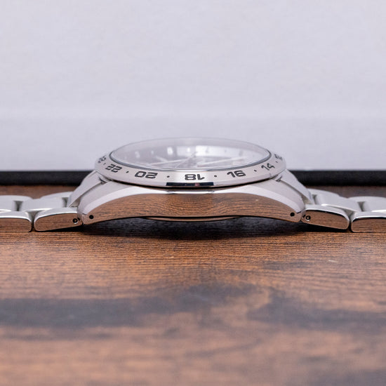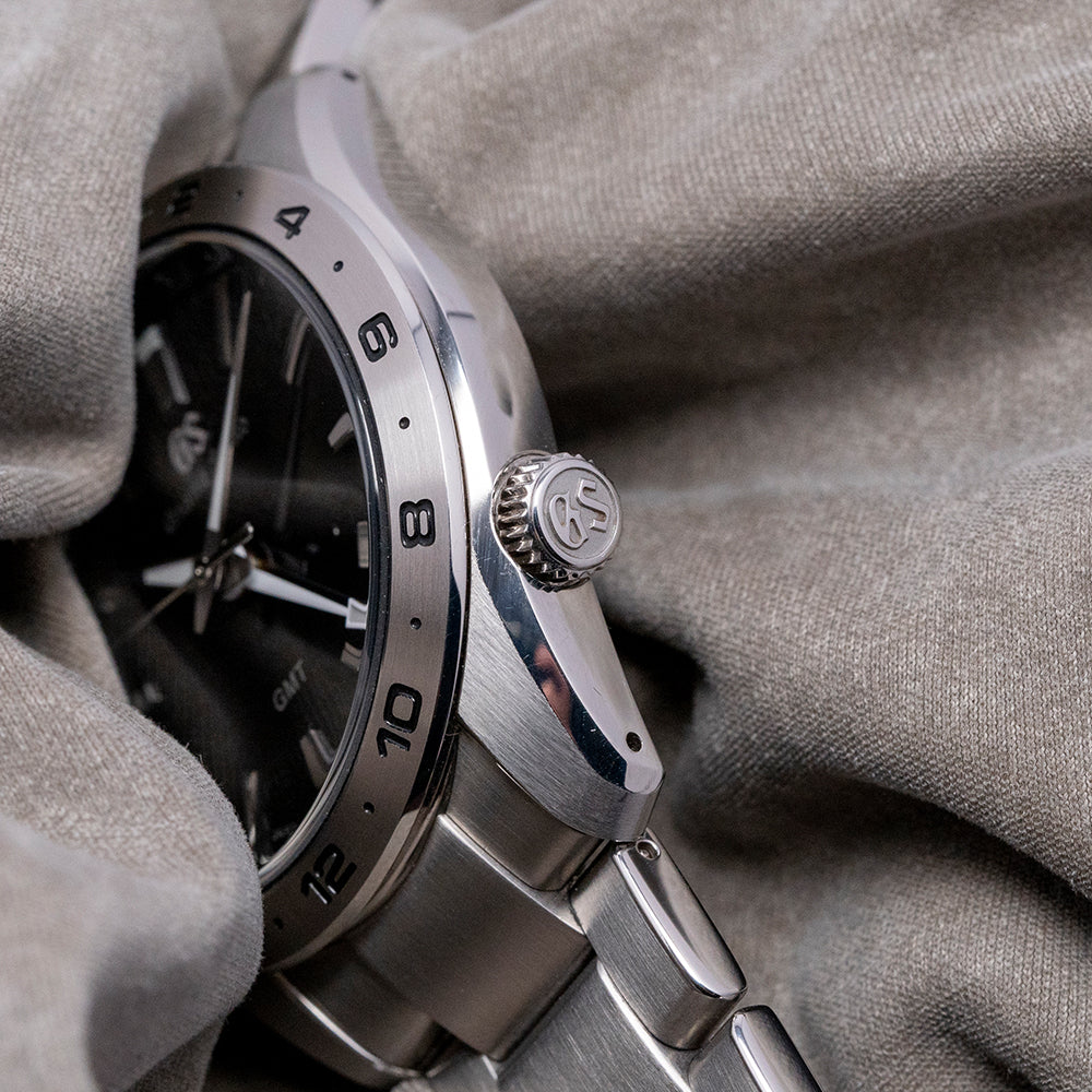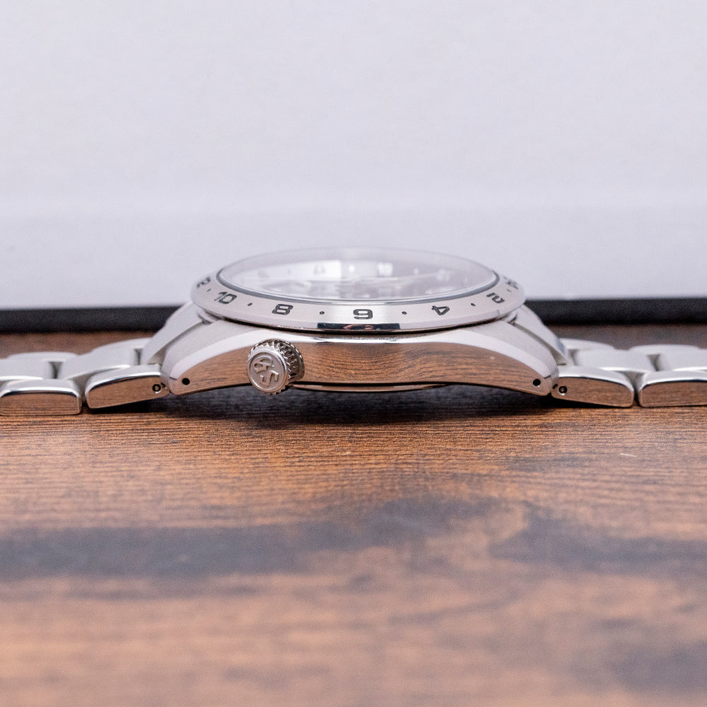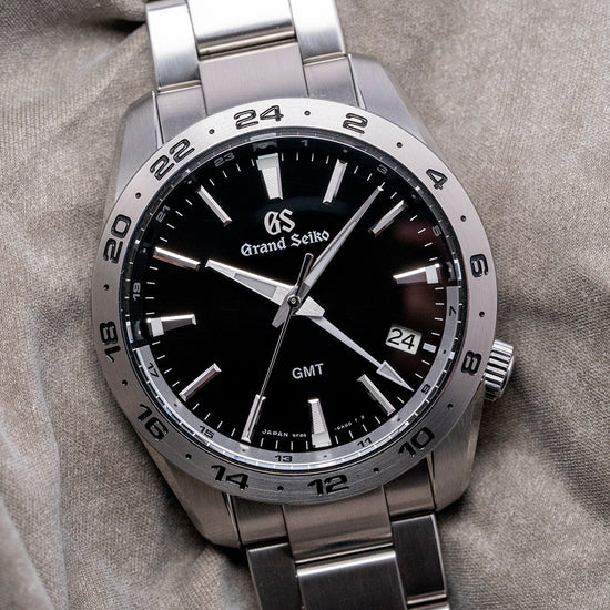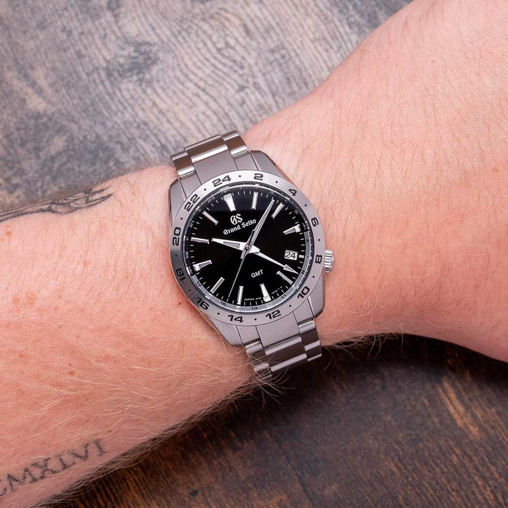 Here we have a 2024 Grand Seiko GMT Quartz 9F Black SBGN027G with an impressively sculptured 39mm stainless steel case, exquisitely Zaratsu polished and brushed surfaces transition with crisp edges and curve over your wrist toward the drilled lugs, leading to a lug-to-lug of 45mm and a case thickness of 11.5mm to give the watch an impressive wrist presence. On the right side is a signed crown sitting slightly recessed, and a 24-hour bezel holds a dual-curved sapphire crystal, AR-coated on the inside, which sits above a black dial. An outer 24-hour chapter ring in black and silver, featuring 12-hour sections that indicate night and day hours, surrounds applied Zaratsu-polished, chamfered-edge batons and trapezoid indexes marking the hours. The indexes magically play with the light as you rotate your wrist. At 4 o’clock, a date window features a white background and black numerals. Elegant Dauphine hands are Zaratsu polished with razor-sharp edges, a tapered second hand, and an arrow hand indicating the 24-hour position. At 12 o’clock, we have the Grand Seiko motif, and at 6 o'clock, “GMT” completes this incredibly stylish travelling companion. On the reverse is a screw-down case back with the reference number and a deeply embossed medallion in the centre, inside a Quartz Grand Seiko Cal. 9F86, a top-tiered Quartz movement. Seiko grows its own quartz crystals, and using a higher torque allows them to use these heavier GS hands, keeping their brand aesthetic intact. The watch comes fitted on its 20mm stainless steel bracelet with expertly Zaratsu brushed and polished edges secured by a push-button three-fold signed clasp; all links are provided, and also comes with the Grand Seiko presentation box, swing tag and papers.