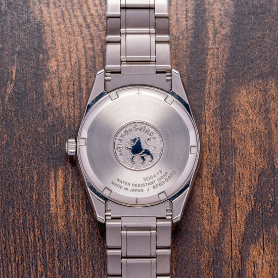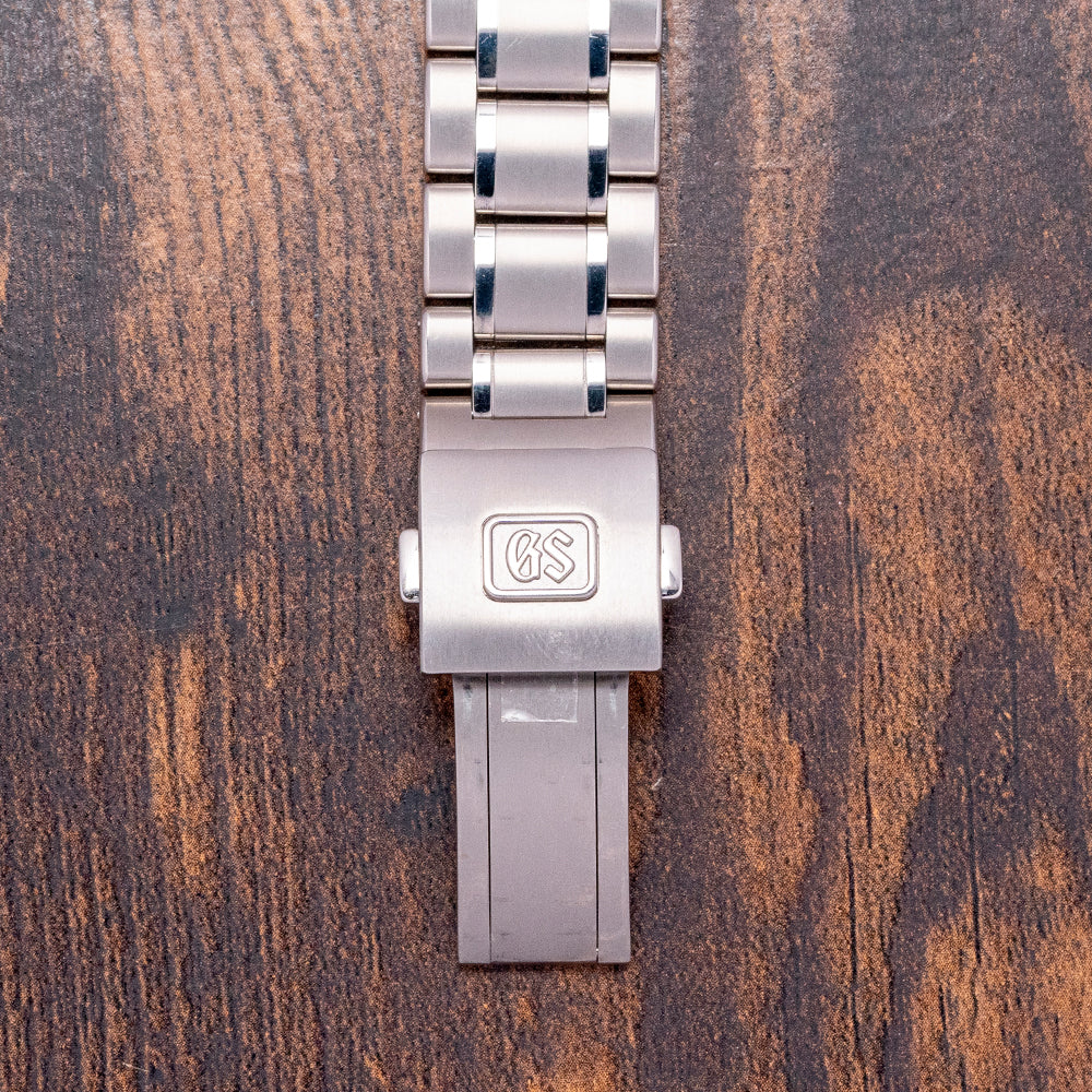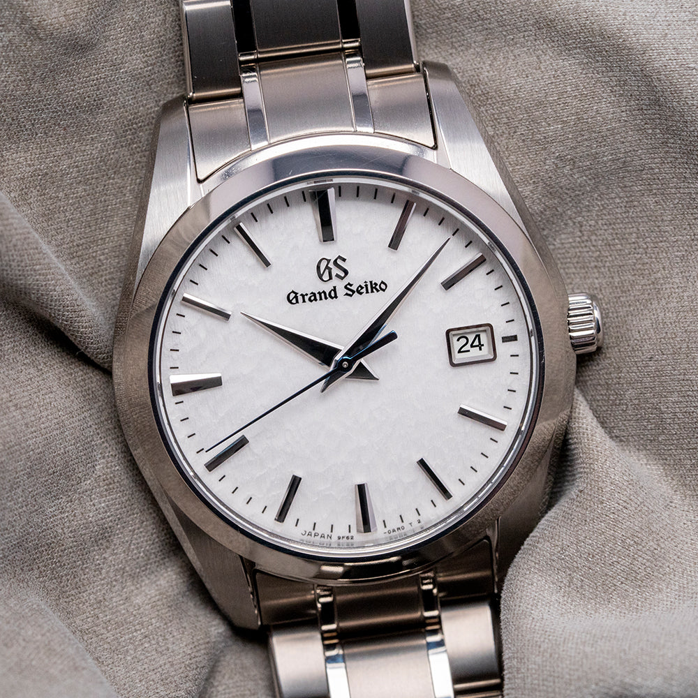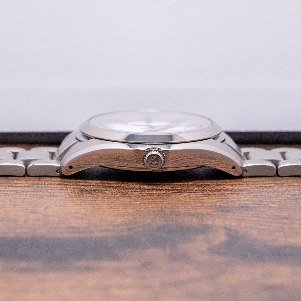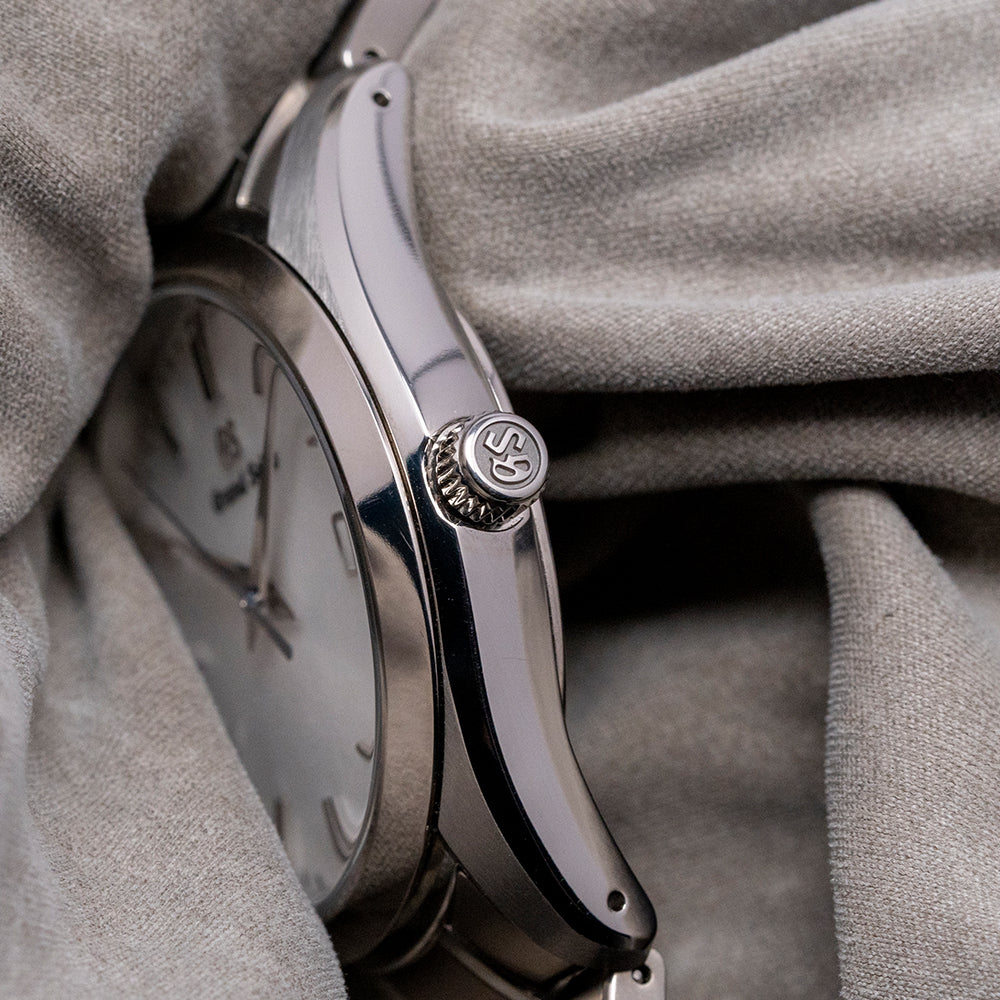 Here we have a 2024 Grand Seiko 'Snowflake' Titanium 9F SBGX355G, part of their Heritage collection showcasing all the elements Grand Seiko is renowned for with a curvaceous 37mm high-intensity Titanium case, even more scratch resistant than standard Titanium; the subtle curve of the case has a chamfered edge leading to drilled tapered lugs and a lug-to-lug length of 44mm and a case thickness of 10mm ensures a comfortable fit on your wrist. On the right side, a signed crown and a smooth, bevel-edged bezel encase a dual-curved sapphire crystal, AR-coated on the inside, above an incredible wind-blown snow-textured dial that achieves this dynamic white effect through silver plating. An outer minute track with applied facet-edged batons, precisely Zaratsu polished, marks the hours. At 3 o’clock, a framed date window, dauphine hands have been Zaratsu polished for their razor edges and are complemented by a tapered blue second hand. At noon, an applied ‘GS’ and precisely printed Grand Seiko complete this sophisticated dress watch. On the reverse, a screw-down case back with polished sides and brush finishing around the Grand Seiko Lion embossed in the centre, reminding us of the past Grand Seiko’s medallions, inside a Grand Seiko 9F62 Quartz calibre, a top-tiered Quartz movement. Seiko grows its own quartz crystals, and by using a higher torque, it is able to utilise these heavier GS hands, maintaining its brand aesthetic. To achieve this, it has incorporated a backlash auto-adjust mechanism that controls every single tick of the second hand accurately and precisely in time. It comes paired with its original 19mm high-intensity Titanium Grand Seiko-signed bracelet, secured with a Grand Seiko-signed push-button release three-fold clasp; all links are provided. The watch includes all spare links and is accompanied by its Grand Seiko presentation box, swing tags, and paperwork.