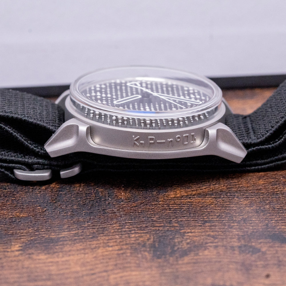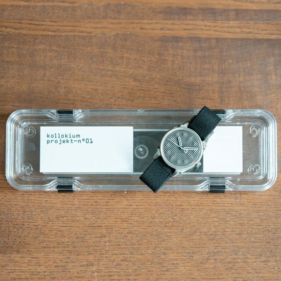 Here we have an innovative 2024 Kollokium Projekt 01 - Variant "B" Automatic with an industrial organic design. It has a 40mm two-part Die-cast 316L stainless steel case in a granular textured matte finish, made in a small batch of 199 pieces, they quickly sold out on their website. Scallop lugs hug the midcase case for a distinctive profile; a lug-to-lug length of 48mm and a case thickness of 12mm ensure a comfortable fit on your wrist. On the right side is a valve-shaped crown, and on the left side is an embossed abbreviated brand and model name. The upper level of the watch is a box sapphire crystal, making up almost half of the watch's height, giving a perfect view of this incredible dynamic dial. 486 hand-applied sandblasted cylindrical markers of 6 varying heights and widths, hand-painted tips of SuperLumiNova sit on a matte black textured dial; this is a 3D reconstruction of a pixelated image created in Adobe Illustrator representing 12 maxi-size hour markers, creating a unique monochromatic dystopian cityscape. White outlined hands are complemented by a hook-shaped white sweeping second hand; on the reverse, a hex screwed-down case back with the details of the watch, inside an automatic La Joux-Perret Cal. G101, 24 jewels, beating at 28,800 beats per hour, this quality movement is designed and manufactured by La Joux-Perret in La Chaux-de-Fonds, Switzerland. The watch comes paired on a 20mm black NATO strap secured by a die-cast steel hook fastening.