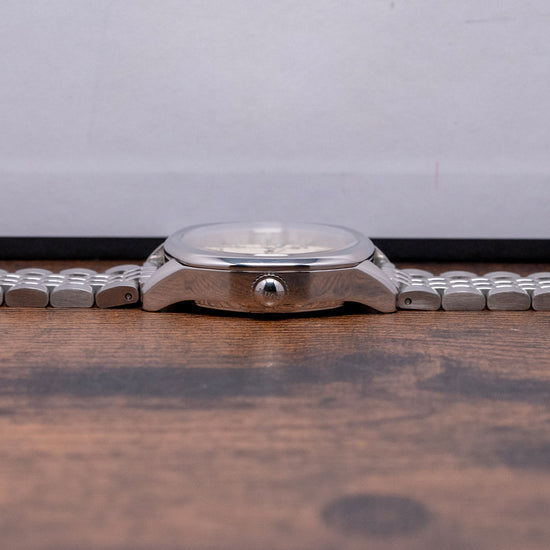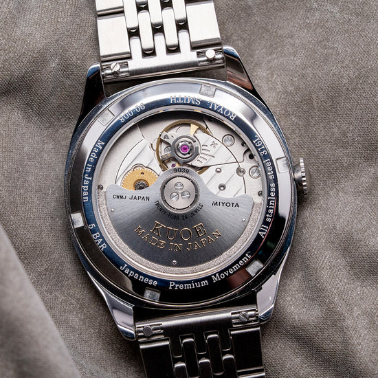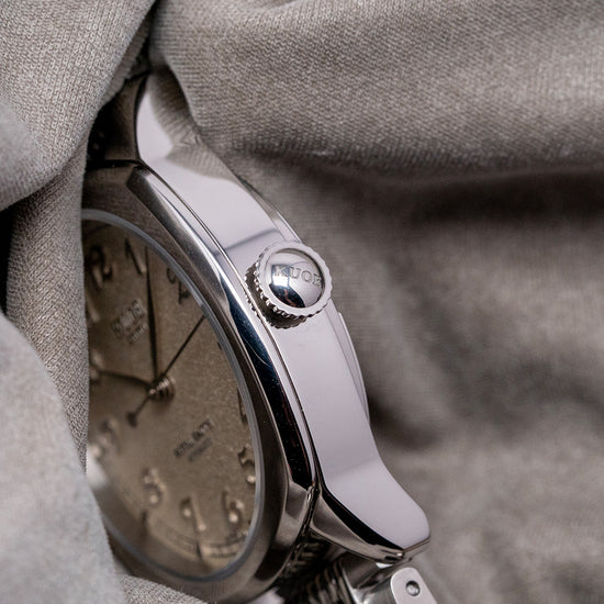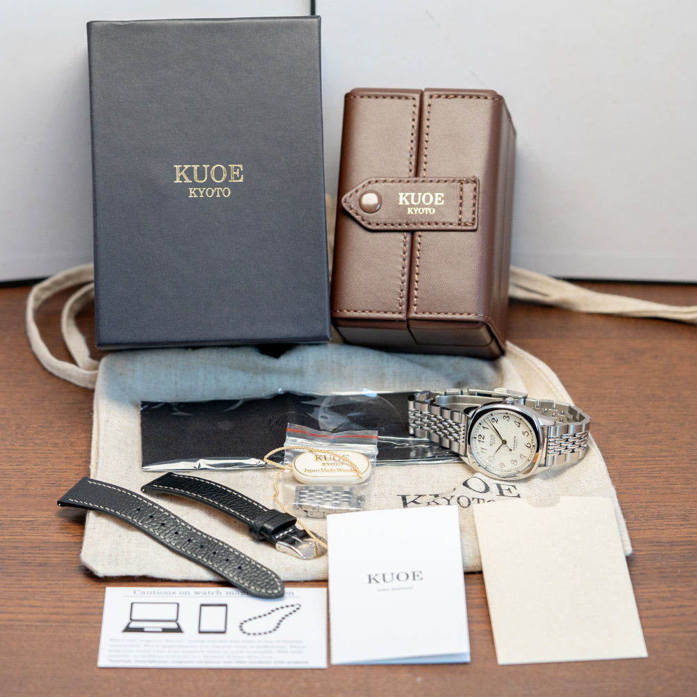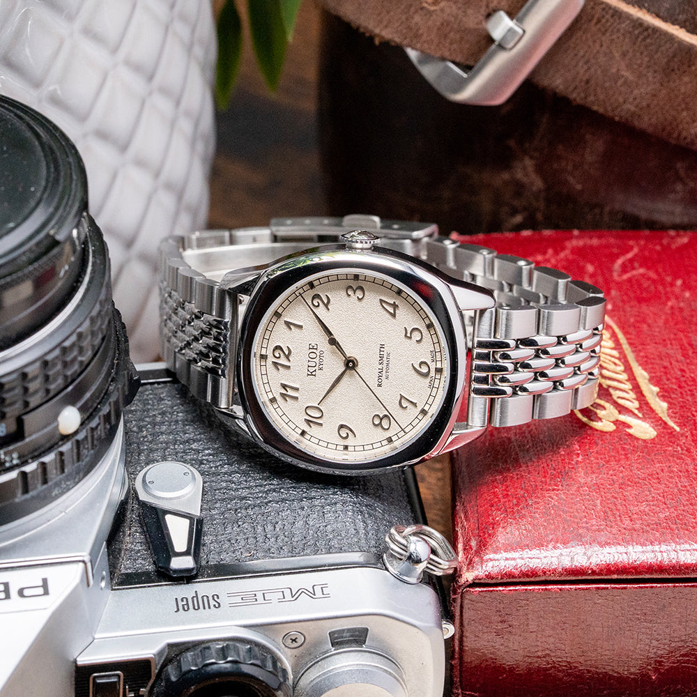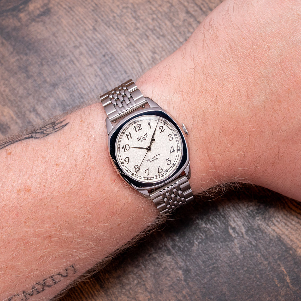 Here we have a 2024 Kuoe Royal Smith 90-008 automatic cushion case whose profile is inspired by the antique watches of the 1940s, with its emphasis on classical design. The polished 34mm stainless steel cushion case gently curves over your wrist, featuring thick, tapered lugs. The subtly curved flanks lead to a lug-to-lug length of 41mm and a case thickness of 10.5mm, ensuring a comfortable fit. On the right side is a signed slim coin-edged crown, a chamfered-edged polished bezel holds a domed crystal AR-coated above an off-white grain textured dial, an outer minute track has gold-toned markers surrounding large gold-toned hand-applied Breguet numerals marking the hours, elegant gold-toned leaf hands are complemented by a sweeping second hand, at noon we have the Kuoe Kyoto motif, and at 6 o’clock “Royal Smith” ‘Automatic’ completes this vintage-inspired, versatile dress watch. On the reverse, a screw-down exhibition case back features the watch's details etched around its edge, housing an automatic Miyota Cal. 9039, 24 jewels, beating at 28,800 beats per hour. This premium movement features a signed rotor, hacking seconds and hand-winding for your convenience. It comes paired with quick-release 18mm Jubilee stainless steel bracelet secured by a push button signed folding clasp. This watch is sold with its original KUOE box, swing tags and paperwork.