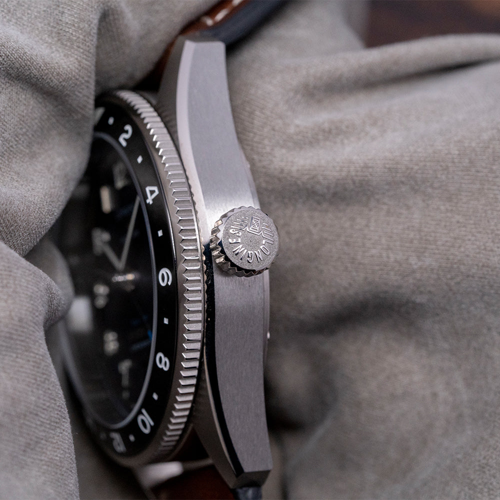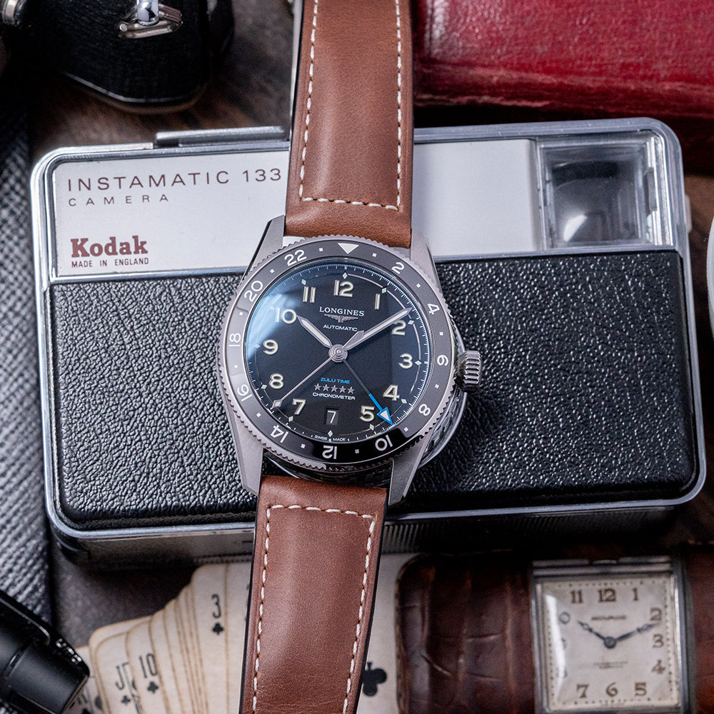 Here we have a 2024 Longines Spirit Zulu Time Automatic GMT L3.802.4.53.2 released in 2022. Zulu Time refers to the time at the zero meridian, also known as Greenwich Mean Time, which is now referred to as Universal Coordinated Time (UTC). The term "Zulu" is the radio code for the letter “Z.” It helps pilots communicate clearly over the radio. Initially, “Z” was associated with the word “Zebra,” but it was later changed to “Zulu” in the NATO phonetic alphabet. The polished and brushed 39mm stainless steel case curves over your wrist thanks to the tapered flat-ended lugs. A polished chamfered edge along its flanks leads to a lug-to-lug length of 46.5mm and a case thickness of 13mm, ensuring a comfortable fit. On the right side, a signed coin-edged crown. The bidirectional coin-edged bezel has a black ceramic insert with a 24-hour scale holding a slightly domed sapphire crystal AR-coated on both sides above a matte black dial. An outer minute track is precisely executed, surrounding applied Arabic numerals filled with SuperLumiNova, marking the hours, at 6 o’clock, a colour-matched date window, slender sword hands filled with the same lume are complemented by a tapered sweeping second hand and a blue arrow-tipped GMT hand, at noon we have the Longines motif ‘Automatic’ printed underneath; at 6 o’clock in blue ‘Zulu Time’ five applied polished stars, which was placed on their dials in the past to signify quality and reliable movements and ‘Chronometer’ completes this striking travelling companion. On the reverse, a solid screwed-down case back features the details of the watch, along with a depiction of longitude and latitude on a globe, topped with the Longines motif, inside an Automatic Longines Cal. L844.4, 21 jewels beating at 25,200 beats per hour, it features hand-winding, hacking seconds, and is COSC Certified. It comes paired with its 21mm leather strap and signed push-button deployant. This watch is sold with its original Longines box and paperwork.