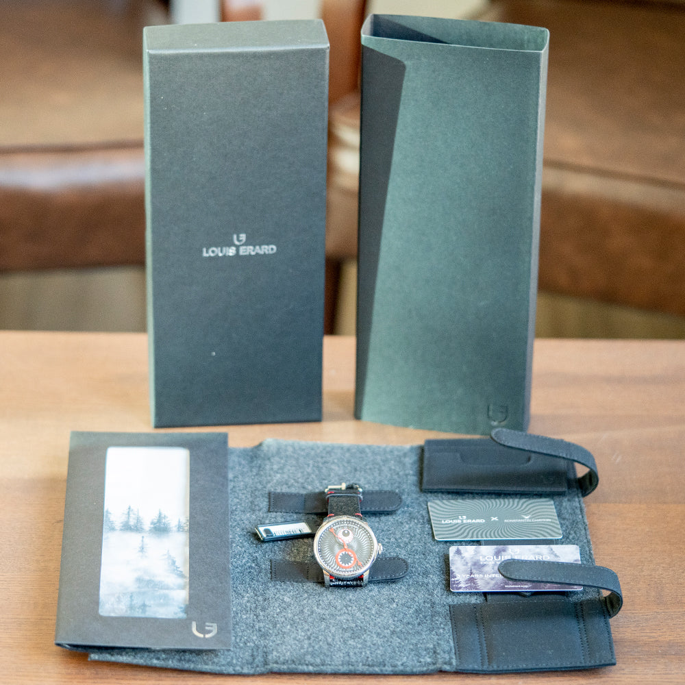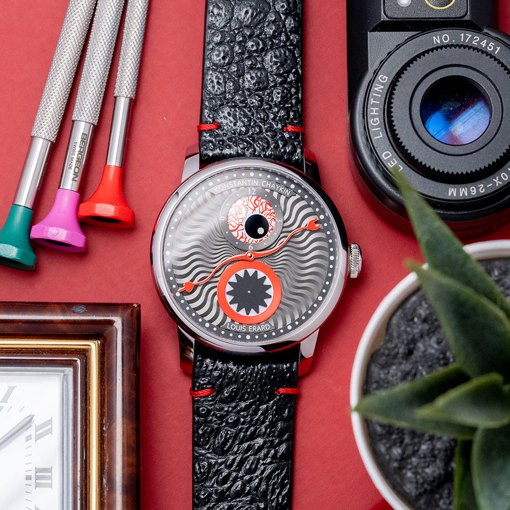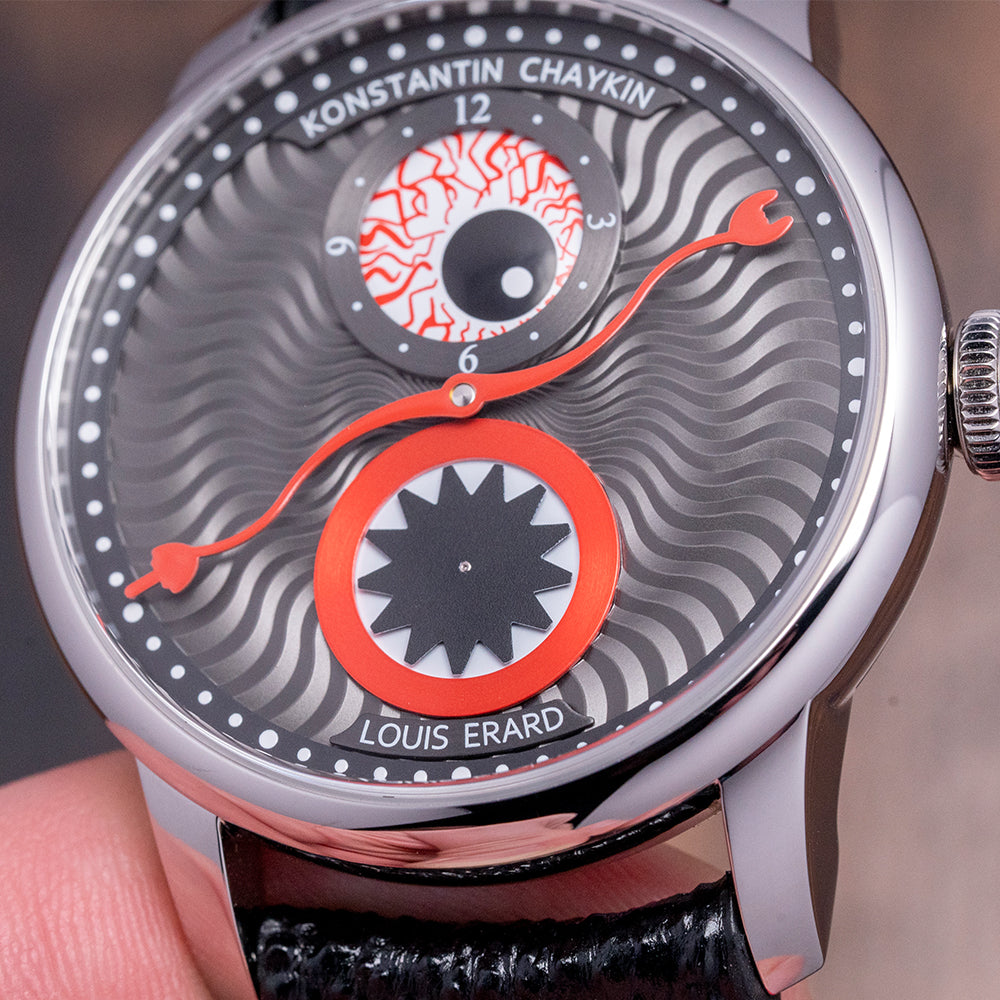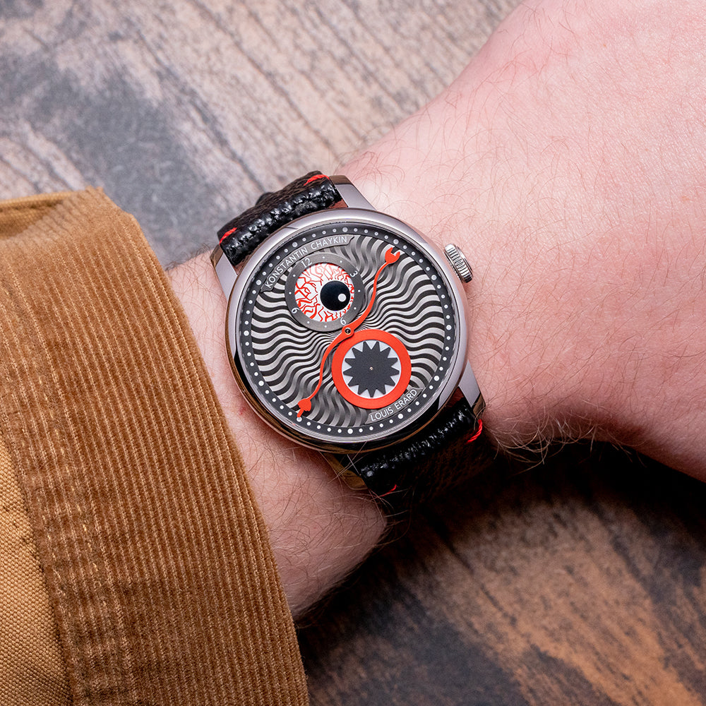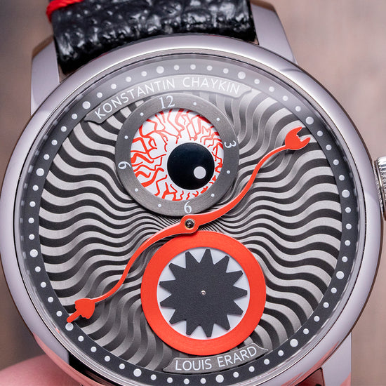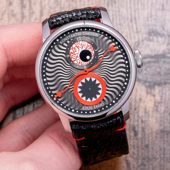 Here we have an unworn and stickered 2024 Louis Erard Konstantin Chaykin Le Regulateur Dusk to Dawn Black limited to 1 of 178 pieces; two horology houses have come together to create a unique blend of abstract design and function in their collaboration. The 42mm polished stainless steel case curves over your wrist with slightly tapered lugs, and a lug-to-lug length of 49mm and a case thickness of 12.5mm ensure a comfortable fit. On the right side is the signature Chaykin signed crown with knurling for extra grip. The polished smooth bezel holds a domed sapphire crystal AR coated on both sides above a distinctive monster-themed dial. Konstantin Chaykin has given the Louis Erard Le Régulateur watch a unique touch by taking inspiration from Slavic folklore; in this folklore, there is a mythical creature known as Likho, which is believed to bring bad luck and misfortune. Likho is portrayed as a one-eyed monster. The anthracite dial boasts a captivating sunray wave pattern, with a matte black outer minute track framing a satin-brushed anthracite hour sub-dial at 12 o'clock; the 12-hour ring features white numerals and a giant rotating black pupil for the hour hand on a white background that resembles the Cyclops' bloodshot eye. At 6 o'clock, a shiny red sub-dial with a white background and a rotating matte black star-shaped second hand represents the monster's roaring mouth. Depending on how you see it, a red-stylised minute hand resembling a serpent, arrow or middle finger precisely highlights the minutes. The Konstantin Chaykin logo is located at 12 o'clock, while the Louis Erard logo completes this inspiring collaborative timepiece at 6 o'clock. On the reverse, a screw-down exhibition case back showcases the automatic Sellita SW 266-1, 31 jewels, beating at 28,800 beats per hour. The élaboré grade movement has a Louis Erard-modified rotor. It comes paired with a 22mm black toad leather strap, red-dyed rabbit leather lining, and a polished steel pin buckle. It comes with its Louis Erard presentation box, travel pouch, and paperwork.