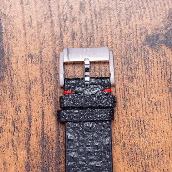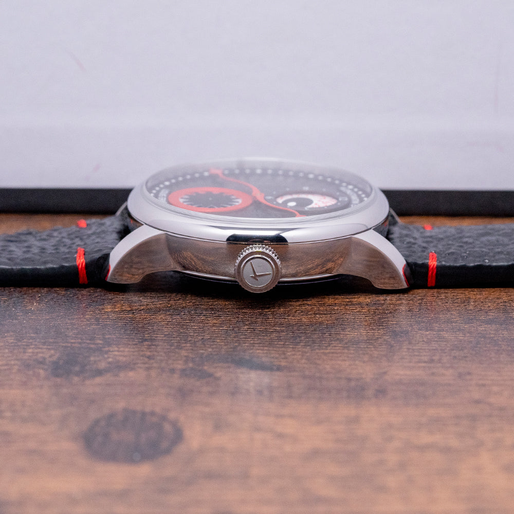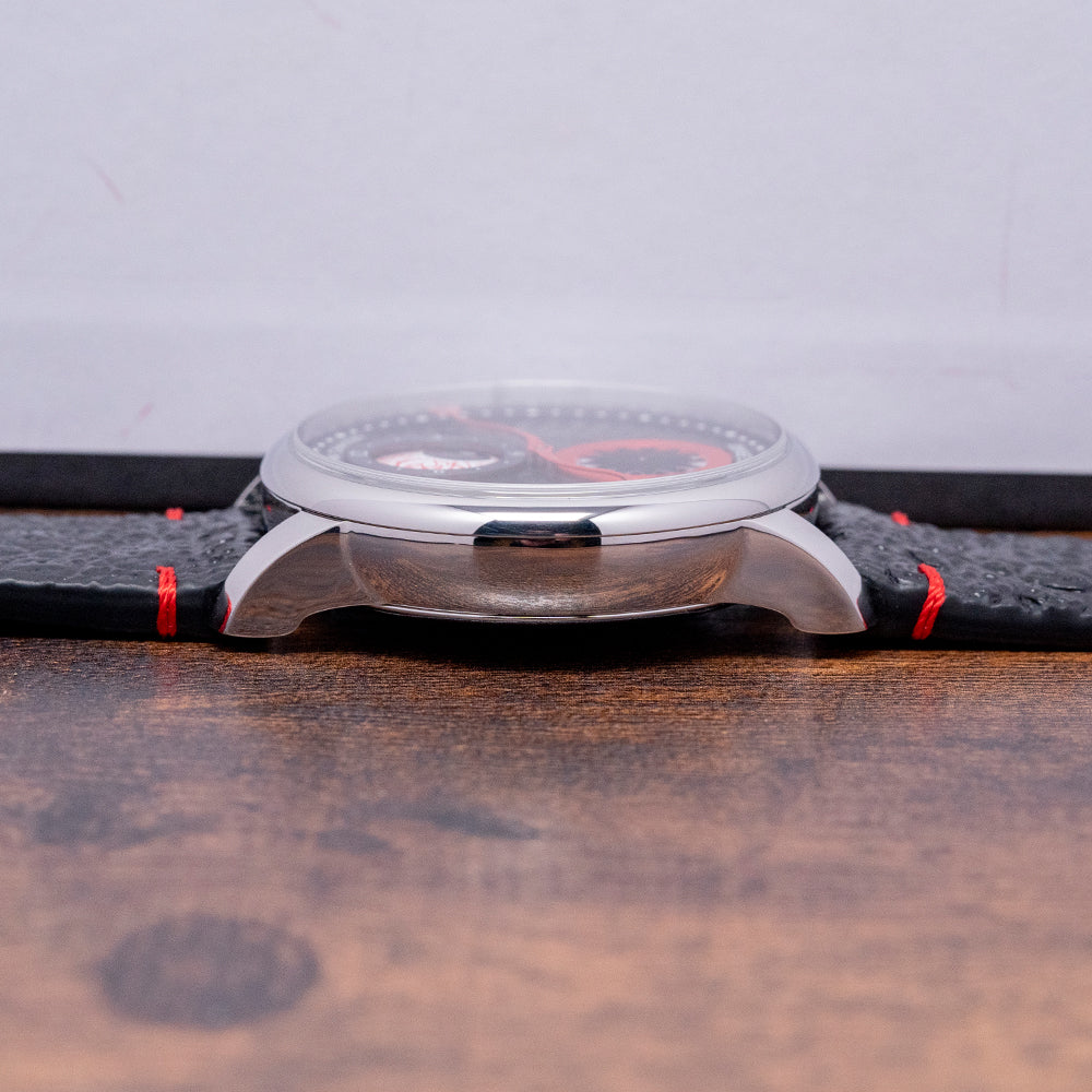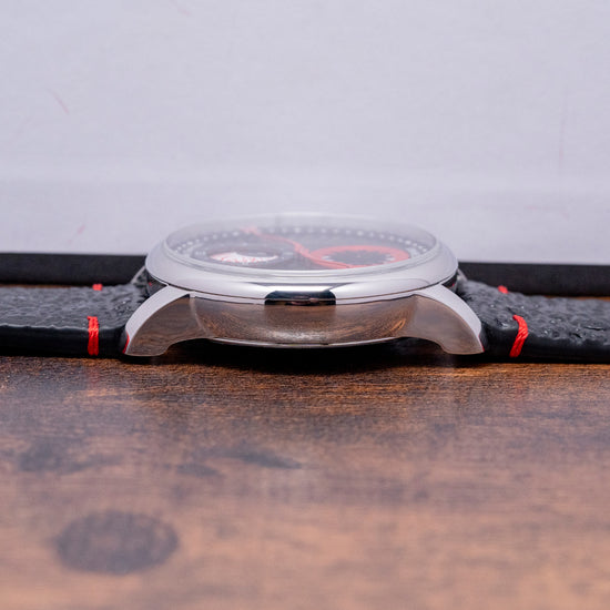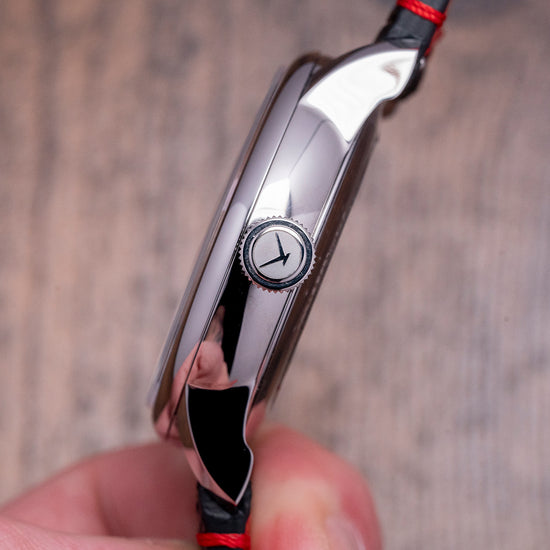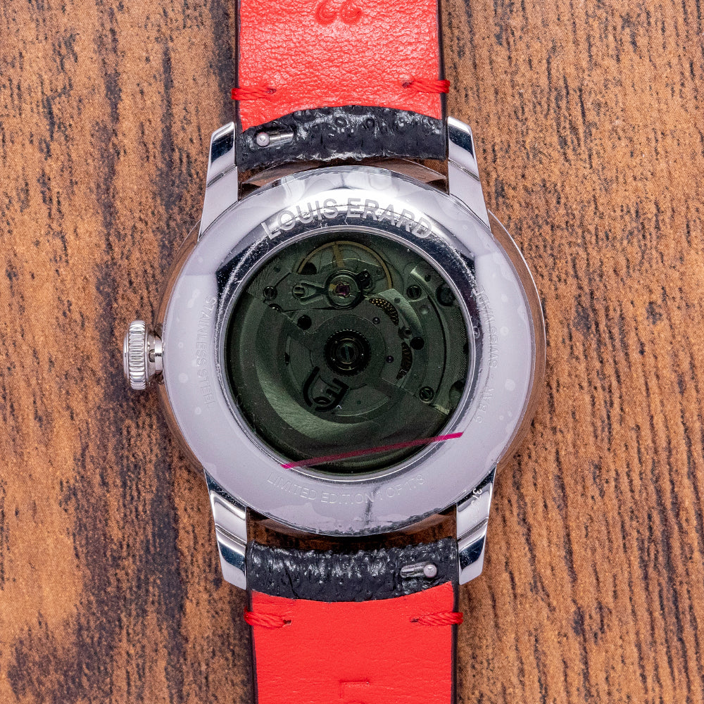 Here we have an unworn and stickered 2024 Louis Erard Konstantin Chaykin Le Regulateur Dusk to Dawn Black limited to 1 of 178 pieces; two horology houses have come together to create a unique blend of abstract design and function in their collaboration. The 42mm polished stainless steel case curves over your wrist with slightly tapered lugs, and a lug-to-lug length of 49mm and a case thickness of 12.5mm ensure a comfortable fit. On the right side is the signature Chaykin signed crown with knurling for extra grip. The polished smooth bezel holds a domed sapphire crystal AR coated on both sides above a distinctive monster-themed dial. Konstantin Chaykin has given the Louis Erard Le Régulateur watch a unique touch by taking inspiration from Slavic folklore; in this folklore, there is a mythical creature known as Likho, which is believed to bring bad luck and misfortune. Likho is portrayed as a one-eyed monster. The anthracite dial boasts a captivating sunray wave pattern, with a matte black outer minute track framing a satin-brushed anthracite hour sub-dial at 12 o'clock; the 12-hour ring features white numerals and a giant rotating black pupil for the hour hand on a white background that resembles the Cyclops' bloodshot eye. At 6 o'clock, a shiny red sub-dial with a white background and a rotating matte black star-shaped second hand represents the monster's roaring mouth. Depending on how you see it, a red-stylised minute hand resembling a serpent, arrow or middle finger precisely highlights the minutes. The Konstantin Chaykin logo is located at 12 o'clock, while the Louis Erard logo completes this inspiring collaborative timepiece at 6 o'clock. On the reverse, a screw-down exhibition case back showcases the automatic Sellita SW 266-1, 31 jewels, beating at 28,800 beats per hour. The élaboré grade movement has a Louis Erard-modified rotor. It comes paired with a 22mm black toad leather strap, red-dyed rabbit leather lining, and a polished steel pin buckle. It comes with its Louis Erard presentation box, travel pouch, and paperwork.