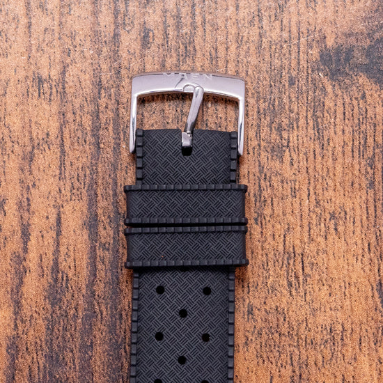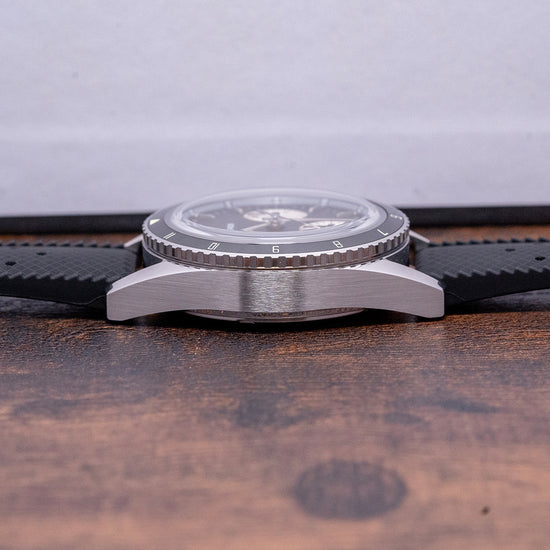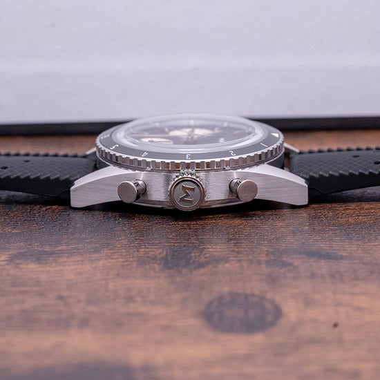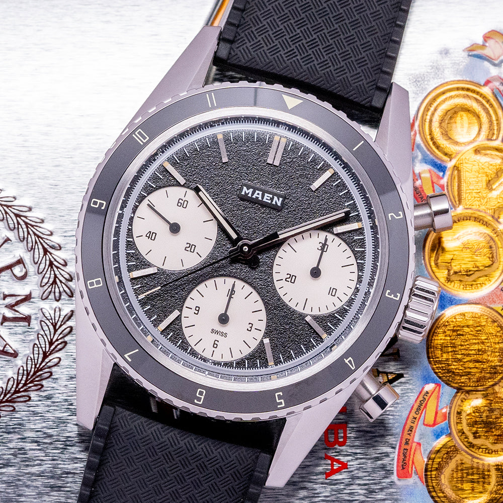 Here we have a 2024 Maen Skymaster 38 Chronograph Black Manual created as a fitting tribute to the Douglas DC4 Skymaster flown from Amsterdam and New York by KLM in 1946, the first European Air Service to fly to the USA. A curvaceous polished and brushed 38mm stainless steel case has a subtle curve of the brushed flanks over your wrist flowing towards twisted tapered lugs, and a lug-to-lug length of 47.5mm and a case thickness of 13.5mm give the watch an impressive wrist presence, polished and brushed surfaces transition with crisp, well-defined edges. We have the piston chronograph pushers down the right side and a signed crown with deep knurling in the centre. A polished 60-click bi-directional stainless steel bezel has deep knurling for grip and a black ceramic 12-hour GMT scale in X1 Old Radium Superluminova holding a box domed sapphire crystal above a dynamic black textured reverse panda dial. An outer minute chapter ring is precisely executed surrounding applied chamfer-edged polished and brushed baton indexes tipped with X1 Old Radium Superluminova marking the hours; the recessed silver concentric circular registers consist of 30-min, 12-hour and finally small seconds, slender polished steel baton hands have the same X1 Old Radium Superluminova complemented by a tapered chronograph hand, at noon we have the Maen motif completing this travelling companion, vintage-inspired sports GMT chronograph. On the reverse, a screw-down exhibition case back engraved with the details of the watch, inside a top-grade manually wound Sellita Cal. SW510MB, 23 jewels, beating at 28,800 beats per hour, decorated in Côtes de Genève and blued screws. The watch comes paired with its 20mm black FKM Tropic rubber strap plus an unworn Maen 20mm stainless steel bracelet with polished and brushed surfaces, engraved clasp with push button release; all links are provided and come with its Maen presentation box and paperwork.