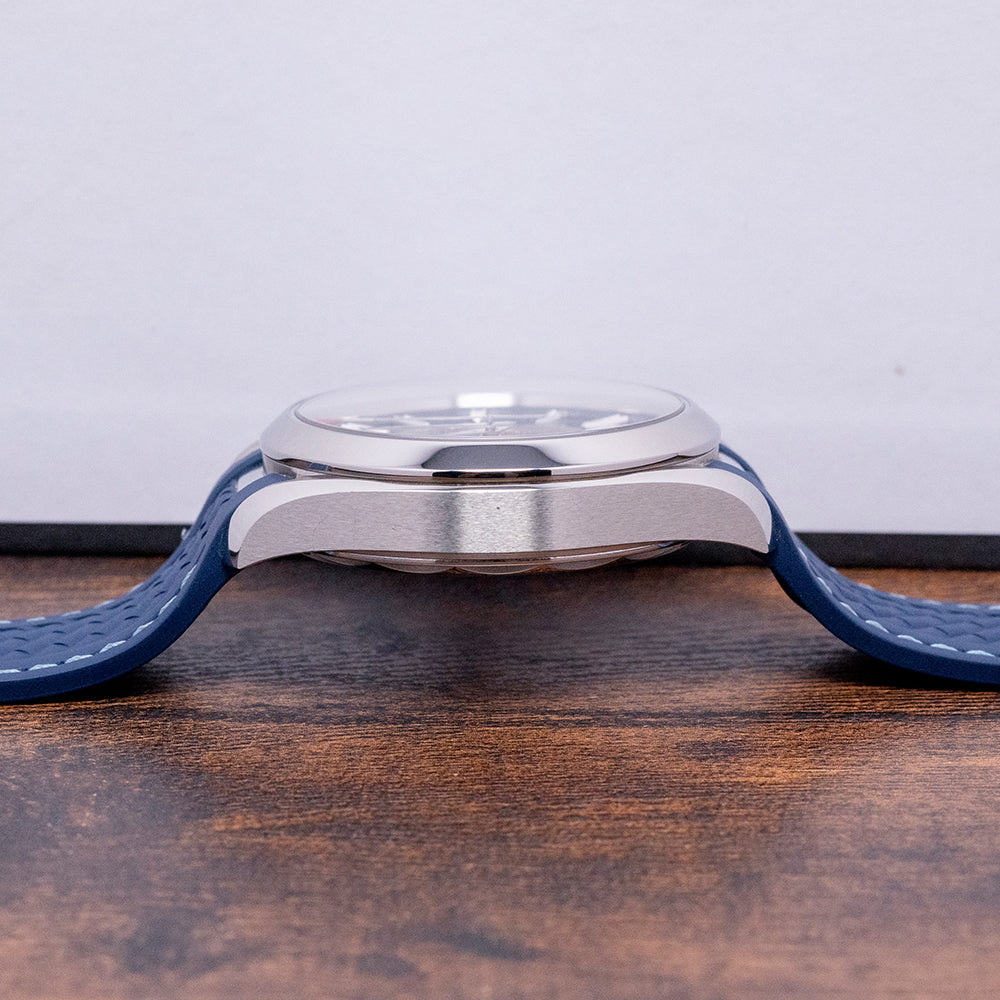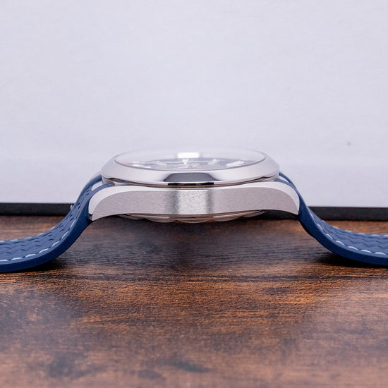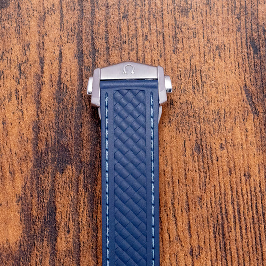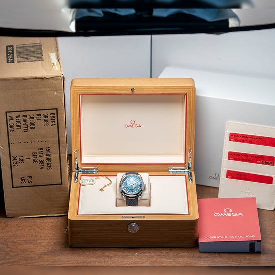 Here we have a 2024 Omega Aqua Terra 150M GMT Worldtimer 220.12.43.22.03.001 with a 43mm polished stainless steel case. The characteristic twisted lugs curve over your wrist with a lug-to-lug length of 50mm and a case thickness of 14mm, giving the watch an impressive wrist presence. Polished and brushed surfaces transition with crisp edges. On the right side is a signed screw-down crown with deep knurling for extra grip. A polished smooth bezel holds a domed sapphire crystal AR coated on both sides. The striking sunburst blue dial with vertical striping has an outer ring of the world's time zones made up of a red GMT, silver places indicating +1 hour summertime, and blue places indicating those without daylight savings. Applied dagger indexes filled with SuperLumiNova mark the hours. At 6 o’clock, a date window. In the centre, we have a vision of the earth in relief on a Grade 5 Titanium plate surrounded by the world's oceans, which have been created with the use of a laser that has chemically reacted with the Titanium to create this incredible effect. The 24-hour glass ring is light blue for daylight and dark blue for nighttime. Text is precisely executed on the dial, making it easy to read. The Broad-Arrow hands are filled with luminance complemented by an arrow pointed sweeping the second hand. On the reverse, a screw-down exhibition case back. Inside an Automatic Omega Co-Axial Cal. 8938, 39 jewels, 25,200 beats per hour. Omega uses modern materials to achieve accuracy and reliability, such as silicon hairsprings and free-sprung balance wheels. Resistant to magnetic fields reaching 15,000 gausses. The Rotor is Rhodium-plated and is bidirectional for improved efficiency. Certified Master Chronometer, approved by METAS, ”Swiss National Metrology Institute''. The watch goes through COSC certification before being selected for the eight tests run by METAS. The watch comes fitted on its original 21mm blue rubber strap with a signed clasp; the watch also comes with its original box, swing tag and paperwork.