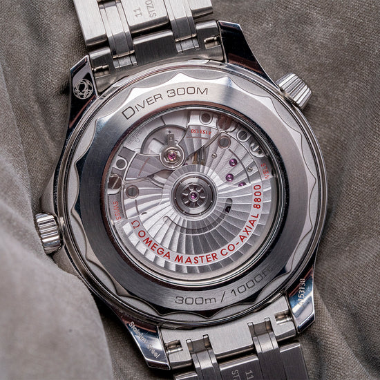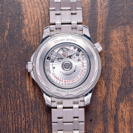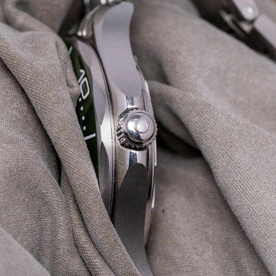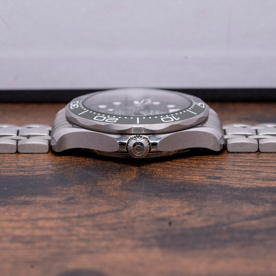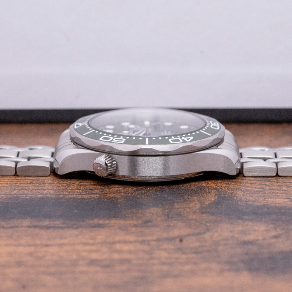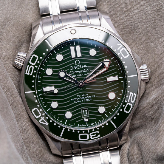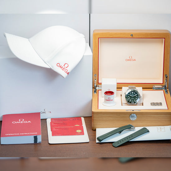 Here we have a 2024 Omega Seamaster 300M Green Bracelet 210.30.42.20.01.001, featuring a 42mm polished and brushed stainless steel case that curves over your wrist, with the characteristic twisted lugs associated with a modern Seamaster. Celebrating Omega’s maritime and dive heritage, in 1957, Omega introduced the 300 Seamaster series, created for the professional diver. A lug-to-lug length of 50mm and a case thickness of 13mm give the watch an impressive wrist presence. At the 10 o’clock position a Manual helium escape valve, and on the right side is a signed screw-down crown protected by crown guards, the scalloped-edged green ceramic unidirectional bezel insert has white enamel dive minutes marked clearly, holding a domed AR-coated sapphire crystal above the dramatic polished dark green ceramic dial with an attractive laser engraved wave pattern, applied baton and discs coated in Super LumiNova mark the hours. Skeletonised hands are rhodium-plated and tipped with Super LumiNova, making low-light visibility impressive. At the 6 o'clock position sits the colour matched date window, at 12 o’clock we have the Omega motif with “Seamaster Professional” printed underneath, and at 6 o’clock “, Co-Axial Master-Chronometer” 300m/1000ft completes this dynamic dive watch. On the reverse an exhibition sapphire case back with wave edging showcasing the automatic Omega Co-Axial Cal. 8800, 35 jewels, 25,200 beats per hour, a Certified Master Chronometer, approved by METAS, "Swiss National Metrology Institute", the watch goes through COSC certification before being selected for the eight tests run by METAS, this movement is resistant to magnetic fields. It has a silicon balance spring that winds in both directions, finished in Rhodium plating and decorated with Geneva waves. The watch comes fitted on its polished and brushed 20mm Omega stainless steel bracelet with a signed push-button release folding clasp, all links provided and the watch comes with its Omega presentation box and papers.