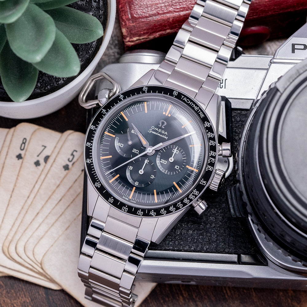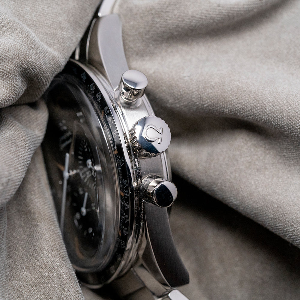 Here we have a 2024 Omega Speedmaster ‘First Omega in Space’ 310.30.40.50.06.001. This watch's design draws inspiration from the Speedmaster CK2998 that astronaut Wally Schirra wore during his "Sigma 7" mission orbiting the Earth in 1962. The 39.7mm stainless steel case curves over your wrist, featuring tapered, flat-ended, symmetric lugs. A lug-to-lug length of 48mm and a case thickness of 13.5mm give the watch an impressive wrist presence. Polished and brushed surfaces transition with crisp lines. Down the right side, we have the piston chronograph pushers and a signed crown in the centre. The characteristic fixed stainless steel bezel features a black aluminium Tachymeter scale, precisely executed with the characteristic dot over 90. The domed sapphire crystal, AR-coated on the inside, is set above a grey-blue CVD-coated (chemical vapour deposition) dial that replicates the tone of the original CK2998 dials from the 1960s. An outer minute track is precisely marked with baton indexes in vintage Super-LumiNova marking the hours, at 3 o’clock a recessed 30-minute register with a white hand, at 6 o’clock a recessed 12-hour register with a white hand and finally at 9 o’clock a recessed small seconds register with a silver alpha hand matching the hour and minute hands infilled with vintage Super-LumiNova and complemented by a white tapered chronograph hand. At noon, an applied Omega motif, “Speedmaster” underneath. On the reverse, a screw-down case back with an engraved Hippocampus in the centre, and “The First Omega In Space, October 3, 1962” engraved around the edge. The Hippocampus represents Neptune, the God of the sea. It was conceived by Pierre Borie after seeing a picture of Neptune riding a chariot pulled by seahorses; it is the reason why the seahorses are wearing a bridle, inside a Manually Wound Omega Cal. 3861 featuring a CO-Axial and column-wheel, COSC-certified 26 jewels, 21,600 beats per hour, a decorated rhodium-plated movement with Geneva waves. METAS (Federal Institute of Metrology) has also certified this special movement with additional measurements of precision, performance, and anti-magnetic resistance. The continued commitment by Omega to push the envelope of a watch and its movement means it remains the only flight-qualified watch that meets the requirements for EVA (Extravehicular activity) – outperforming quartz watches with LCD displays, which are vulnerable to temperature changes and can be literally destroyed during spacewalks. It comes paired with an Omega 19mm Flat link polished and brushed stainless steel bracelet, featuring a signed push-button clasp; all links are provided. The watch comes with its Omega presentation box and paperwork.