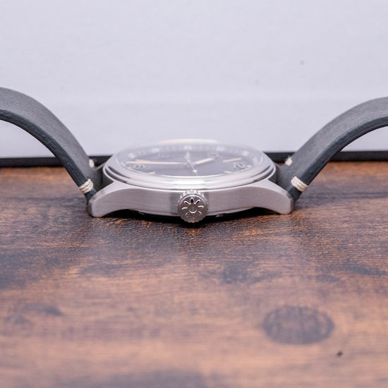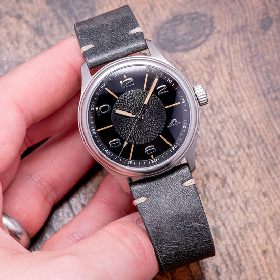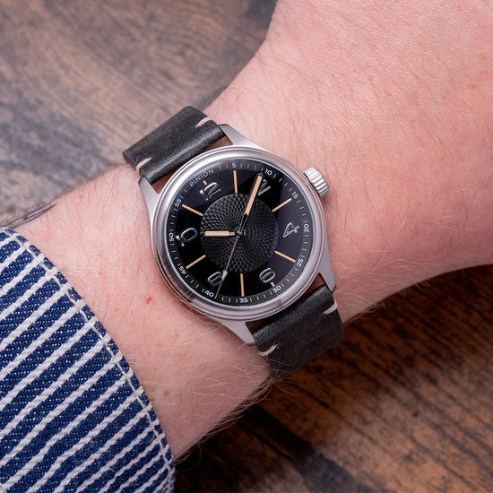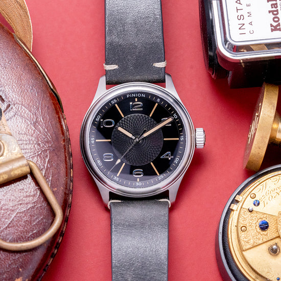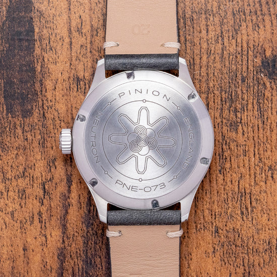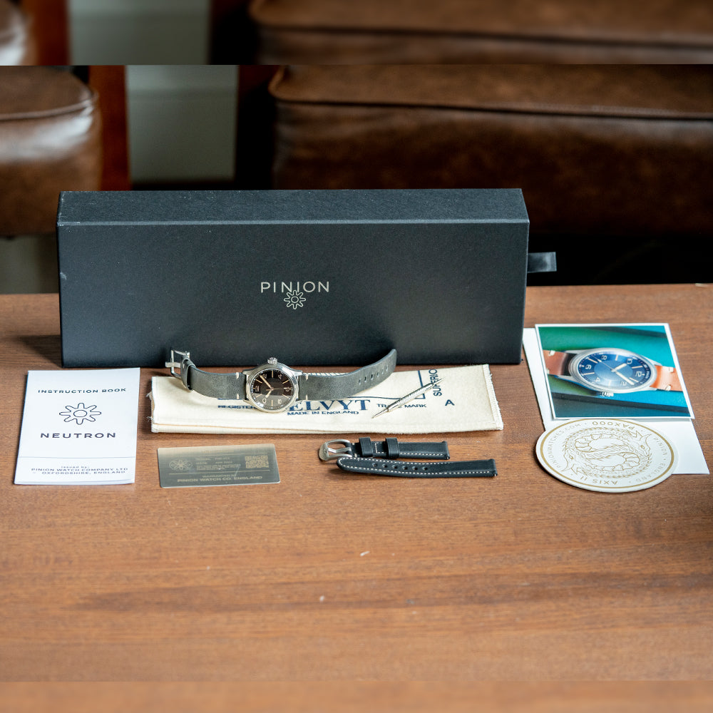 Here we have a 2024 Pinion Neutron Galvanic Black Automatic with a 38mm brushed stainless steel case that curves over your wrist with finely tapered lugs, a lug-to-lug length of 45.5mm and a case thickness of 10.5mm, ensuring a comfortable fit on your wrist. On the right side, a signed push-down crown with a double o-ring and the smooth stepped bezel holds a domed sapphire crystal AR coated on the inside above a striking Galvanic black sector-style electroplated dial. A sloping 60-minute chapter ring surrounds a brushed ring with applied polished brass numerals, electroplated in nickel silver and “old-Radium” SuperLumiNova coated baton indexes marking the hours, an attractive Guilloché centre has brass polished sword hands nickel silver plated and filled with "old-Radium” SuperLumiNova complemented by an arrow pointed sweeping second hand, at 12 o’clock we have the Pinion motif completing this vintage-inspired timepiece. On the reverse, a screwed-down case back with the deep engraving of the Pinion motif and serial number, inside an automatic ETA Cal. 2824-2, 25 jewels, beating at 28,800 beats per hour, this workhorse movement has hacking seconds, the quick-set date function has been removed, but the crown position is still present and is non-functional. The watch comes paired with a 20mm Pinion vintage-style leather strap and a signed buckle plus an additional 20mm Pinion leather strap with a signed buckle in the box, and the watch comes with the Pinion presentation box, strap changing tool and Pinion paperwork.